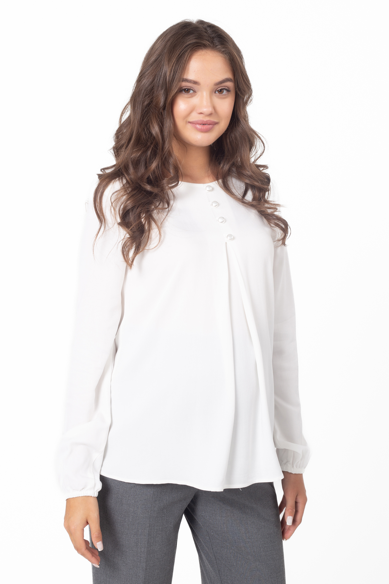 Классическая женская блузка для беременных выполнена из шелковистой вискозы. Легкая струящаяся ткань приятна к телу, не мнется и не вытягивается. Крой модели прямой, свободный, со встречной складной на животе и по спинке. Рубашка хорошо сидит по фигуре на любом месяце беременности и даже после родов. Рукава длинные, с манжетами, на груди декоративная застежка с жемчужными пуговицами, вырез горловины круглый. Стильная блуза гармонично сочетается с деловыми брюками и юбками, casualджинсами, разной обувью, дополняется аксессуарами. Такая рубашка подойдет для офисного делового образа, выхода в свет или как модный look будущей мамы на каждый день.