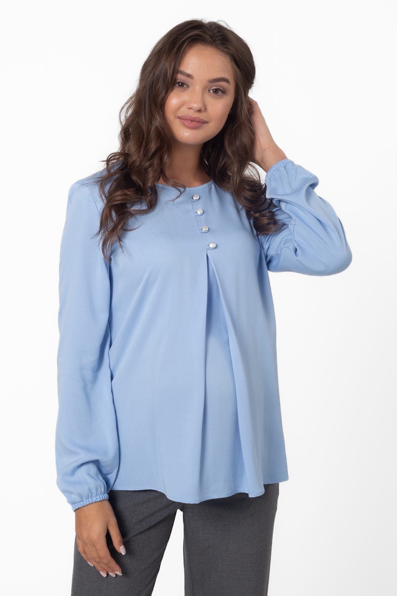 Классическая женская блузка для беременных выполнена из шелковистой вискозы. Легкая струящаяся ткань приятна к телу, не мнется и не вытягивается. Крой модели прямой, свободный, со встречной складной на животе и по спинке. Рубашка хорошо сидит по фигуре на любом месяце беременности и даже после родов. Рукава длинные, с манжетами, на груди декоративная застежка с жемчужными пуговицами, вырез горловины круглый. Стильная блуза гармонично сочетается с деловыми брюками и юбками, casualджинсами, разной обувью, дополняется аксессуарами. Такая рубашка подойдет для офисного делового образа, выхода в свет или как модный look будущей мамы на каждый день.
