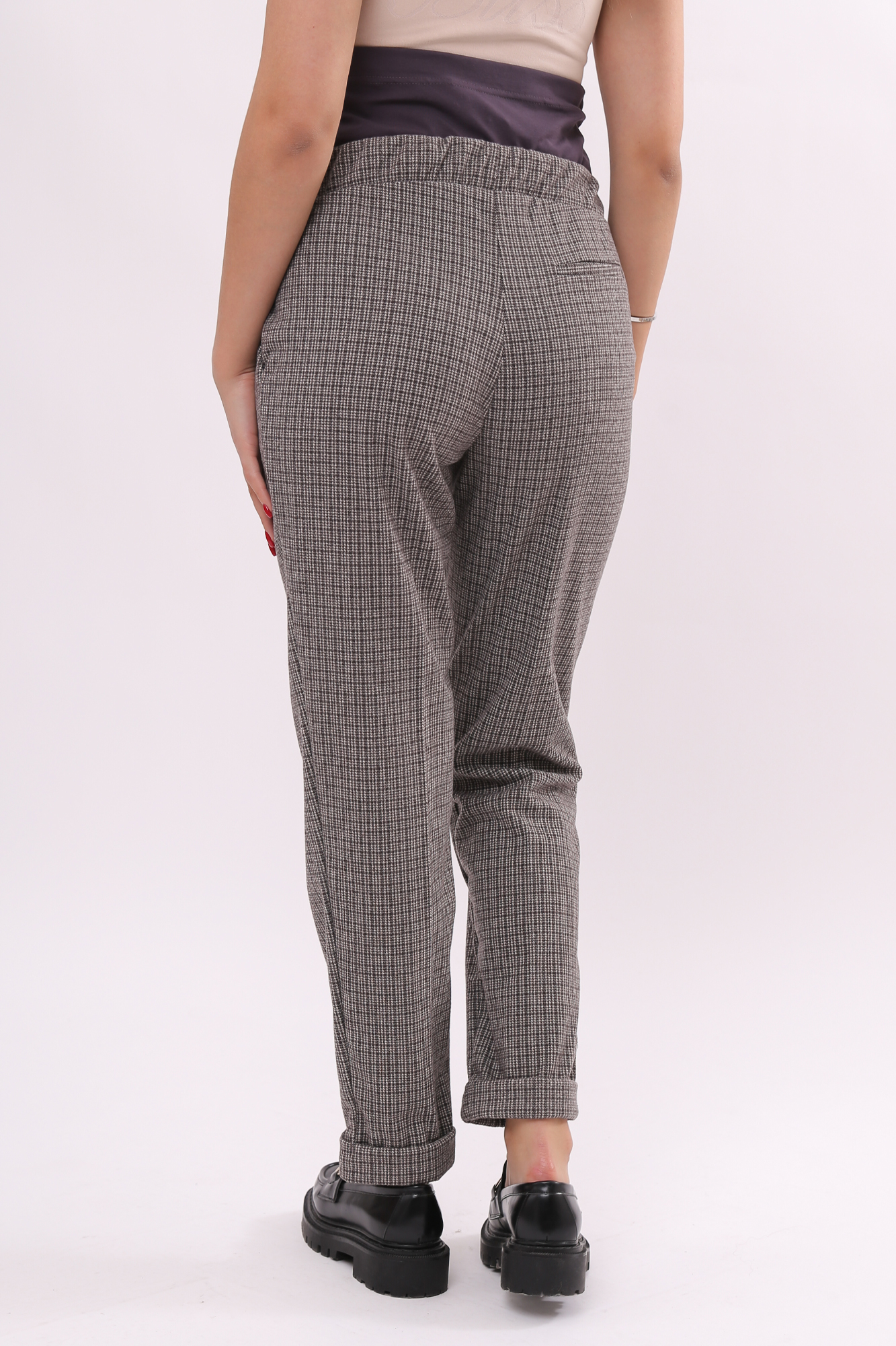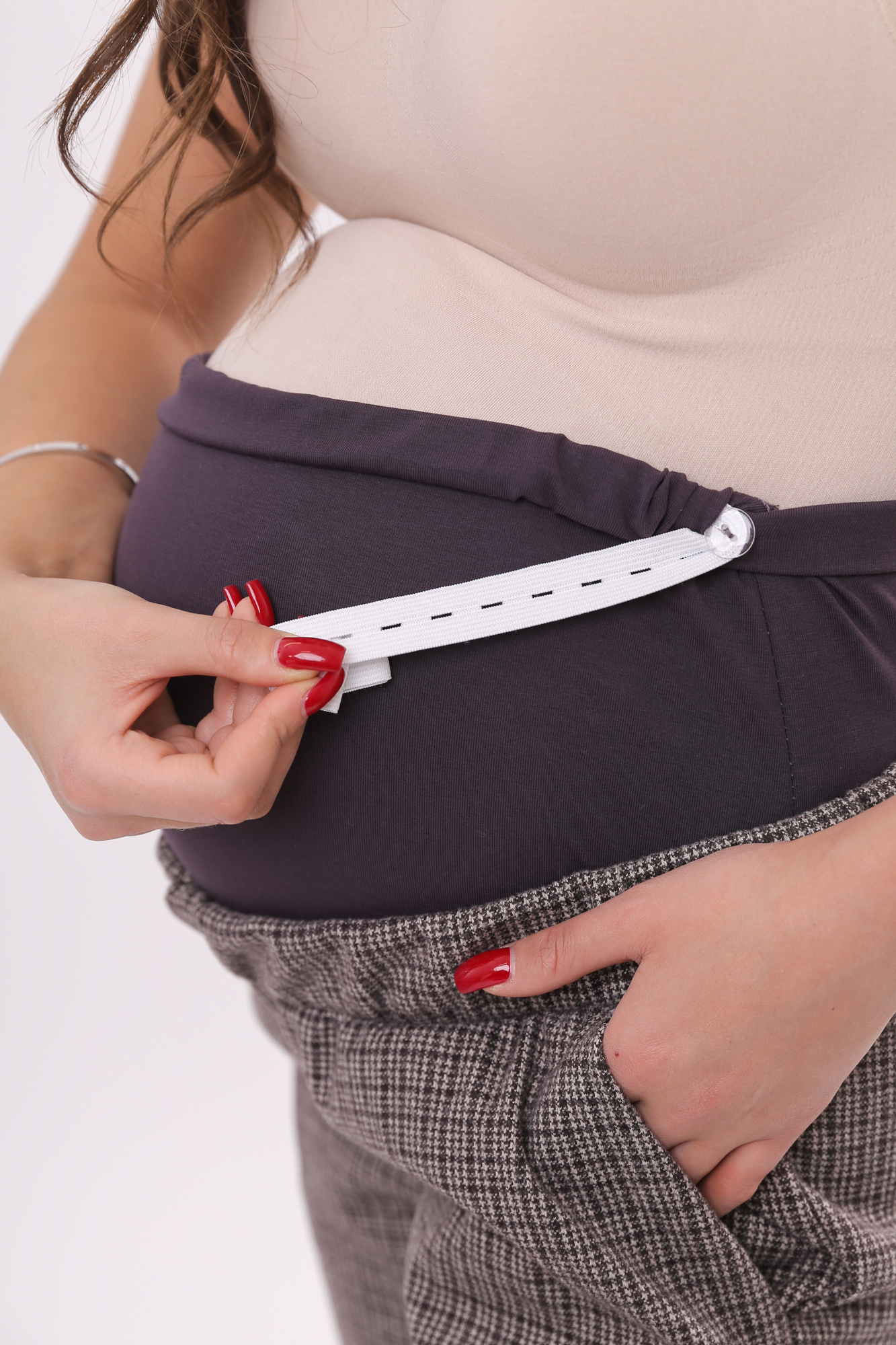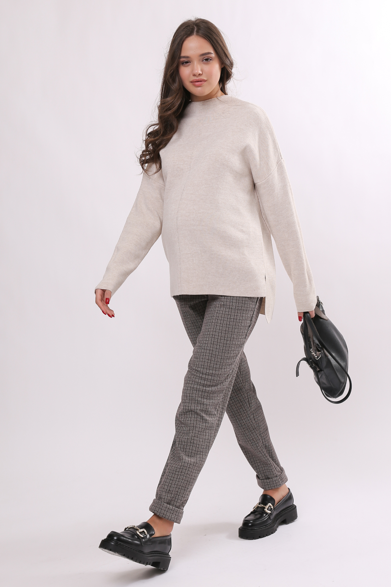 Плотные классические брюки для беременных. Детали: высокий эластичный бандаж, скошенные боковые карманы. Объем регулируется с помощью перфорированной резинки, перестегивающейся на пуговицу, продетой в пояс изделия. В зависимости от подобранных дополнений они могут стать частью и офисного костюма, и одежды для непринуждённого отдыха, и наряда для торжественного события.