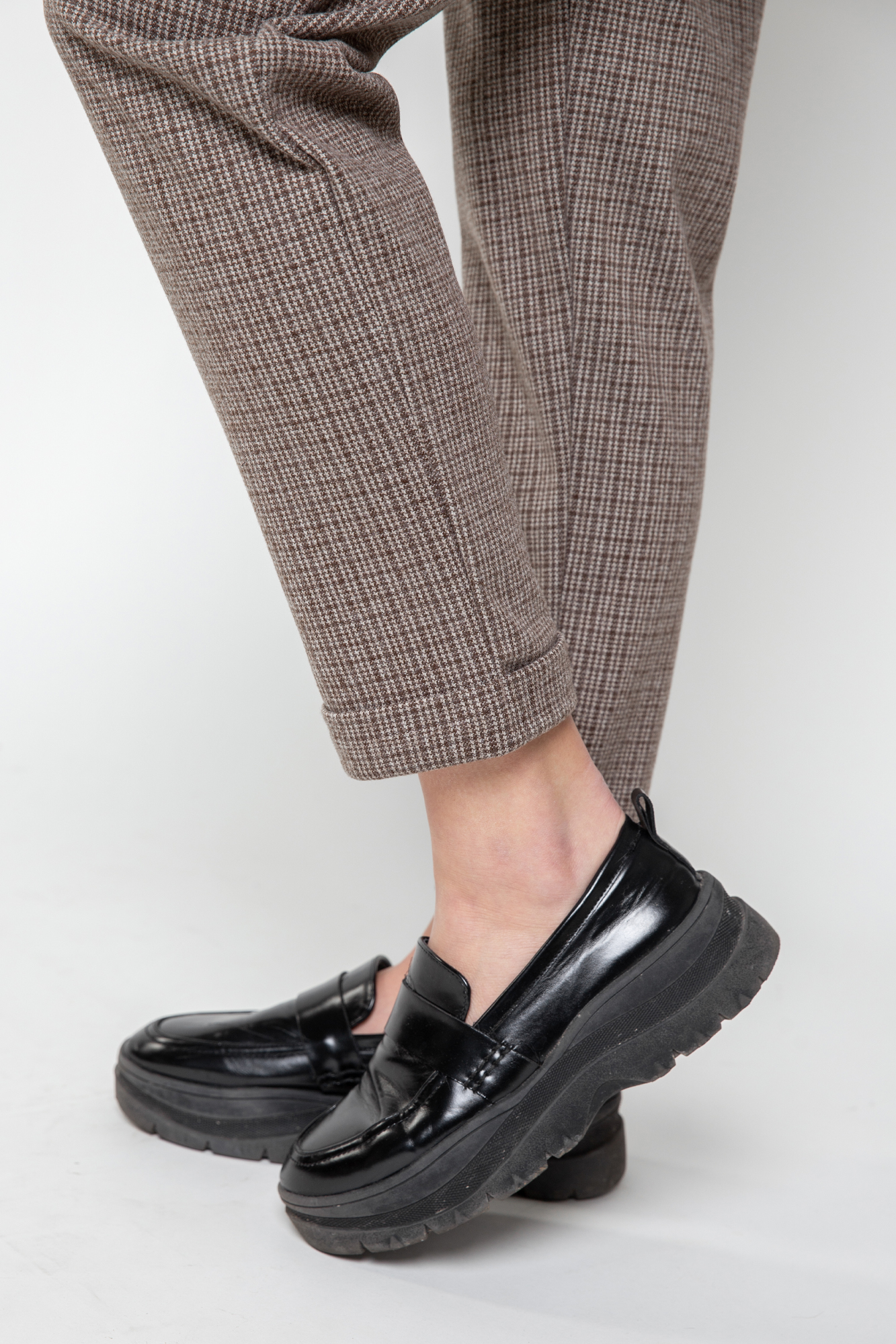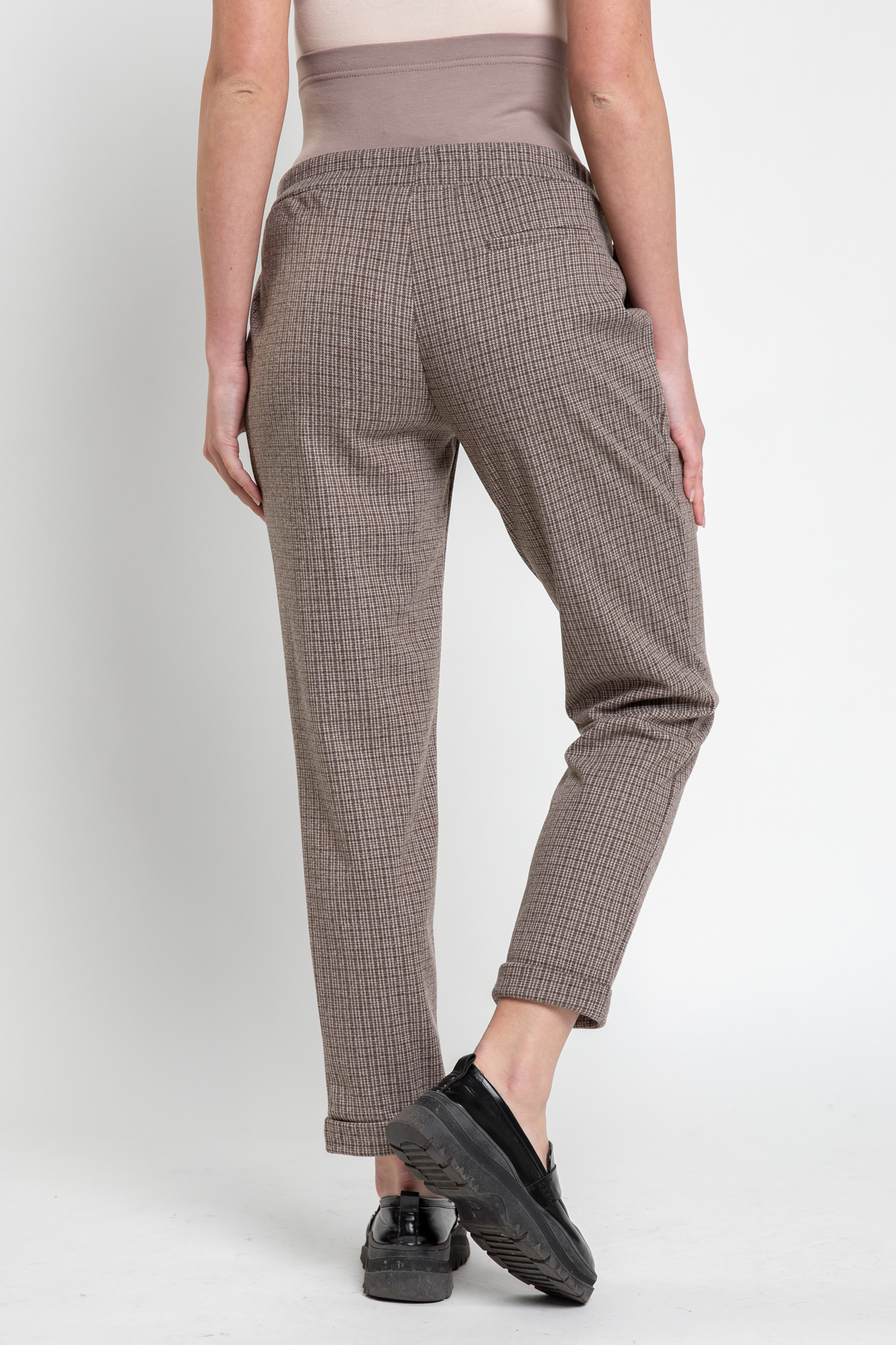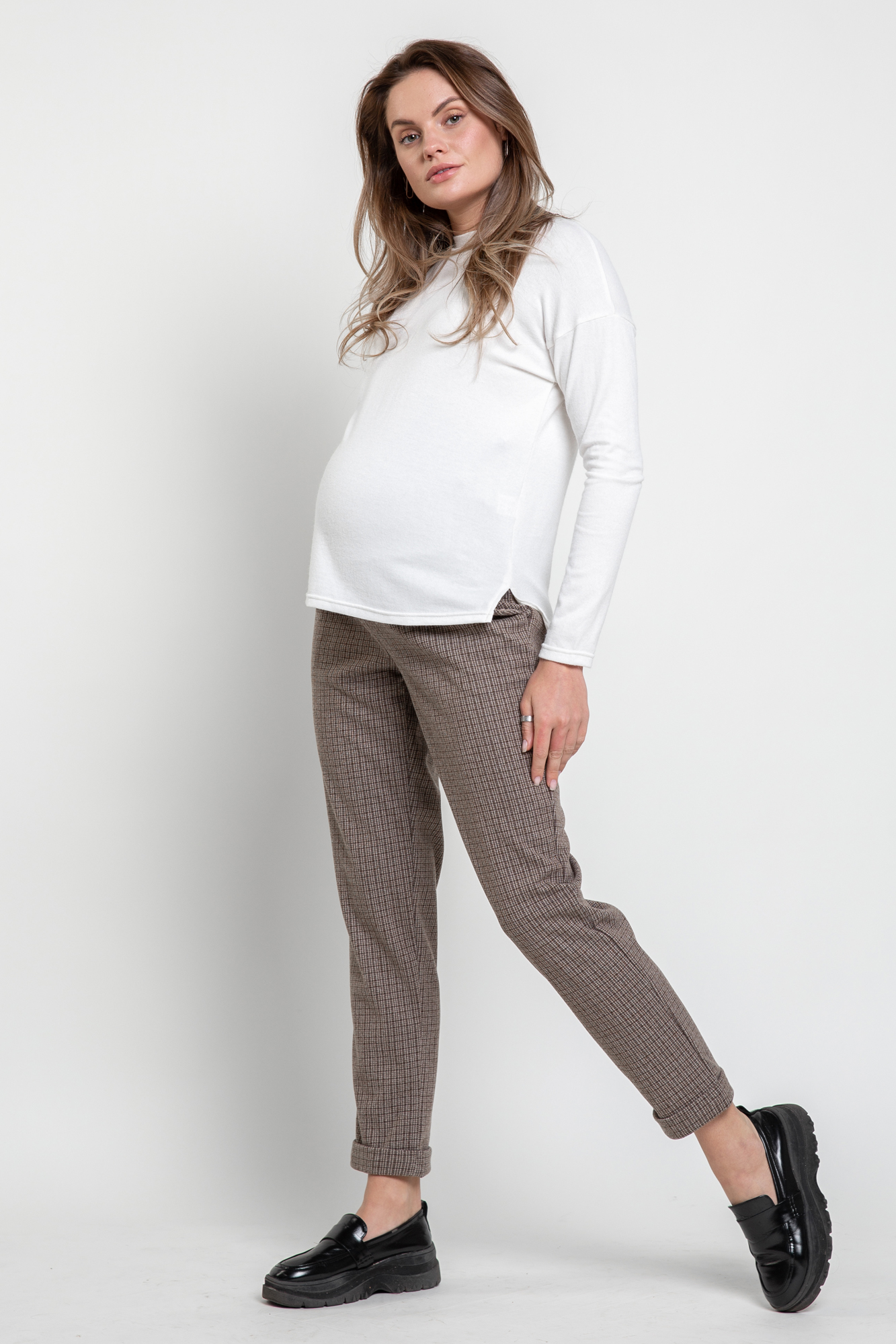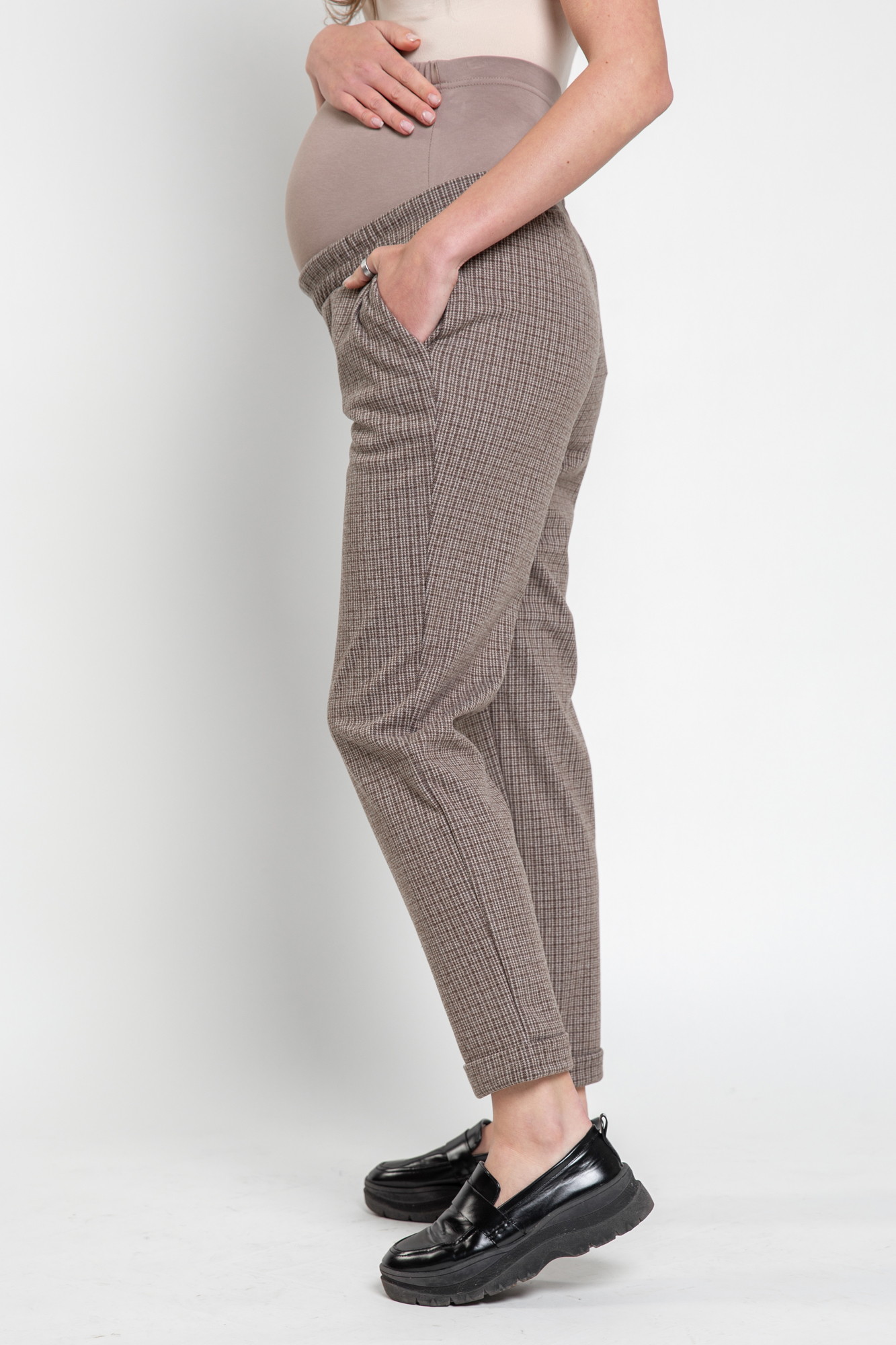 Плотные классические брюки для беременных. Детали: высокий эластичный бандаж, скошенные боковые карманы. Объем регулируется с помощью перфорированной резинки, перестегивающейся на пуговицу, продетой в пояс изделия. В зависимости от подобранных дополнений они могут стать частью и офисного костюма, и одежды для непринуждённого отдыха, и наряда для торжественного события.