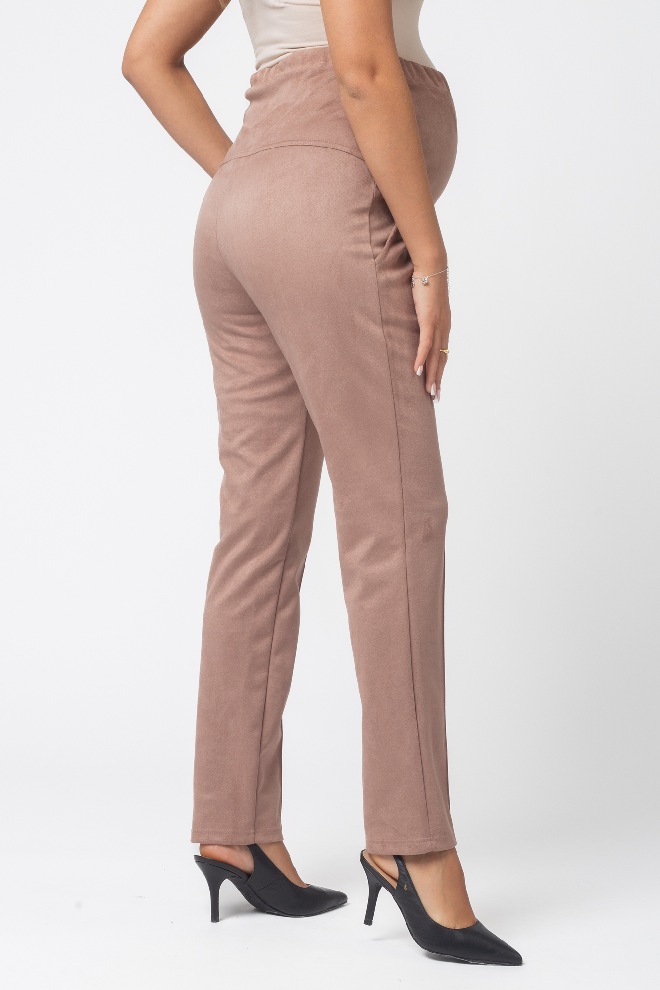 Зауженные брюки для беременных - стильная модель для повседневного гардероба будущей мамы. Сшиты из премиальной искусственной замши. Женские брюки с высокой посадкой оснащены поясом, выполняющим функцию бандажа. Пояс можно регулировать по мере роста животика с помощью скрытой резинки на пуговице. Крой брюк зауженный, спереди - эффектные отстроченные стрелки. Штаны подойдут беременным женщинам на любом сроке - для ношения в офис и на каждый день. Они легко сочетаются с другими вещами женщины: футболками и рубашками, толстовками и жакетами. Модель предлагается в трех базовых однотонных расцветках.