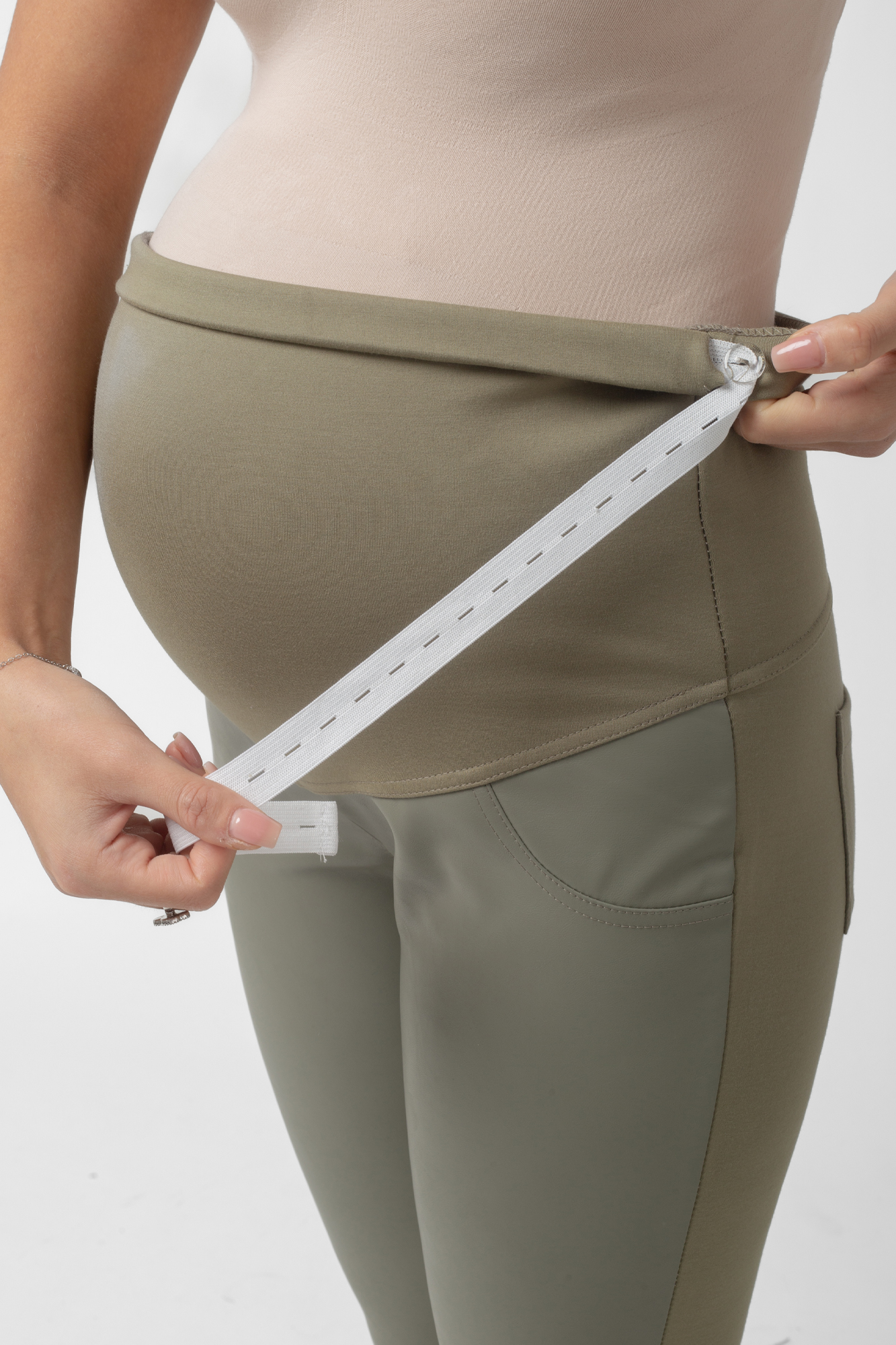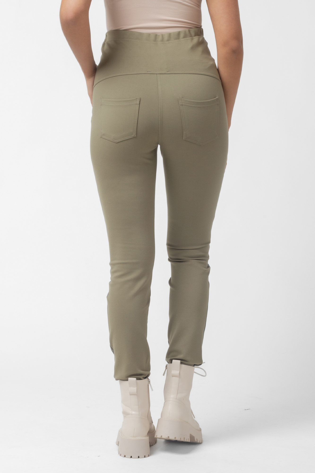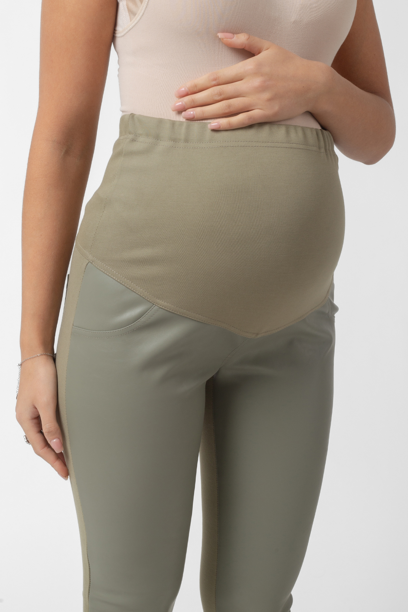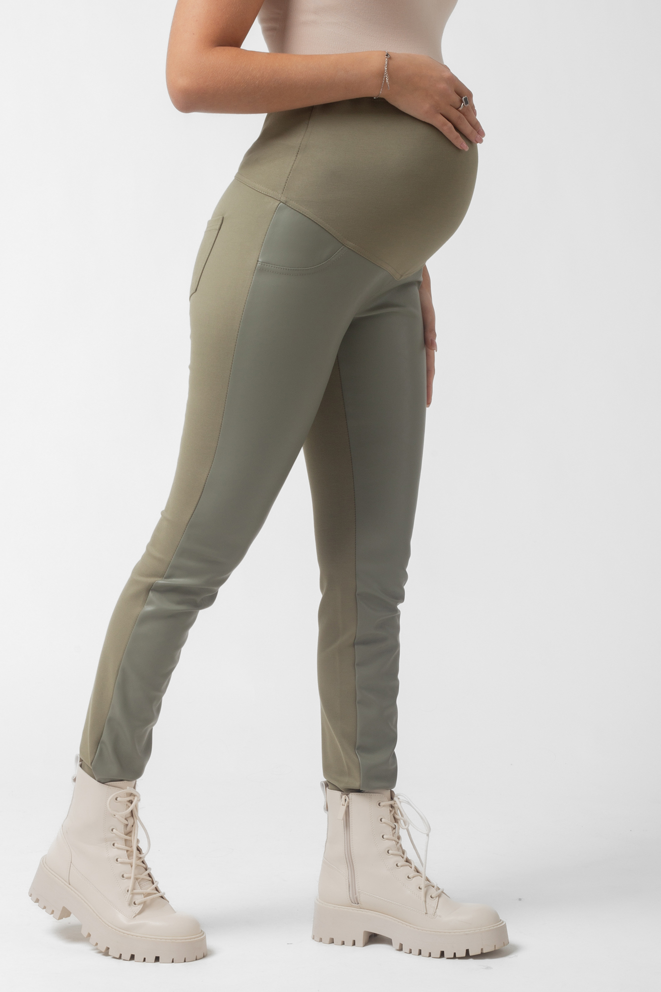 Ультрамодные брюки леггинсы для беременных из комбинированных тканей. Спереди изделие выполнено из экокожи, сзади - из плотного эластичного джерси. На брюках стрейч мягкий высокий трикотажный бандаж со скрытой регулировкой объема, накладные карманы, создающие эффект push up. Идеальная посадка на всем протяжении беременности и после родов. Универсальные штаны могут стать частью спортивного костюма или офисного лука. Базовая модель для спорта, офиса, праздника и просто на каждый день.