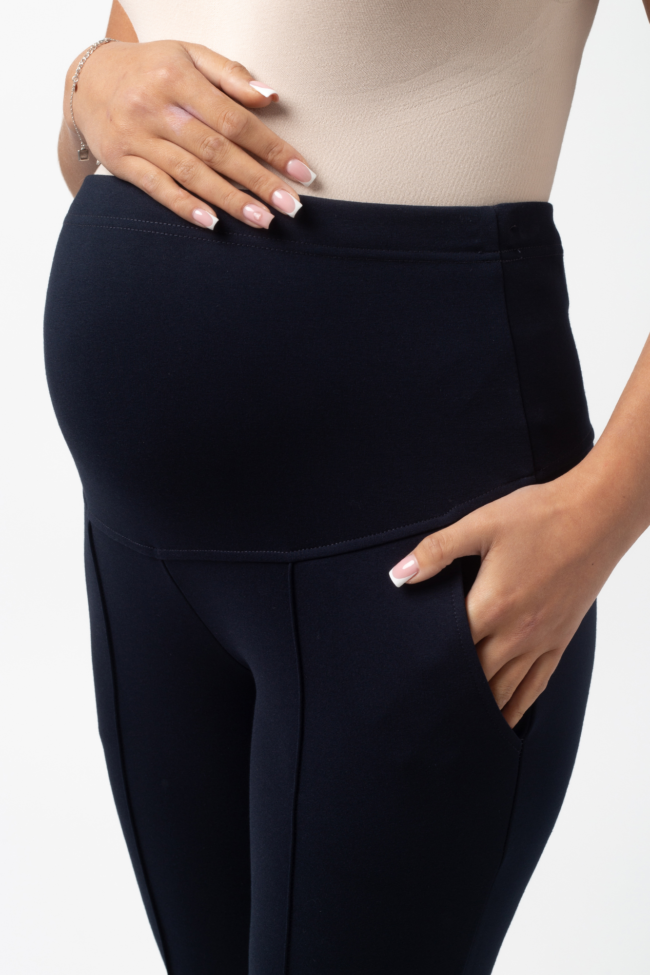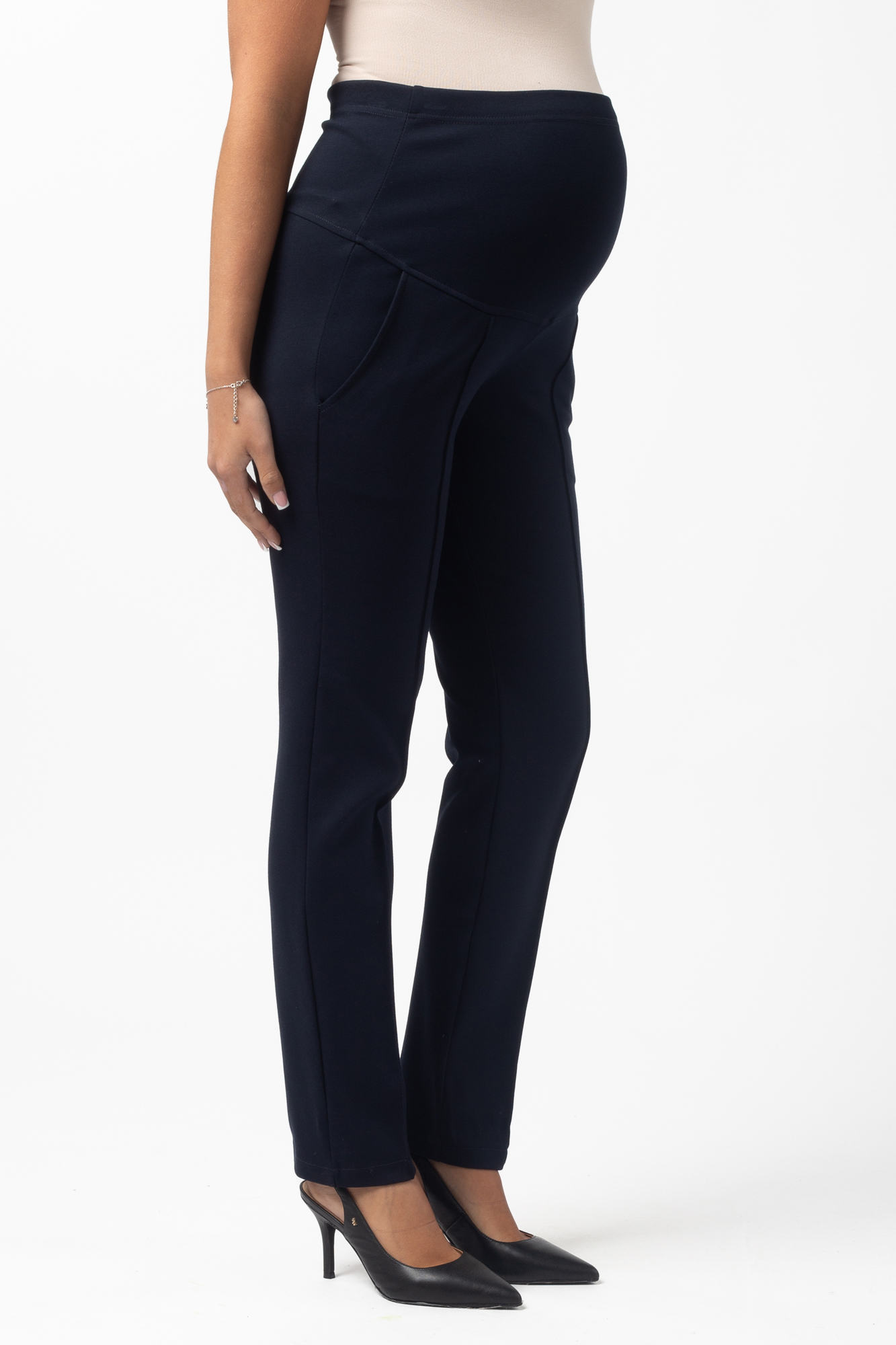 Зауженные брюки для беременных выполнены из плотного джерси. Детали: высокий эластичный бандаж, скошенные боковые карманы, отстроченные стрелки. Объем регулируется с помощью перфорированной резинки, перестегивающейся на пуговицу, продетой в верхнюю часть изделия. Эластичность ткани и регулировка объема обеспечивают идеальную посадку на всем протяжении бременности. В зависимости от подобранных дополнений они могут стать частью и офисного костюма, и одежды для непринуждённого отдыха, и наряда для торжественного события.