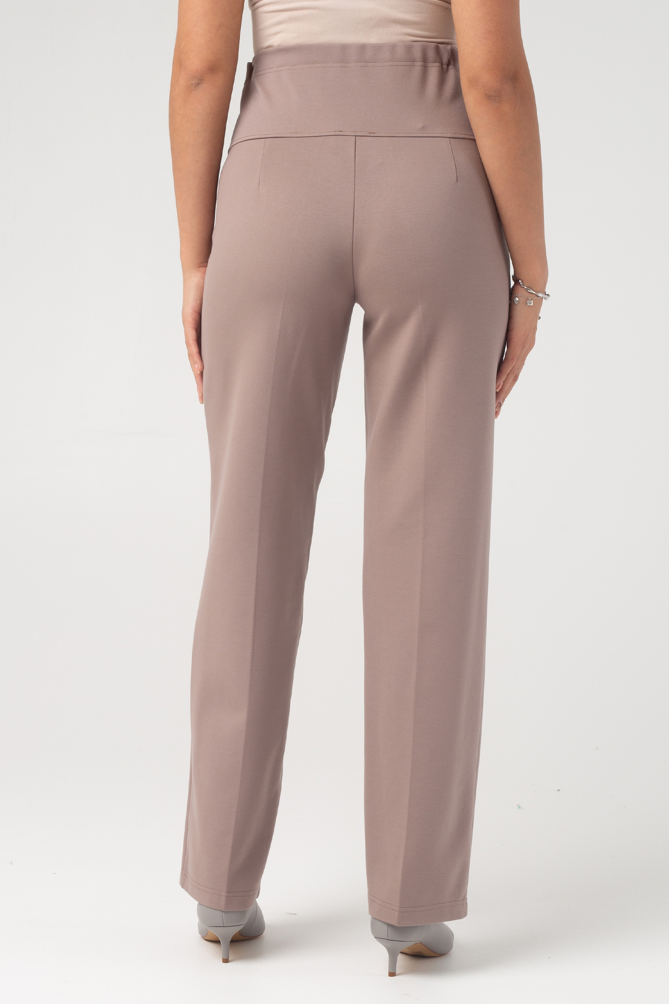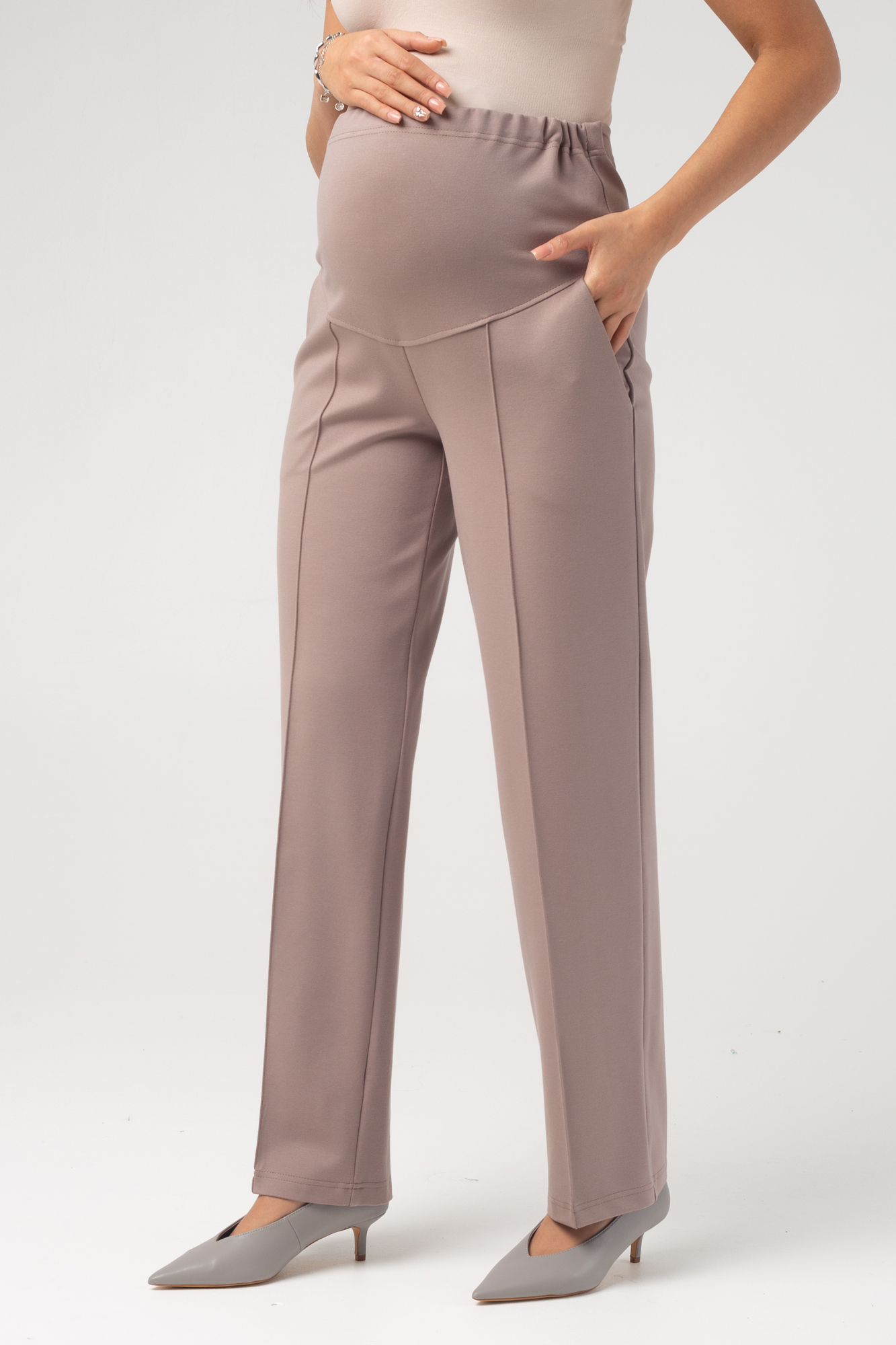 Прямые брюки для беременных выполнены из плотного джерси. Детали: высокий эластичный бандаж, скошенные боковые карманы, отстроченные стрелки. Объем регулируется с помощью перфорированной резинки, перестегивающейся на пуговицу, продетой в верхнюю часть изделия. Эластичность ткани и регулировка объема обеспечивают идеальную посадку на всем протяжении бременности. В зависимости от подобранных дополнений они могут стать частью и офисного костюма, и одежды для непринуждённого отдыха, и наряда для торжественного события.