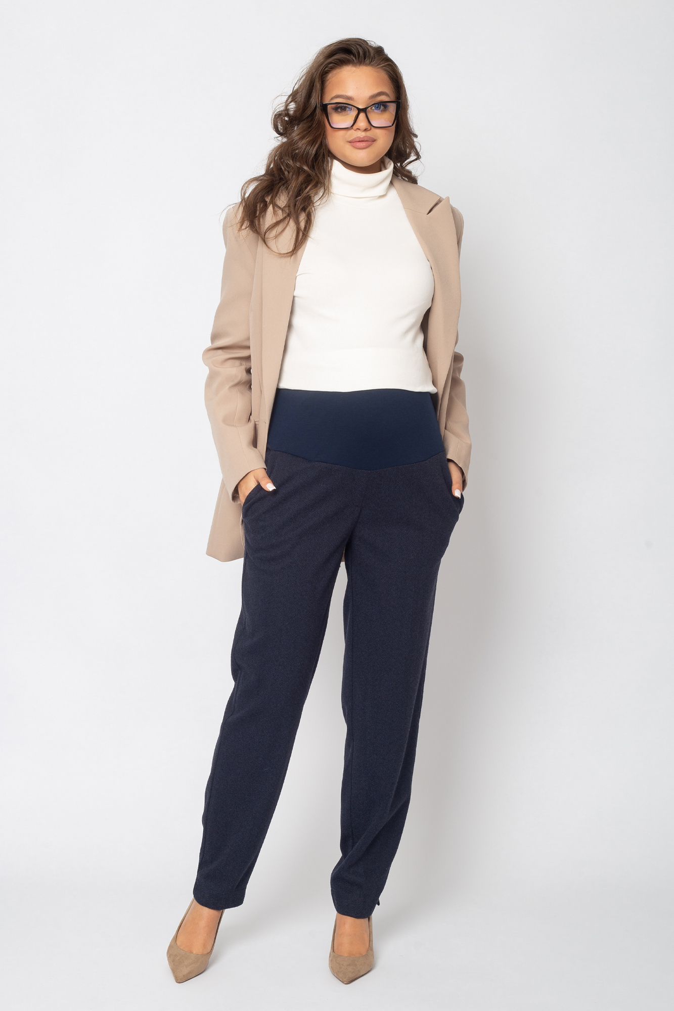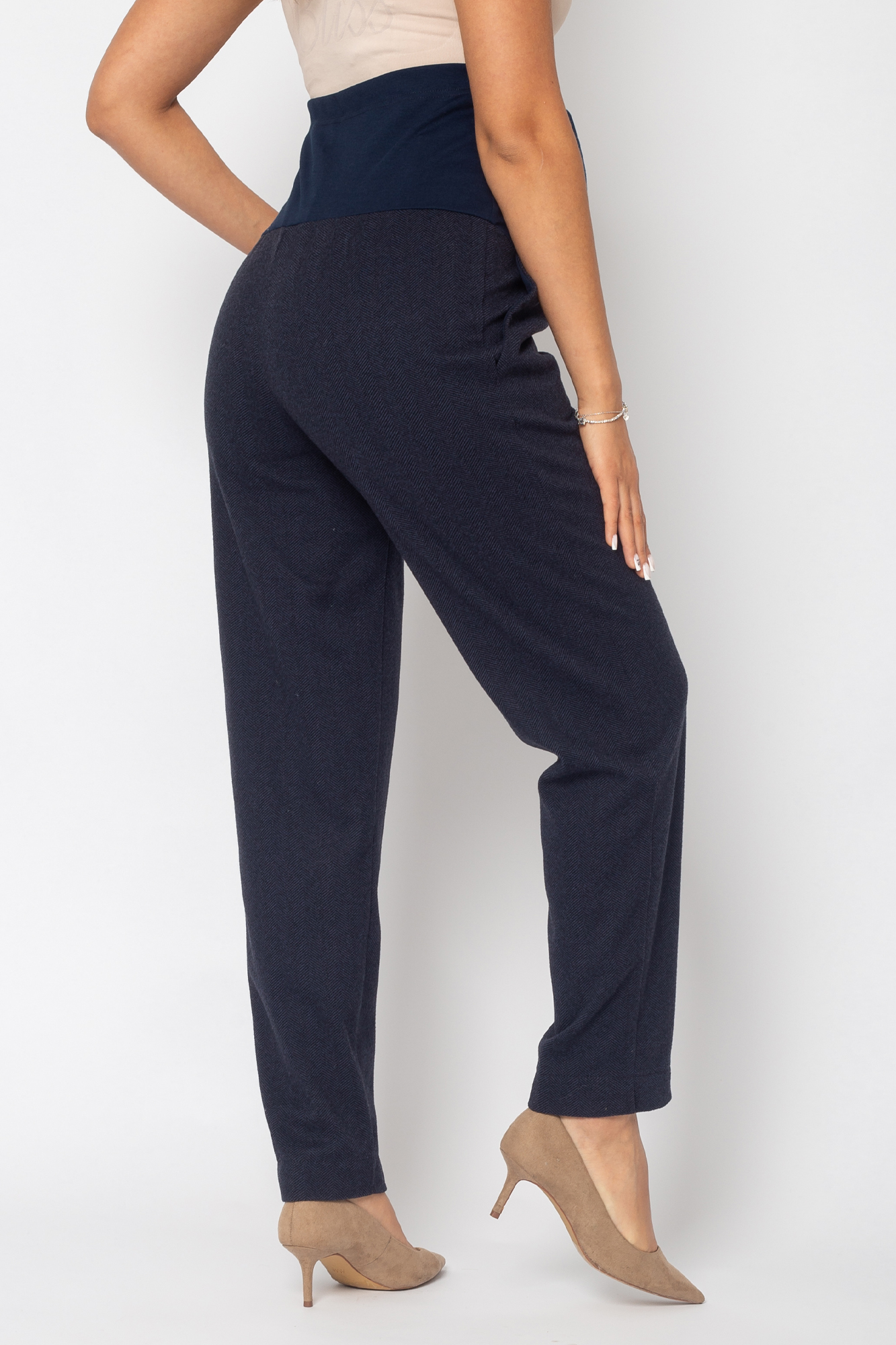 Стильные брюки для беременных - отличный вариант для офисного образа или просто на каждый день. Брюки выполнены из теплого премиального габардина на основе вискозы с добавлением лайкры. Свободный крой брюк-бананов подарит максимум комфорта в носке. Офисная модель с высоким эластичным бандажом подойдет для любого месяца беременности.