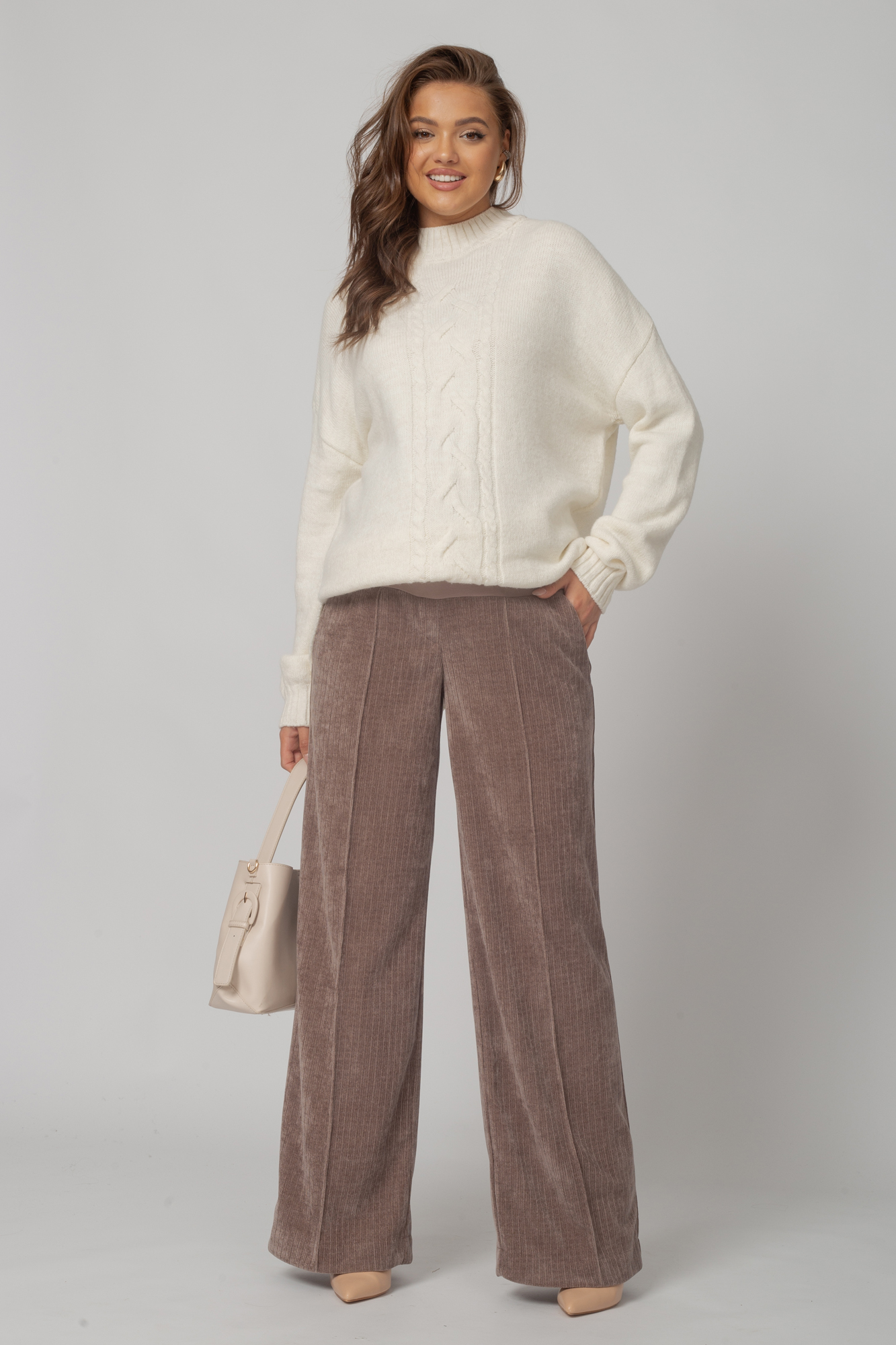 Вельветовые брюки для беременных сшиты из премиального трикотажа джерси-вельвет с выразительной текстурой в рубчик. В составе ткани — вискоза и полиэстер, которые обеспечивают высокую износостойкость, устойчивость к появлению катышек и усадке, а также приятные тактильные ощущения и комфорт в носке.Брюки выполнены в формате классики: прямой силуэт, высокая посадка, элегантная линия брючин. Высокий эластичный пояс с регулировкой объема на резинке обеспечивает идеальную посадку на любом сроке беременности и позволяет носить брюки в течение всей осени, а также в другие сезоны — модель всесезонная и отлично подойдёт на любую погоду.
