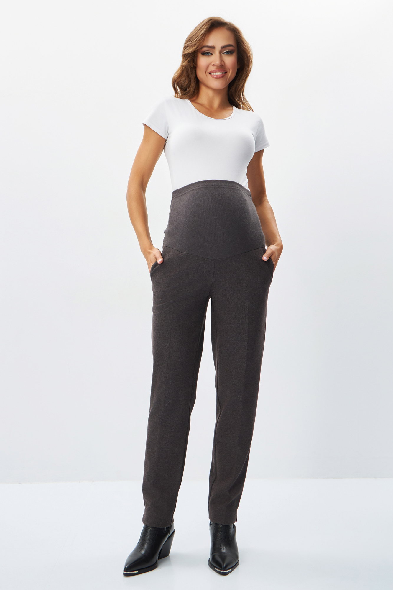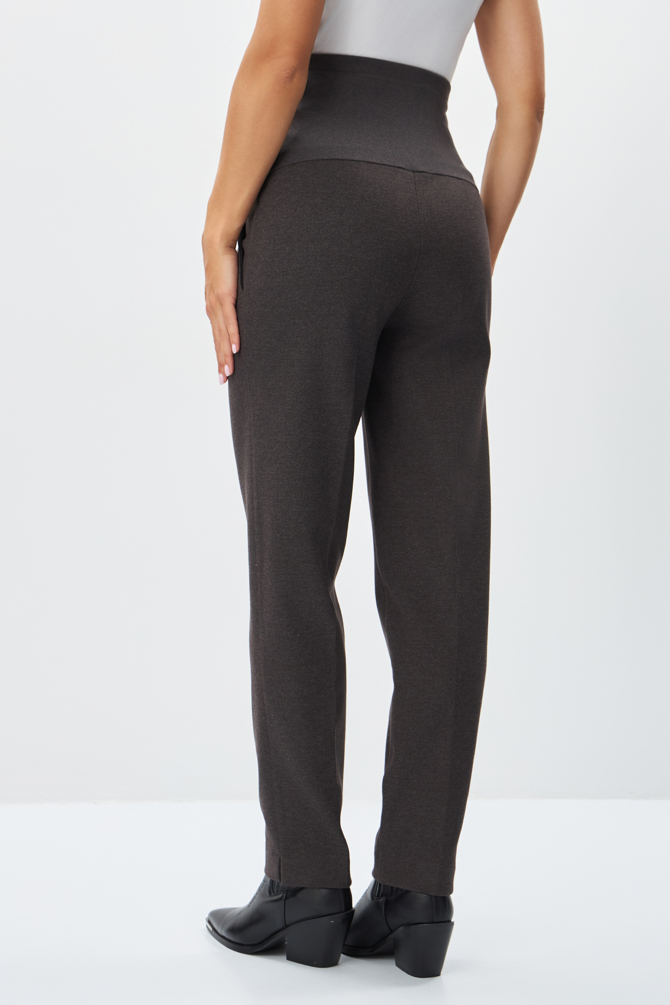 Брюки для беременных сшиты из теплой плотной ткани. Базовые штаны идеально впишутся в повседневный гардероб будущей мамы. Свободный крой брюк подарит максимум комфорта в носке. Офисная модель имеет высокий эластичный бандаж, оснащенный скрытой регулировкой объема, поэтому подходит для любого месяца беременности и после нее. Стильные удобные брюки подойдут на любой сезон, осень или зимний период. Их можно носить в офис или на встречу с подругами.