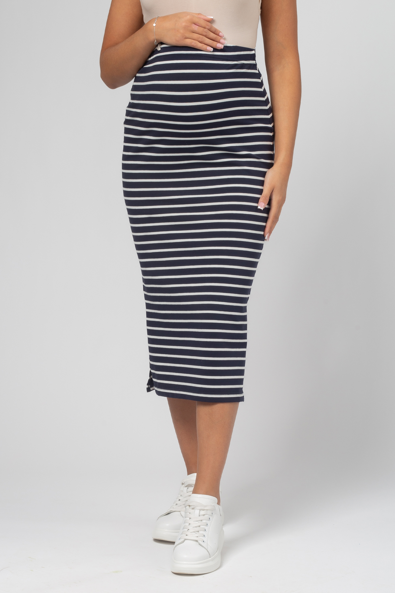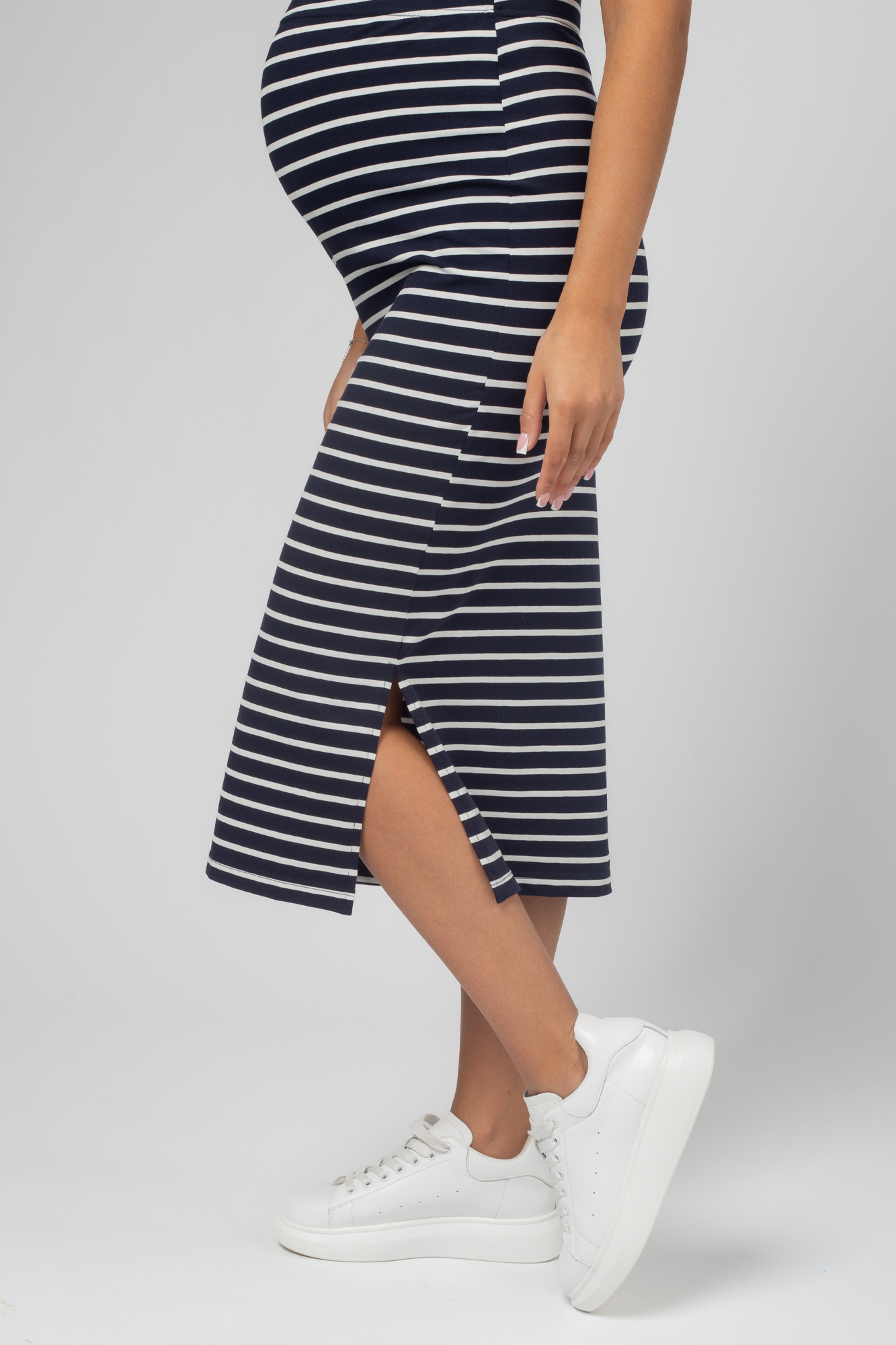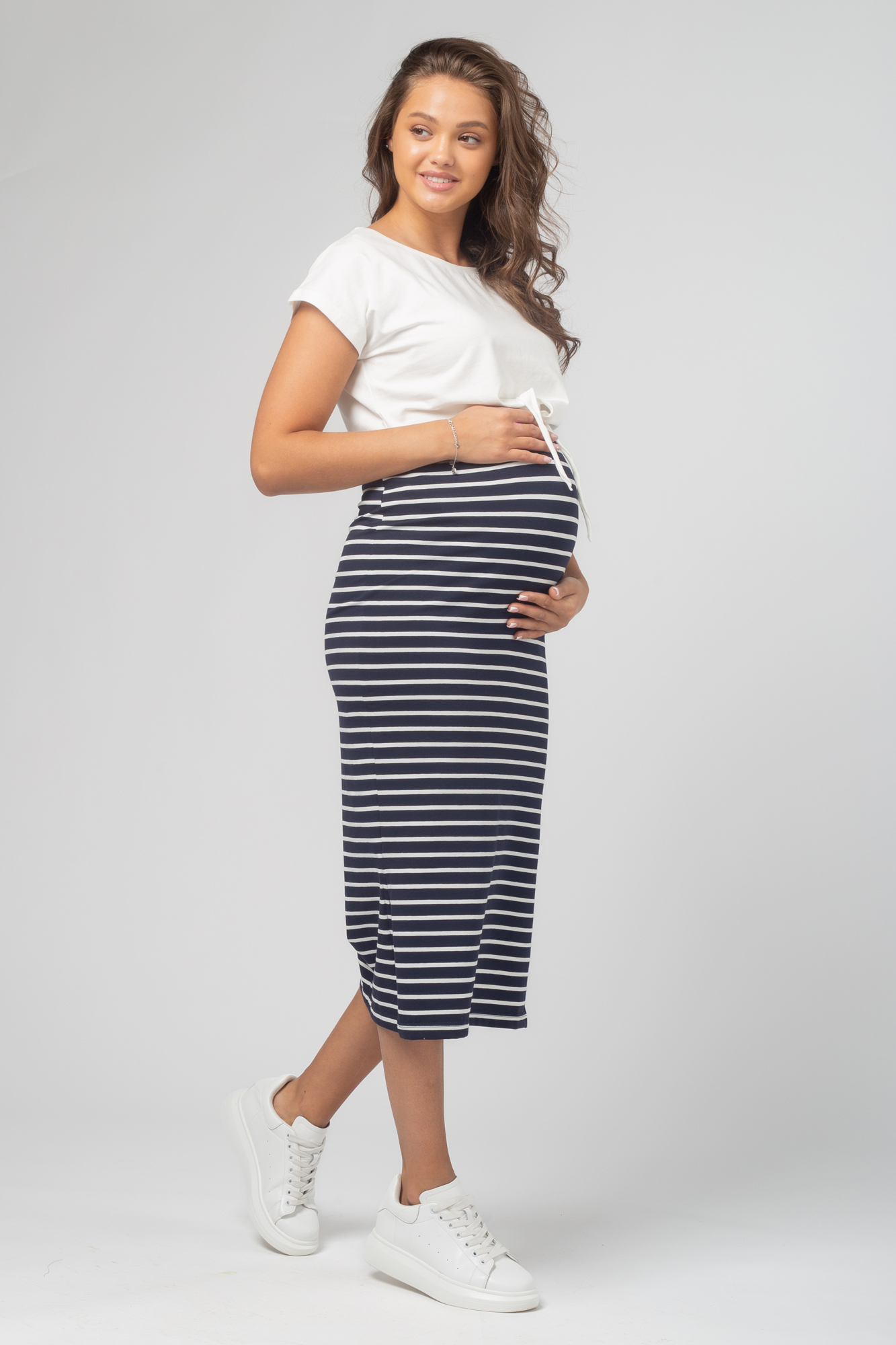 Стильный комплект для беременных состоит из футболки и трикотажной юбки. Футболка-топ с завязками выполнена из хлопка с добавлением эластана. С ним не нарушается кожное дыхание, легко происходит впитывание и испарение влаги. В такой одежде вы будете чувствовать себя комфортно и легко. Особый крой позволяет носить изделие на всем протяжении беременности. Эластичная юбка с завышенной талией мягко облегает и не сдавливает живот. Разрезы по бокам изделия обеспечат свободу движений. Футболку и юбку можно носить как вместе, так и сочетать с другими элементами гардероба.