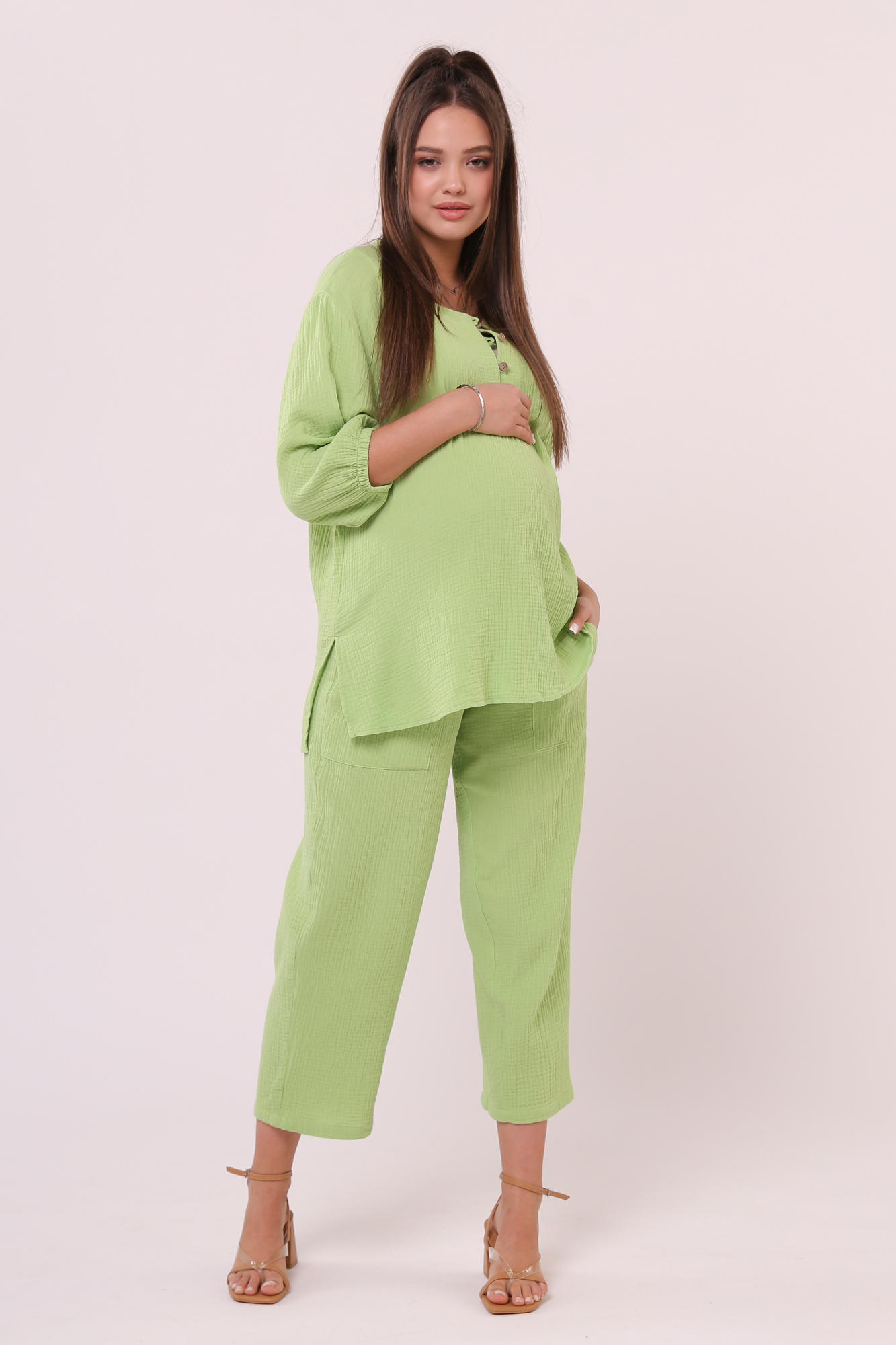 Стильный костюм для беременных из хлопокового муслина идеально подойдет на теплую весну и лето. Фактурная тканьна основе хлопка дышит, не раздражает кожу, легко впитывает влагу. В комплект входит две вещи: блузка с рукавом 3/4 на резинке и брюки кюлоты. Кофта с удлиненной спинкой, небольшими разрезами по бокам, круглой горловиной, украшена пугов. Штаны свободного кроя и укороченной длины оснащены низким поясом с мягкой резинкой и шнуровкой для регулировки объема. Легкий костюм можно носить на любом месяце беременности и после рождения малыша. Летний костюм с широкими укороченными брюками подойдет для повседневной носки, станет удобным нарядом для офиса, встречи с друзьями или на выписку. Костюм в духе oversize выполнен в стандартной размерной линейке и представлен в двух пастельных однотонных расцветках.
