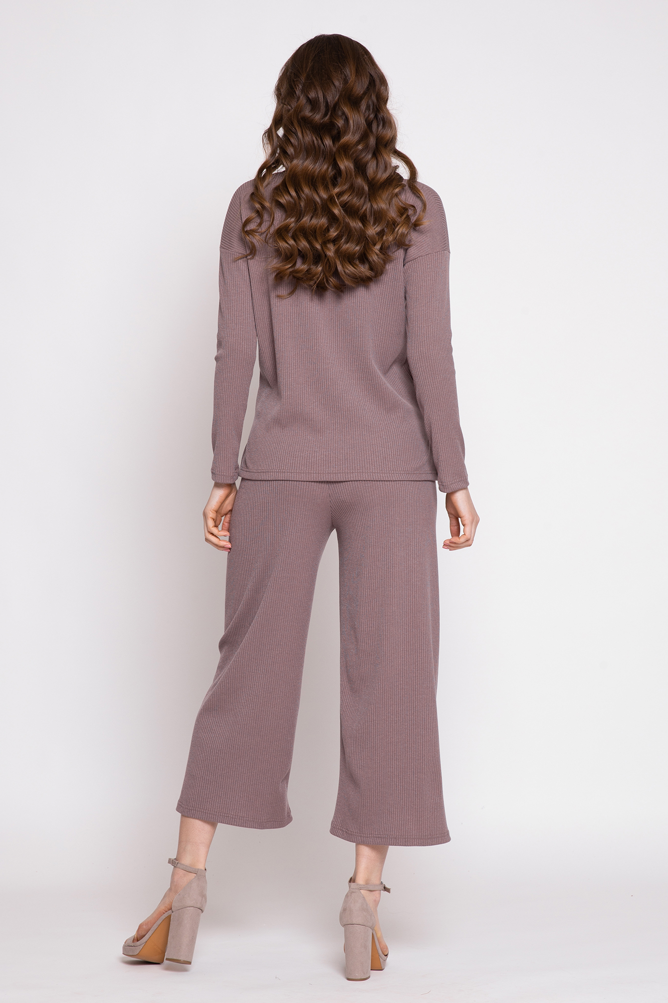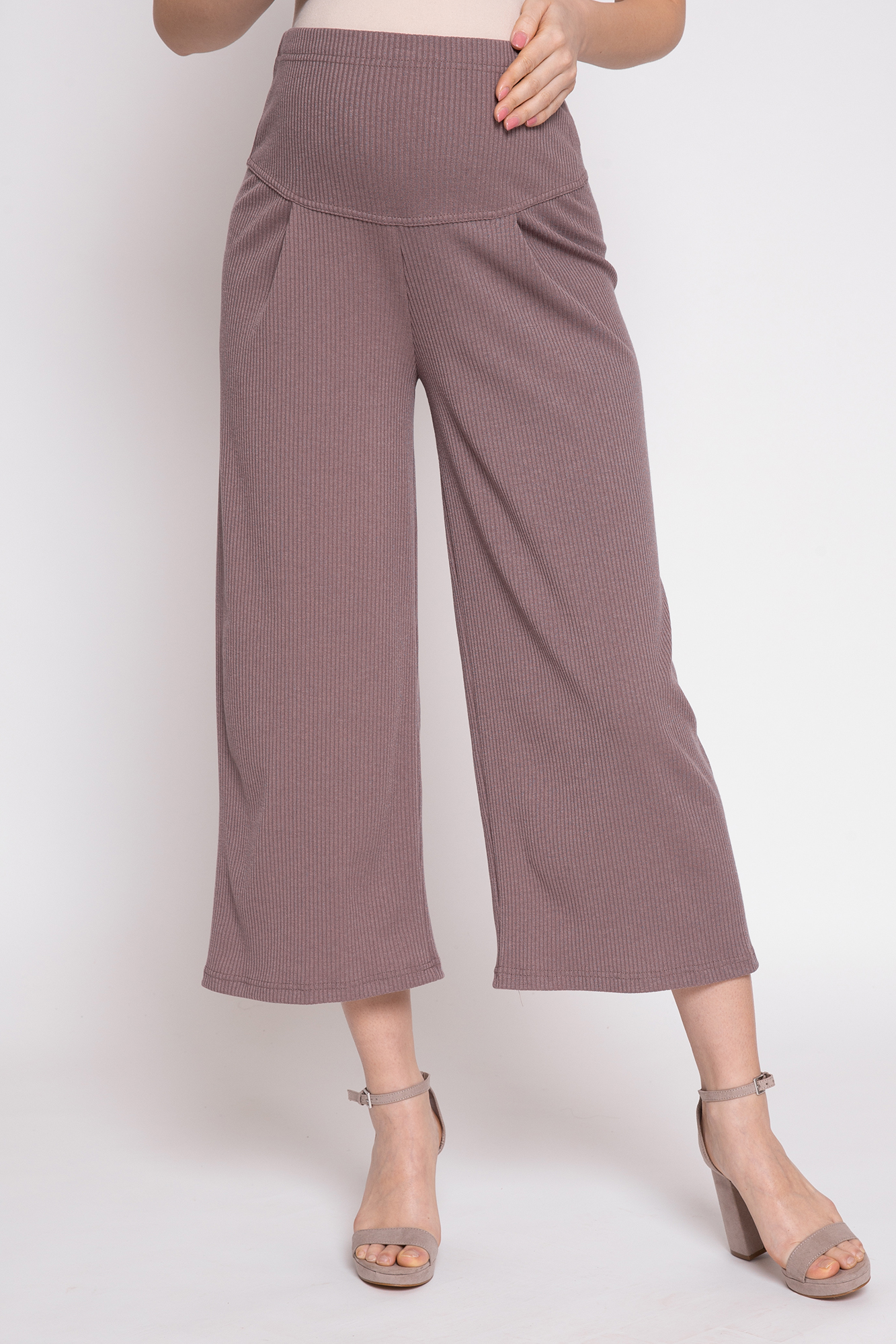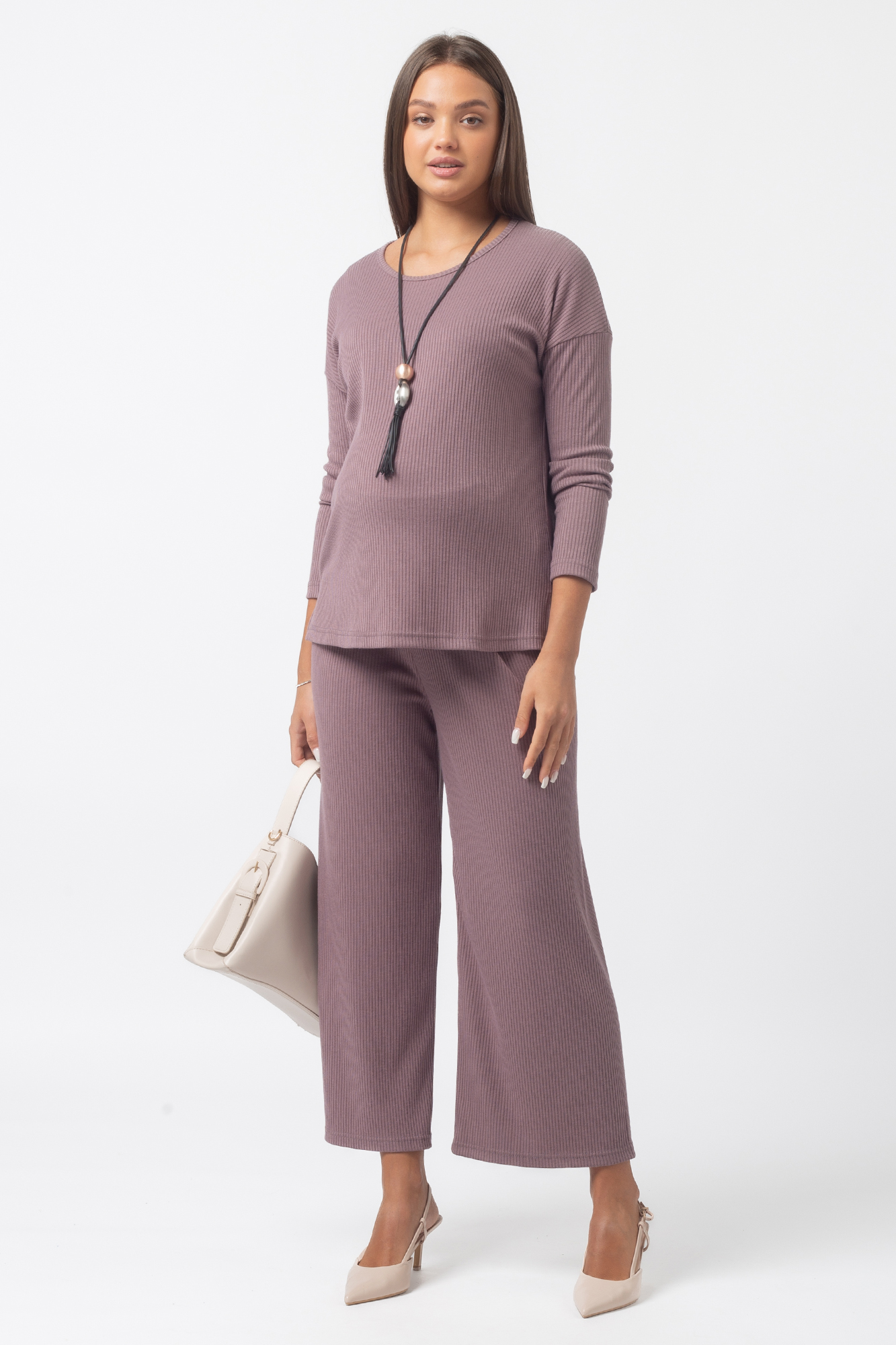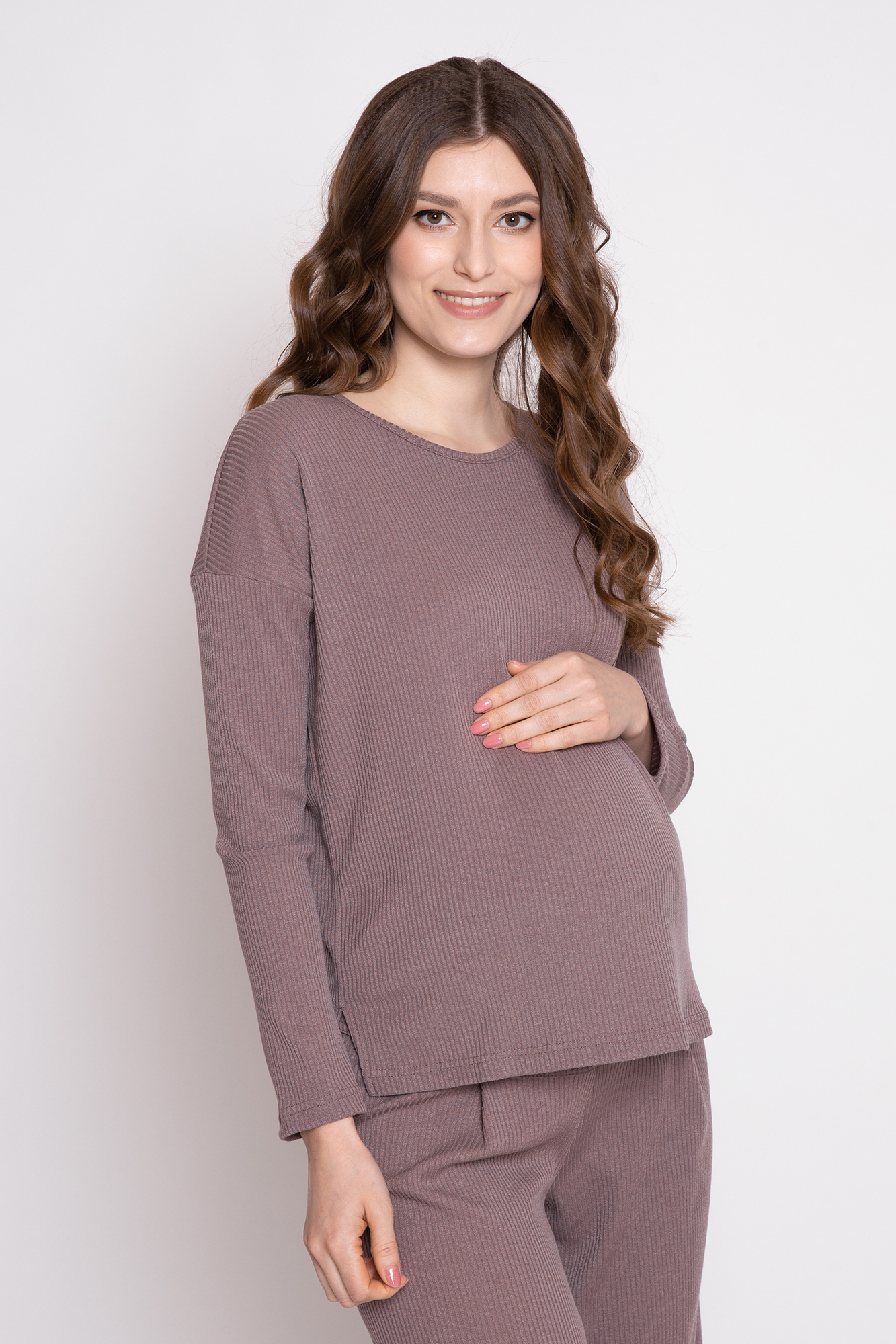 Оригинальный костюм в рубчик для беременных. Костюм состоит из джемпера и брюк. Джемпер с округлым вырезом горловины, длинным рукавом, заниженной линией плеча, разрезами по бокам изделия. Брюки-кюлоты с эластичной высокой вставкой-бандажом рассчитаны на весь период беременности. Идеальное сочетание стиля и комфорта!