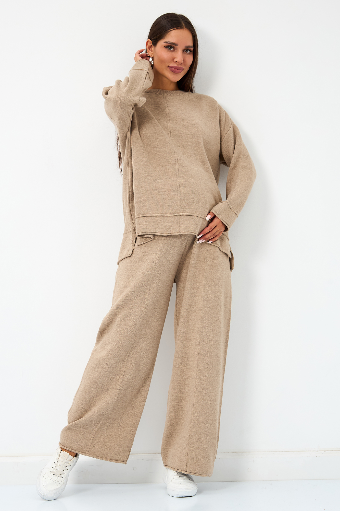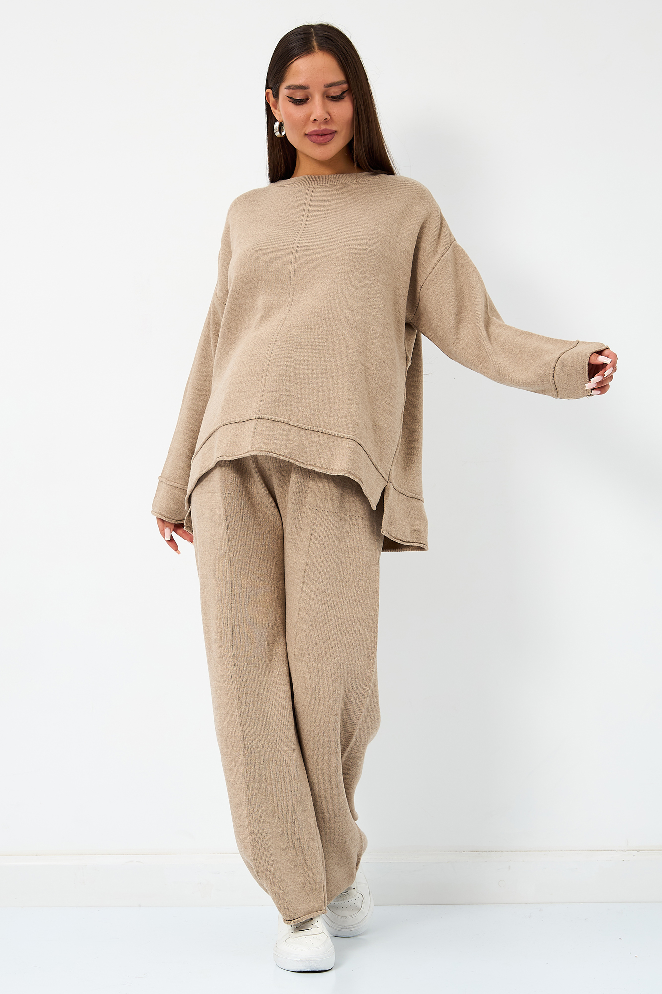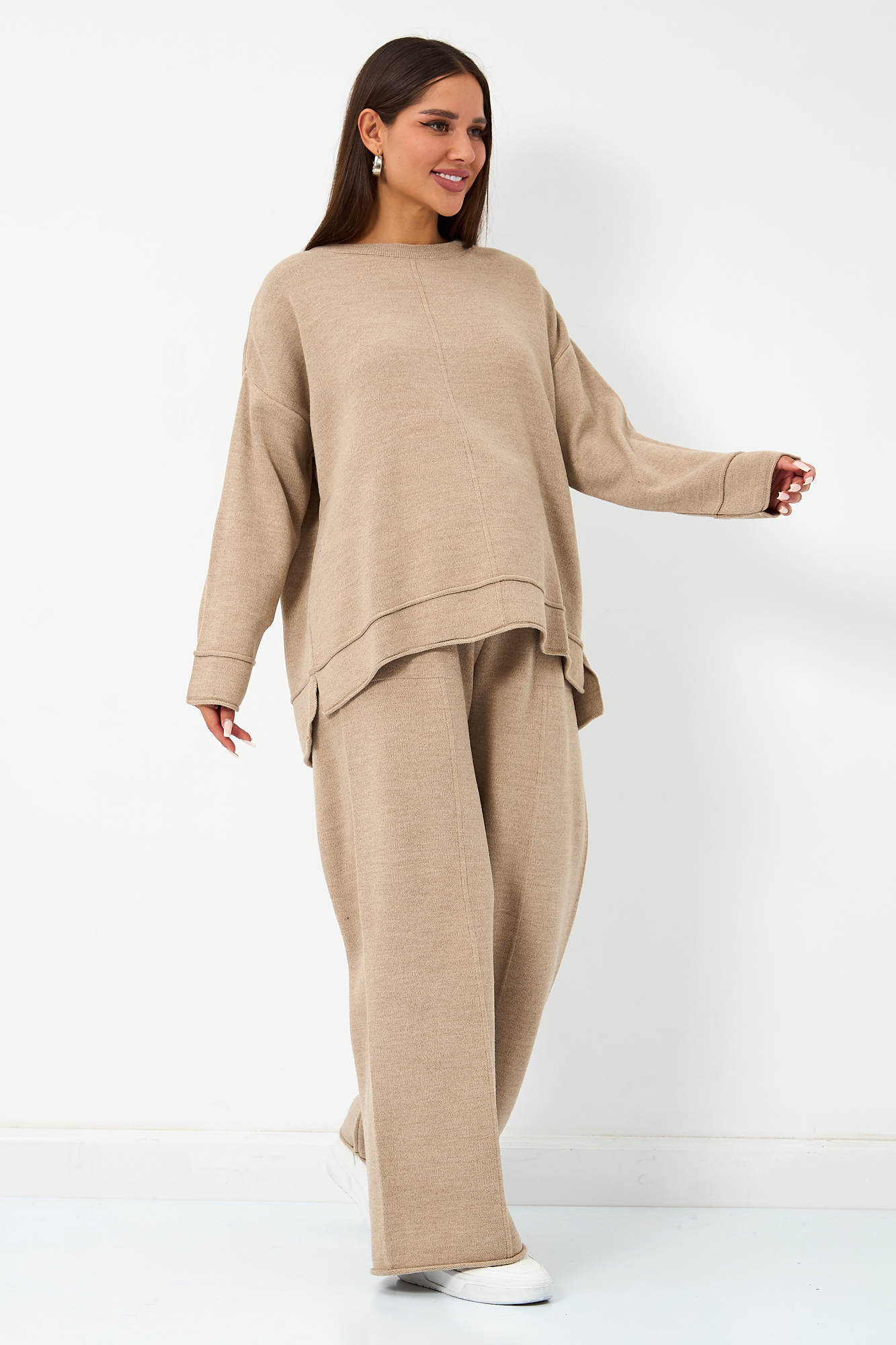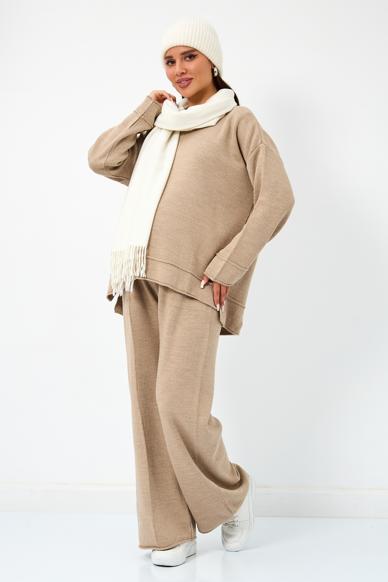 Теплый вязаный костюм для беременных. Модель выполнена из мягкого полотна мелкой вязки с добавлением акрила и шерсти. Костюм состоит из двух вещей. Джемпер прекрасно садится на фигуру будущей мамы, не обтягивая животик. Дополнен декоративными элементами в виде закрученного края и оригинальной вязки. Широкие штаны палаццо оснащены эластичной мягкой резинкой, которая не давит на животик. Брюки дополнены карманами спереди. Данная модель идеально садится на животик с первых месяцев и до последнего. За счет удобной резинки костюм можно будет носить и после рождения малыша. Такой костюм можно носить в офис, на прогулку, на мероприятия. Свободный крой оверсайз обеспечивает комфорт и удобство на протяжении всего срока беременности. Идеальная модель на весну или прохладное лето.
