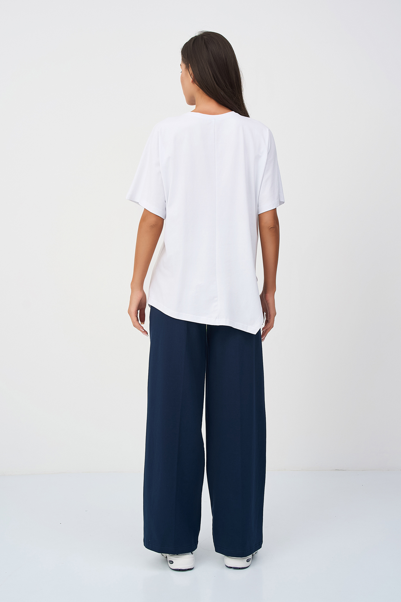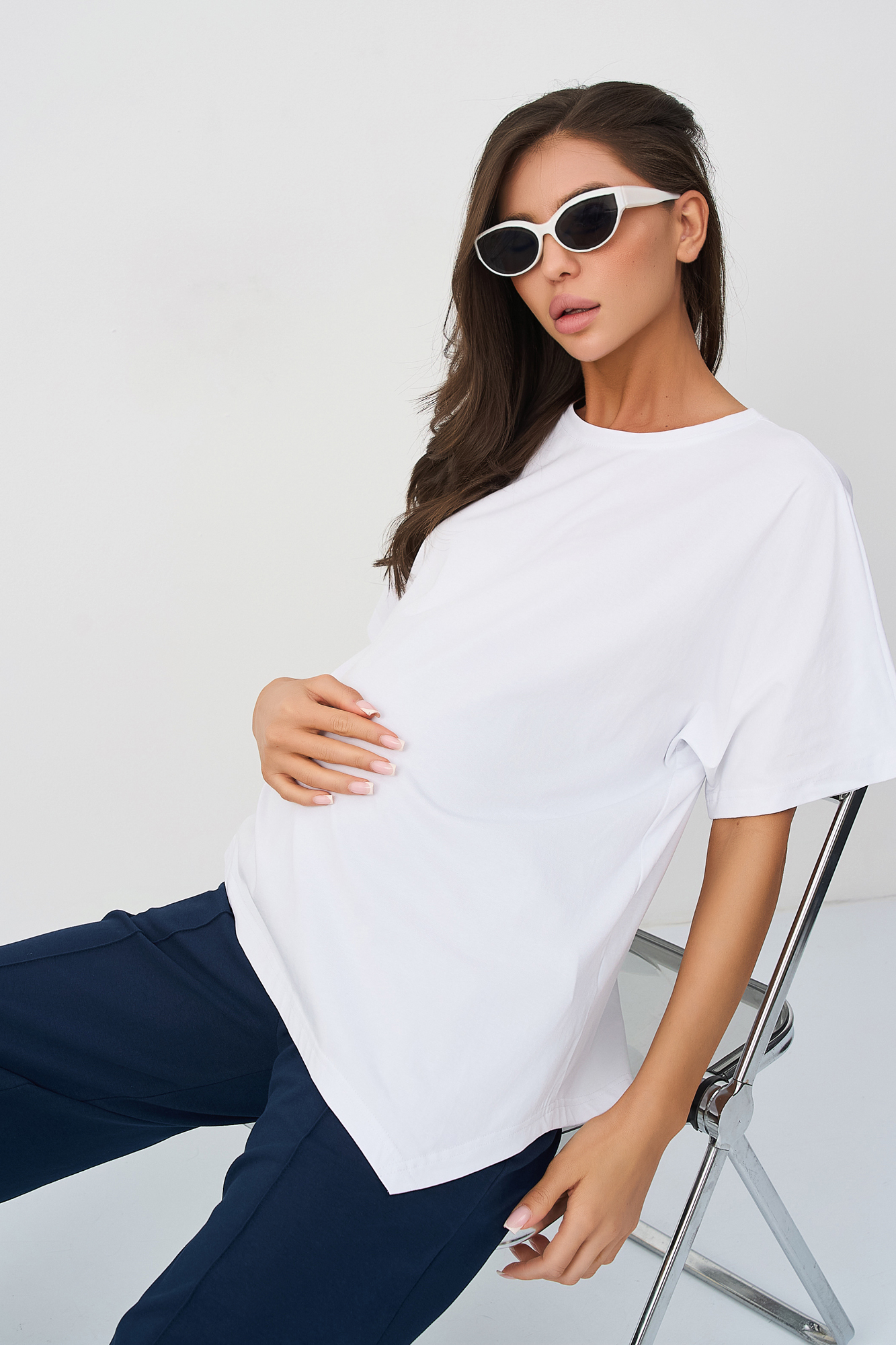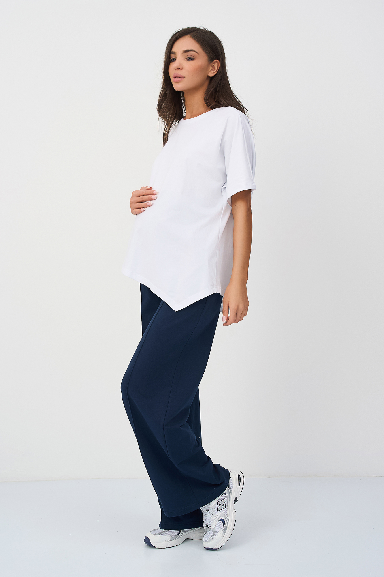 Костюм для беременных сшит из футера на основе натурального хлопка премиум качества. Такой трикотажный костюм станет отличным обновлением летнего гардероба будущей мамы. Небольшое включение эластана в состав ткани делает ее более износостойкой. Футболка из кулирки оверсайз свободного, чуть приталенного кроя и коротким рукавом. Своодные брюки палаццо с высокой посадкой оснащены широким эластичным поясом на резинке, который выполняет роль мягкого бандажа. Высокий пояс дополнен скрытой регулировкой объема на пуговице, который позволяет носить штаны на протяжении всего срока беременности. Фасон брюк классический прямой, крой широкий. Обе вещи в комплекте брючного костюма идеально сочетаются друг с другом, но в то же время достаточно самобытны, чтобы комбинировать их с другими вещами весной и летом. Стильный костюм подходит девушкам и женщинам больших размеров для дома.