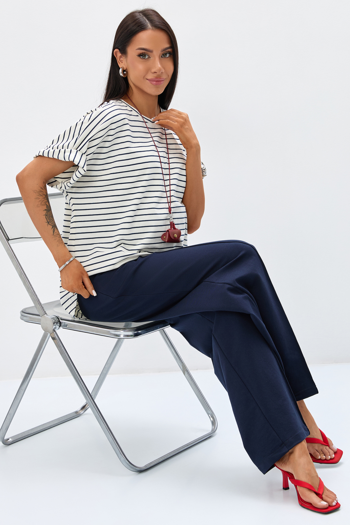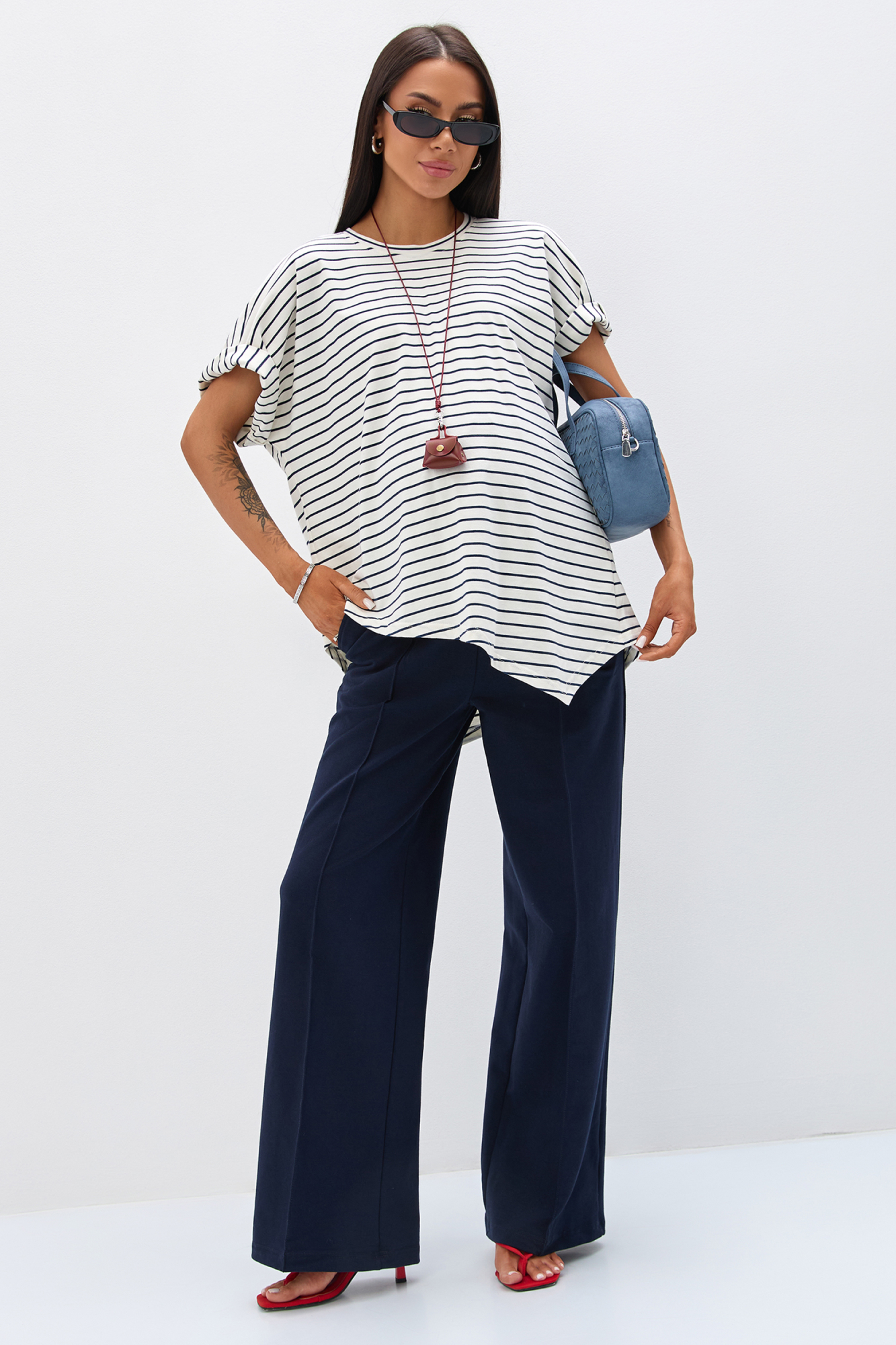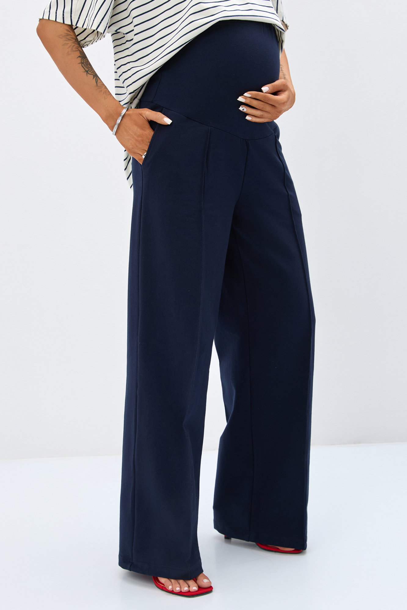 Свободные брюки палаццо с высокой посадкой оснащены широким эластичным поясом на резинке, который выполняет роль мягкого бандажа.