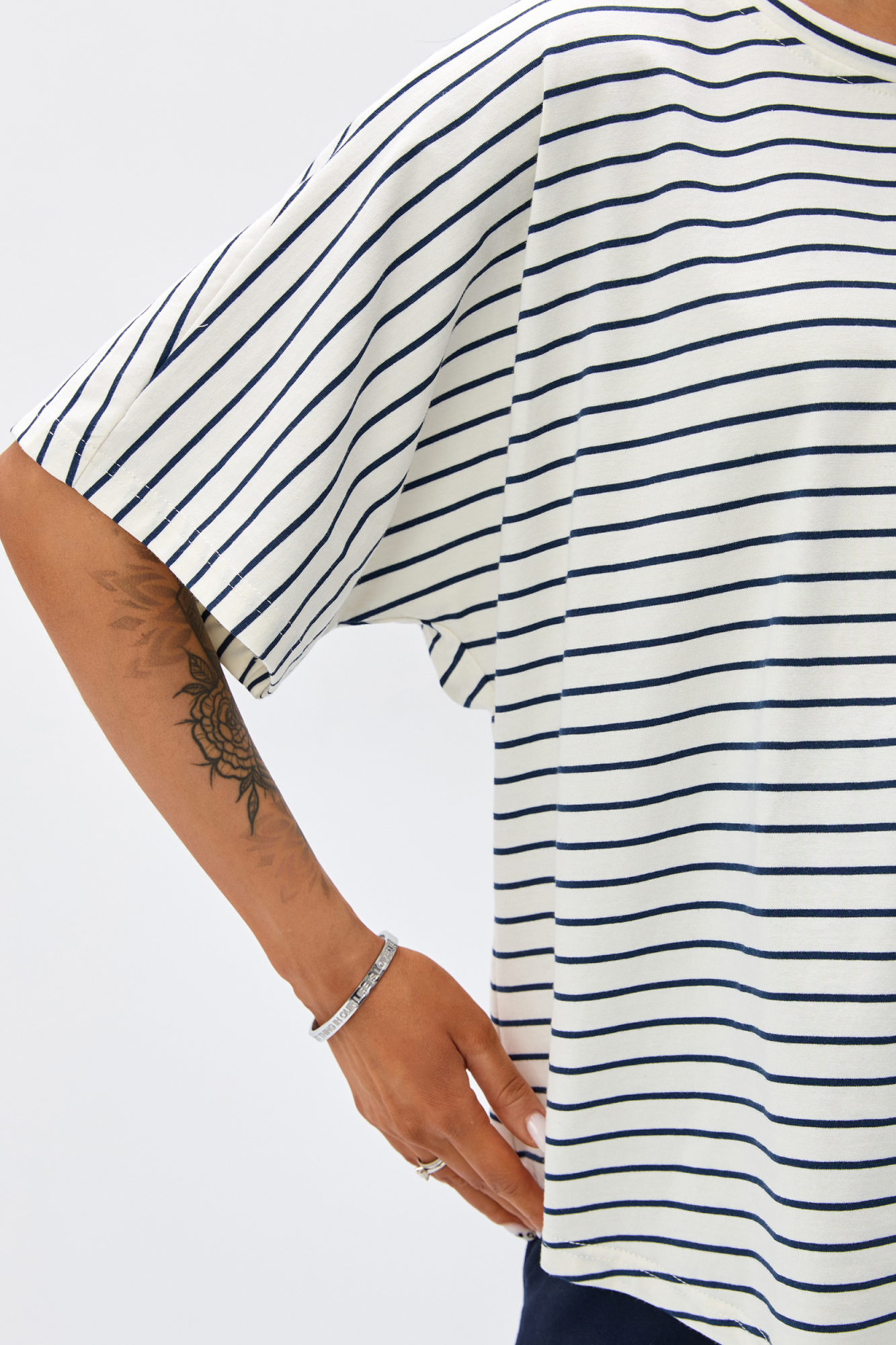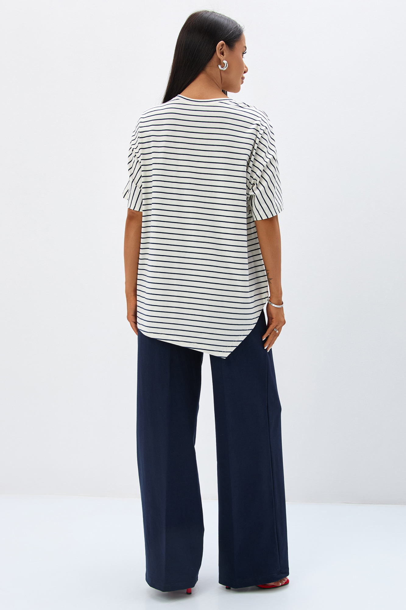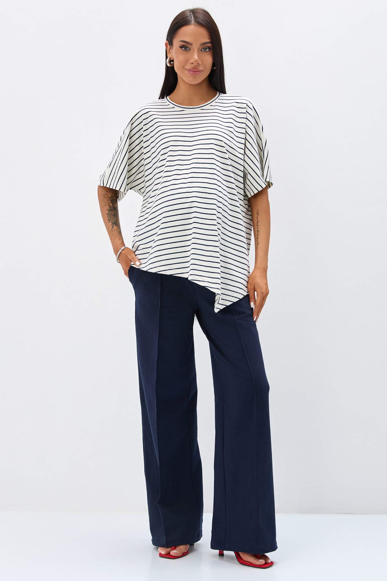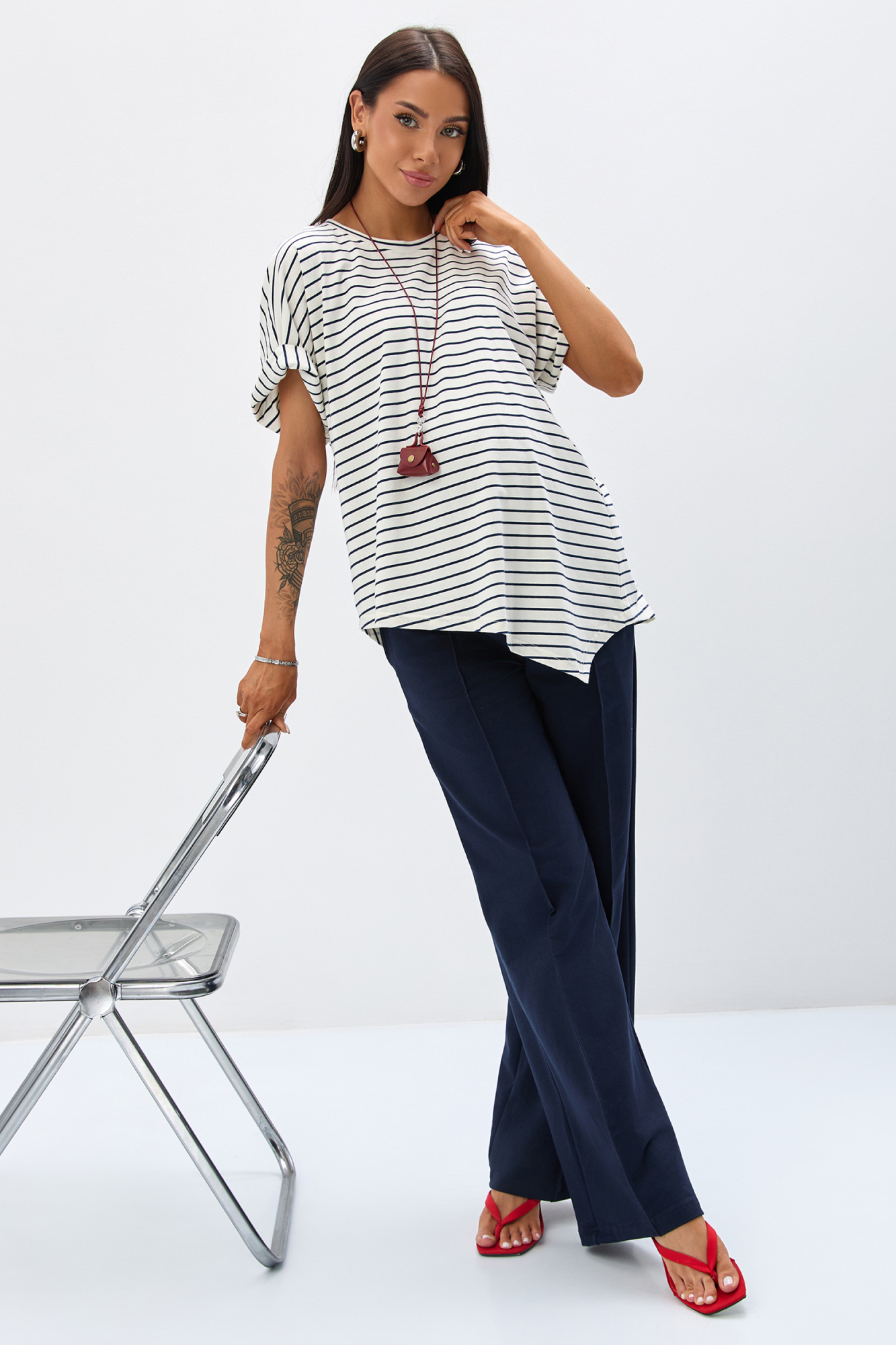 Футболка из кулирки оверсайз свободного, чуть приталенного кроя с асимметричным низом и коротким рукавом.