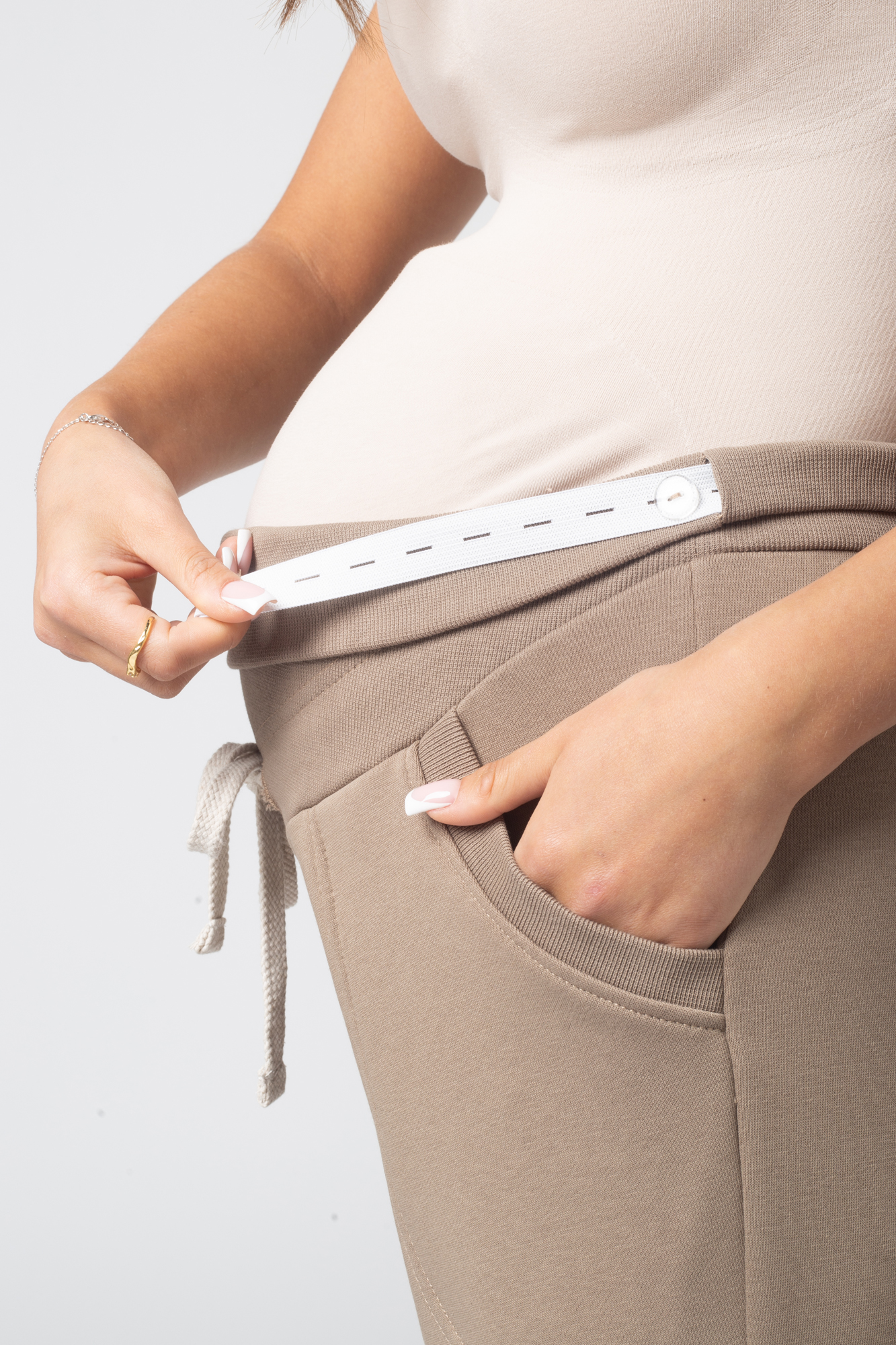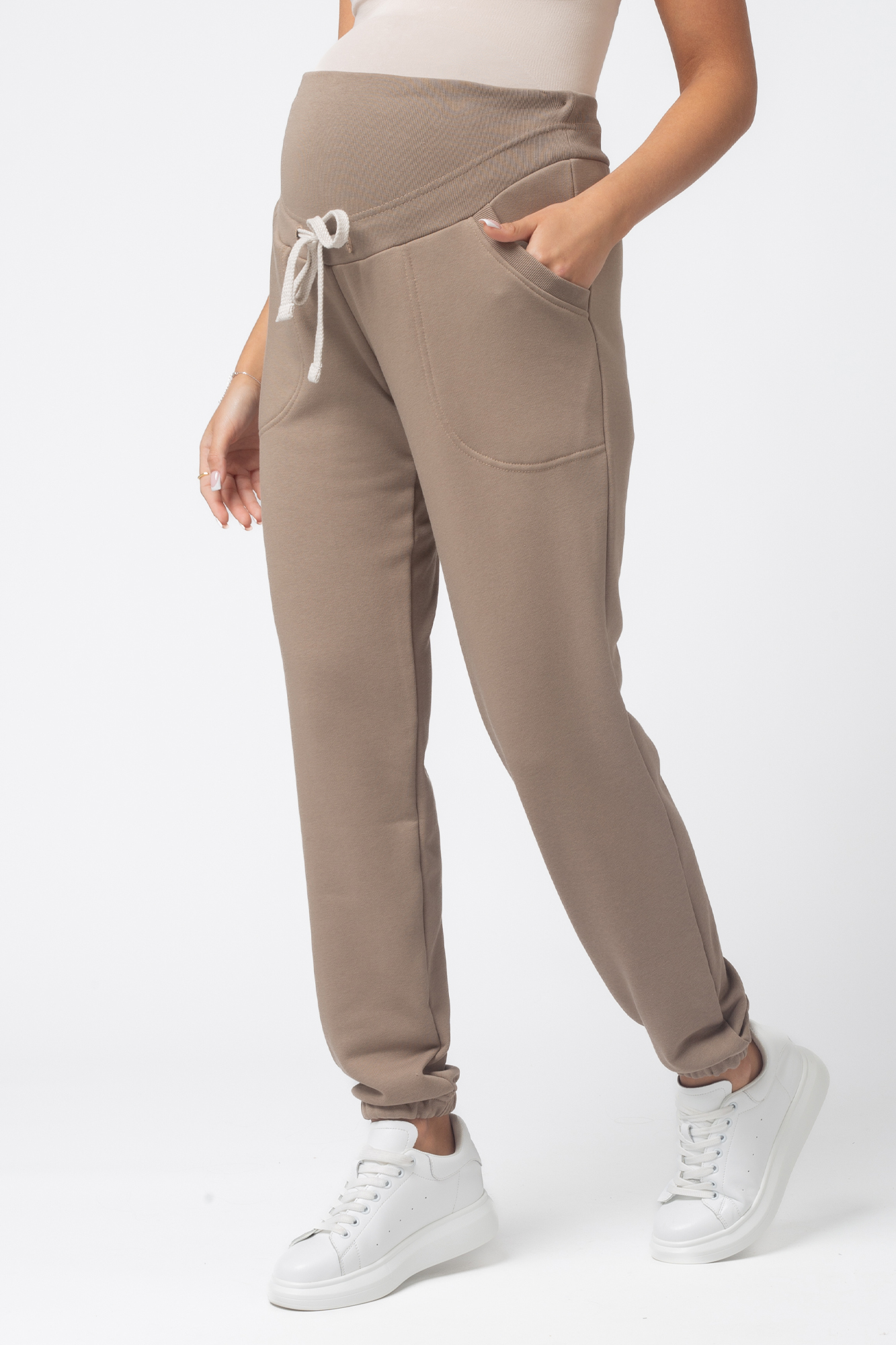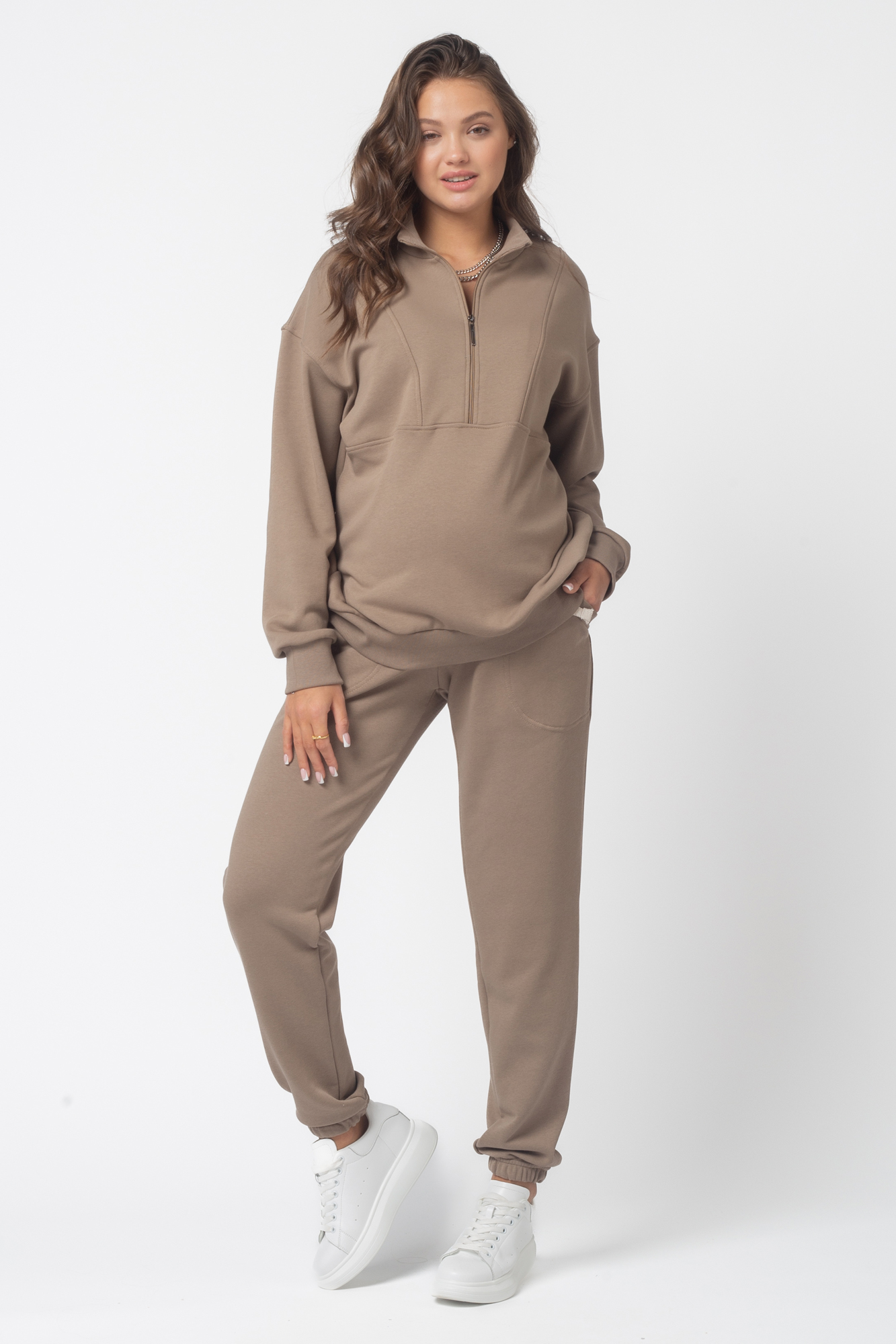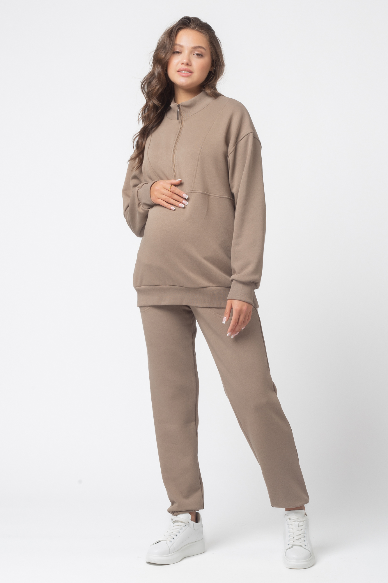Cтильный костюм для беременных выполнен из трехниточного футера премиум-класса. Мягкий и дышащий материал поддерживает нормальную терморегуляцию и впитывает влагу. Комплект состоит из двух вещей: брюк и свитшота. Брюки джоггеры оснащены высокой эластичной вставкой для живота с возможностью регулировки объема (за счет резинки на пуговице), украшены функциональными боковыми карманами. Свитшот свободного кроя с воротником. Для комфортного кормления предусмотрена вертикальная молния. Костюм подходит для ношения на любом месяце беременности и после родов. Модель из хлопкового трикотажа - идеальный вариант повседневного образа для будущей мамы на весну и прохладное лето. Универсальный и нарядный комплект подойдет для прогулок, выписки из роддома, занятий спортом, путешествий и просто на каждый день.