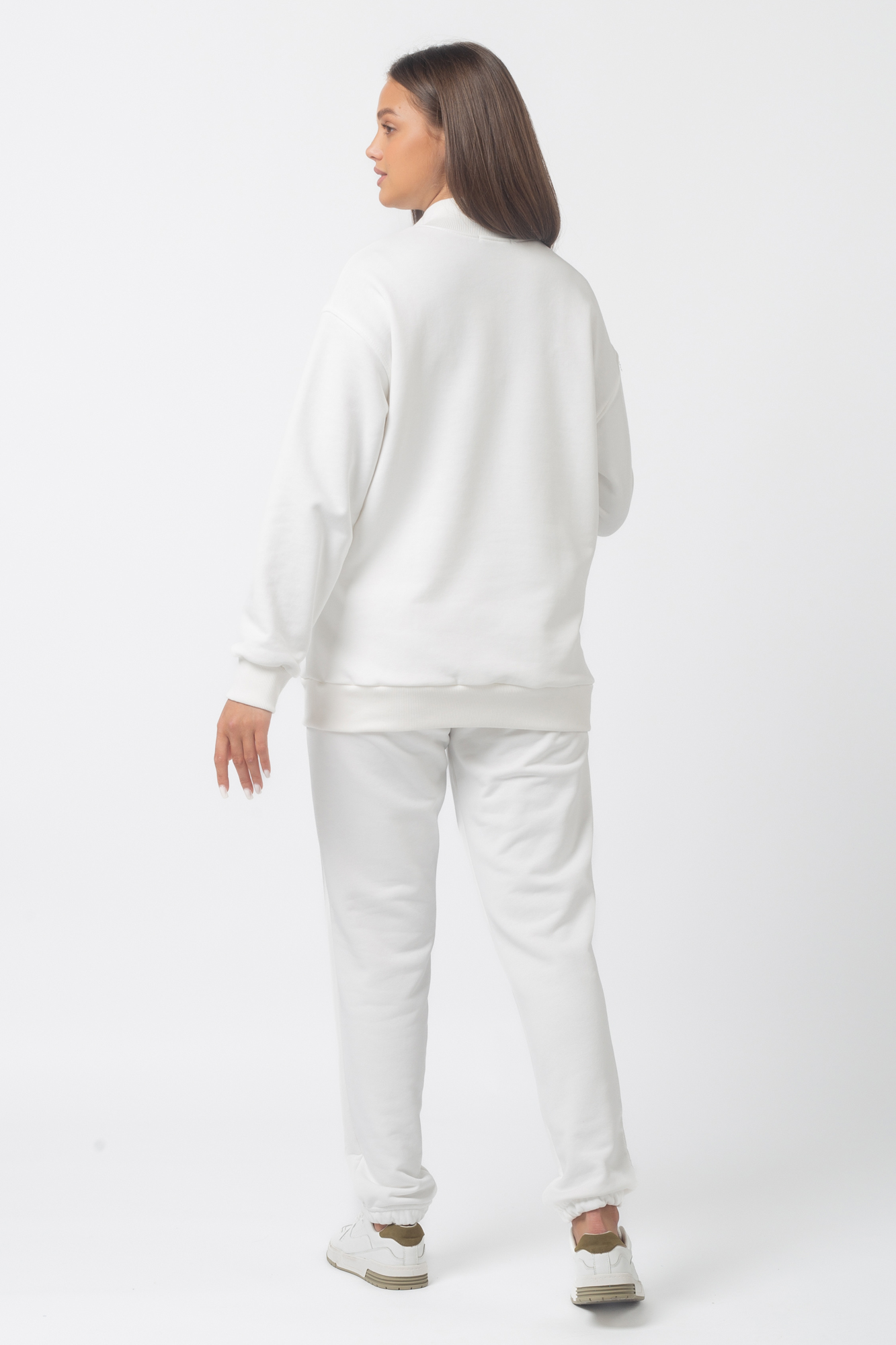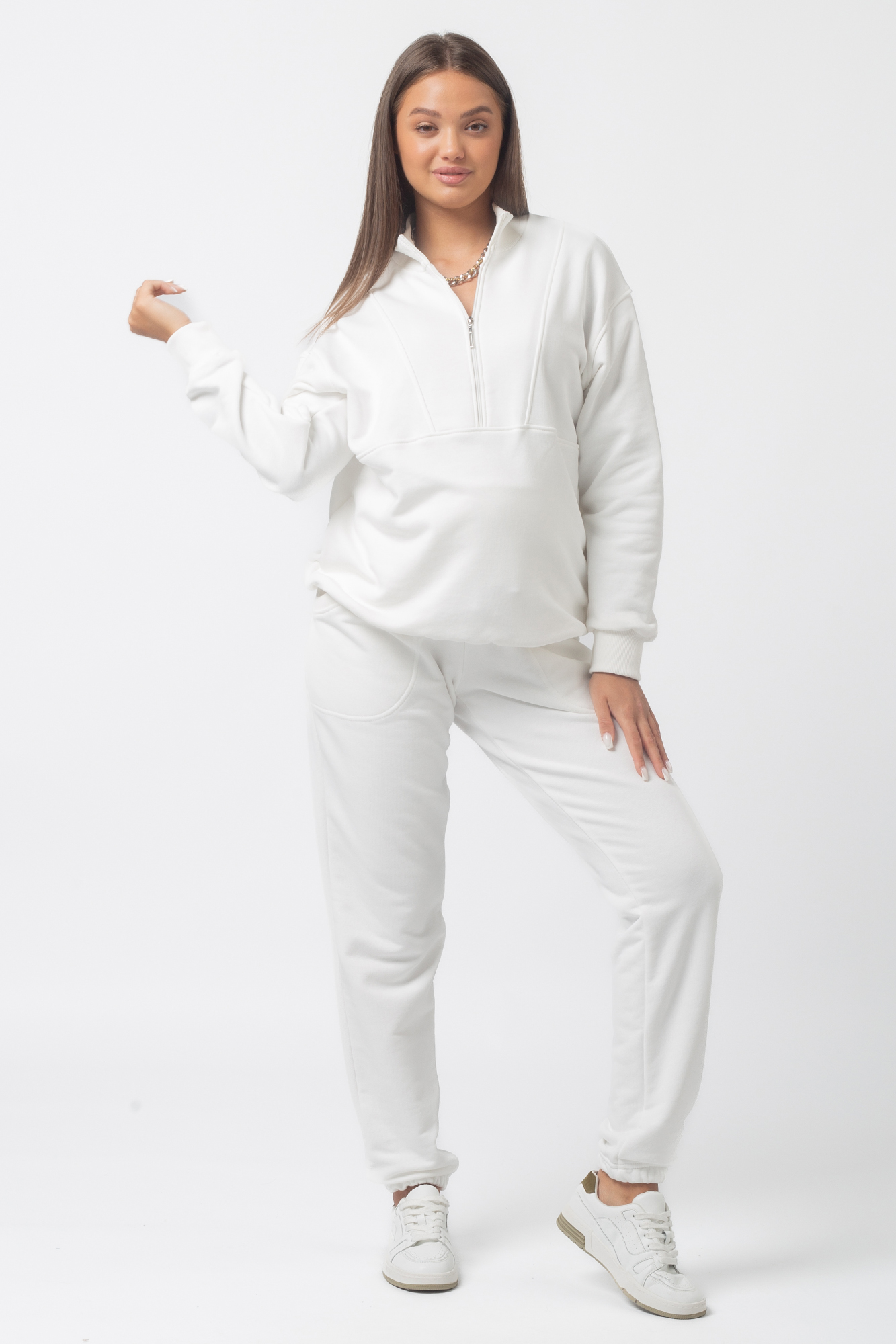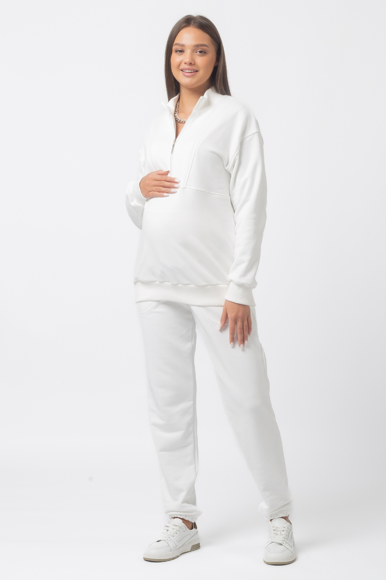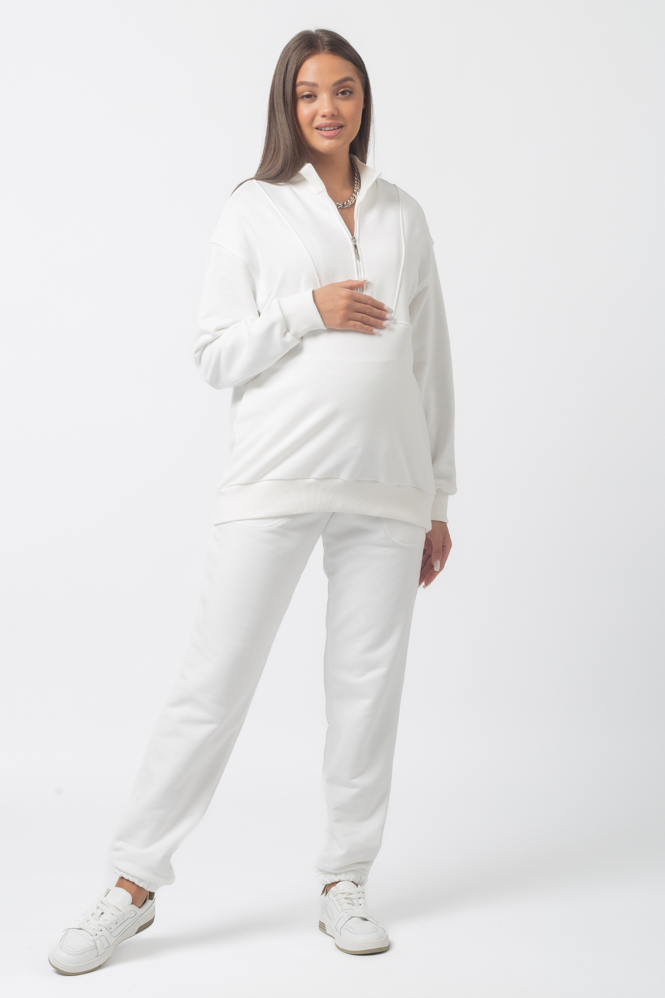 Cтильный костюм для беременных выполнен из трехниточного футера премиум-класса. Мягкий и дышащий материал поддерживает нормальную терморегуляцию и впитывает влагу. Комплект состоит из двух вещей: брюк и свитшота. Брюки джоггеры оснащены высокой эластичной вставкой для живота с возможностью регулировки объема (за счет резинки на пуговице), украшены функциональными боковыми карманами. Свитшот свободного кроя с воротником. Для комфортного кормления предусмотрена вертикальная молния. Костюм подходит для ношения на любом месяце беременности и после родов. Модель из хлопкового трикотажа - идеальный вариант повседневного образа для будущей мамы на весну и прохладное лето. Универсальный и нарядный комплект подойдет для прогулок, выписки из роддома, занятий спортом, путешествий и просто на каждый день.