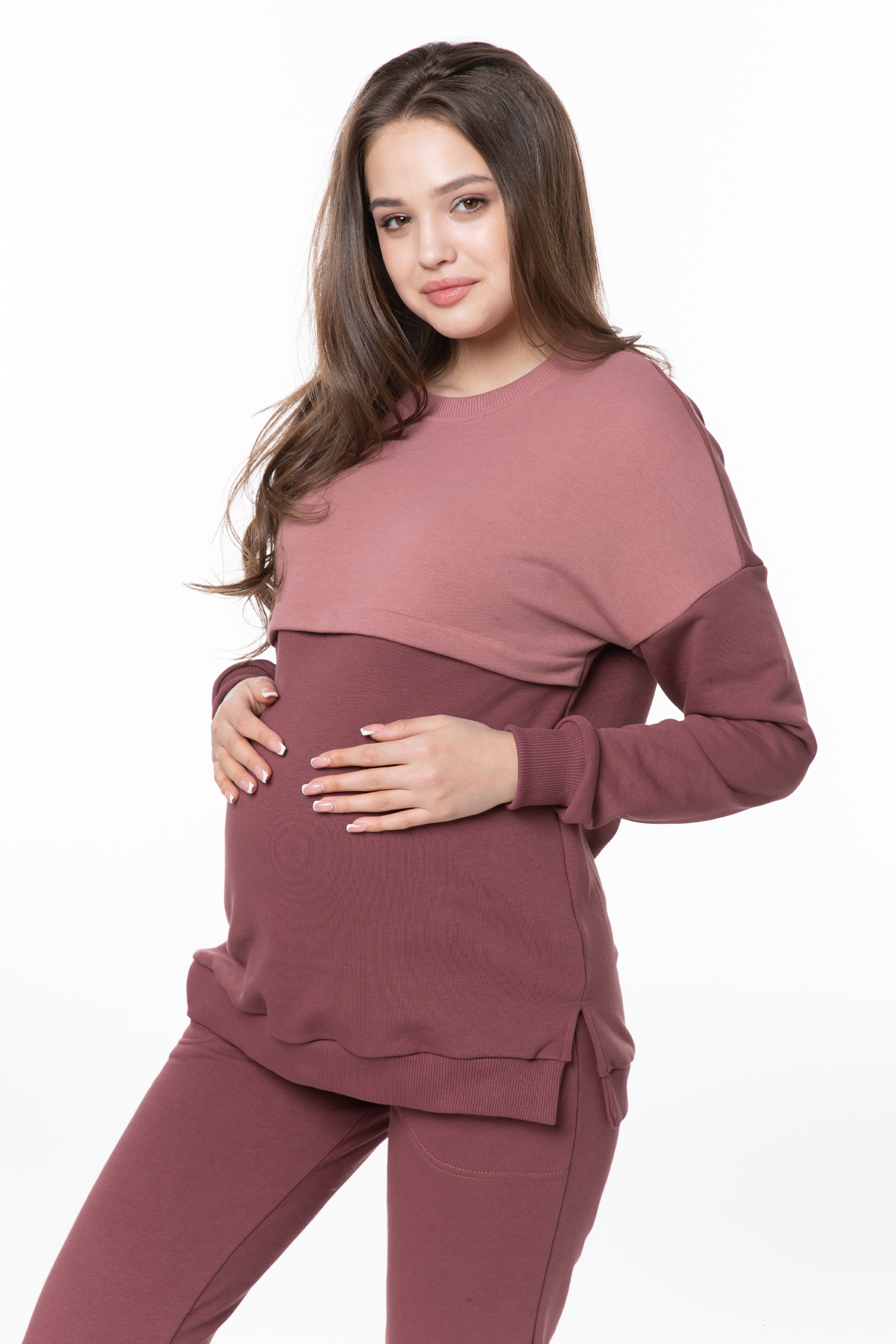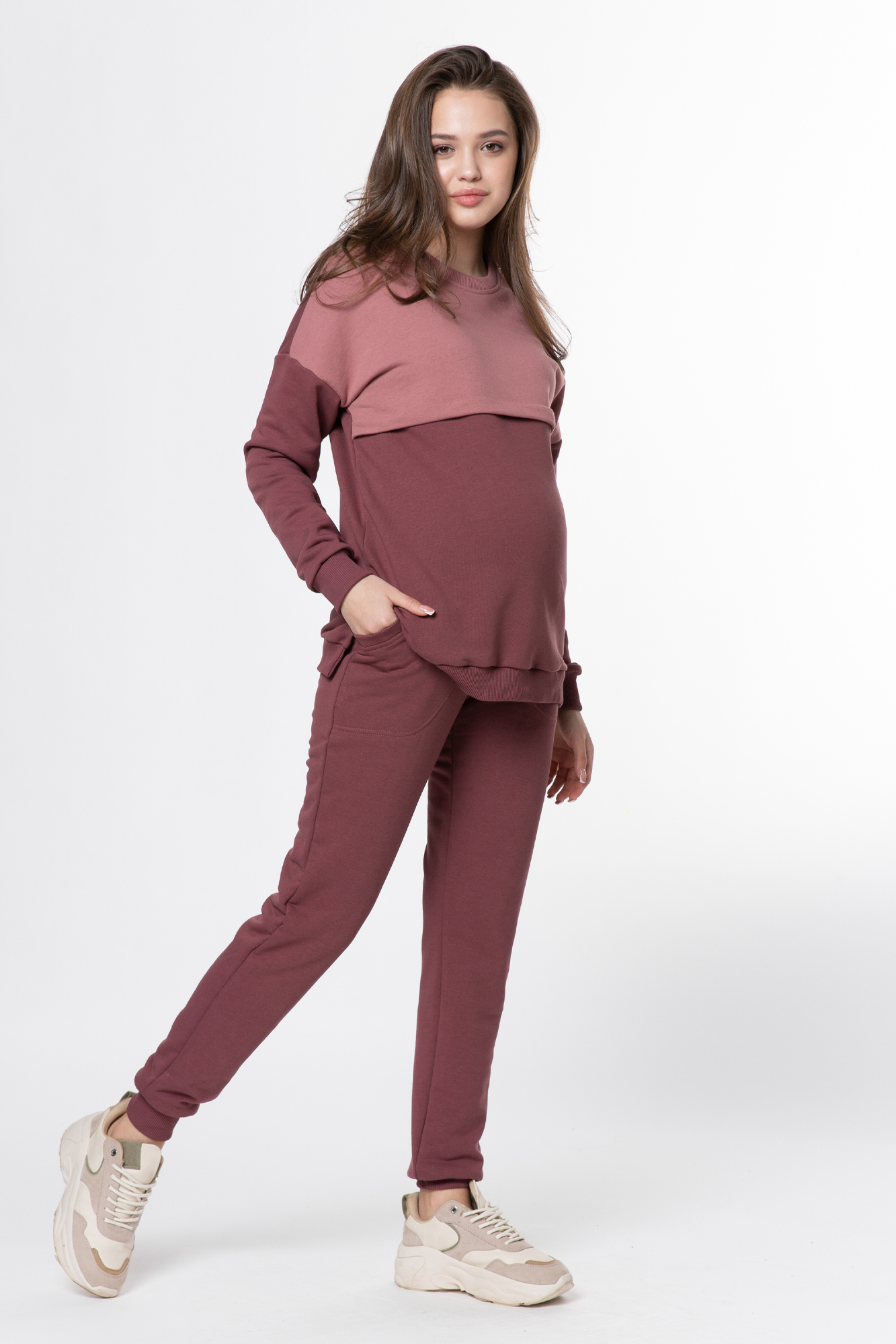 Спортивный костюм из высококачественного трехниточного футера (петля). Свитшот имеет «секрет» кормления – встречные горизонтальные потайные молнии – позволит покормить малыша с повышенным комфортом в любой ситуации. Округлый вырез горловины, удлиненная линия плеча, манжет по низу изделия и на рукавах. Брюки с высокой трикотажной вставкой предназначены для ношения в период беременности и после родов. Объем регулируется при помощи перфорированной резинки, перестегивающейся на пуговицу, продетой в пояс брюк. Костюм подойдет для прогулок, занятий спортом и в качестве домашней одежды.