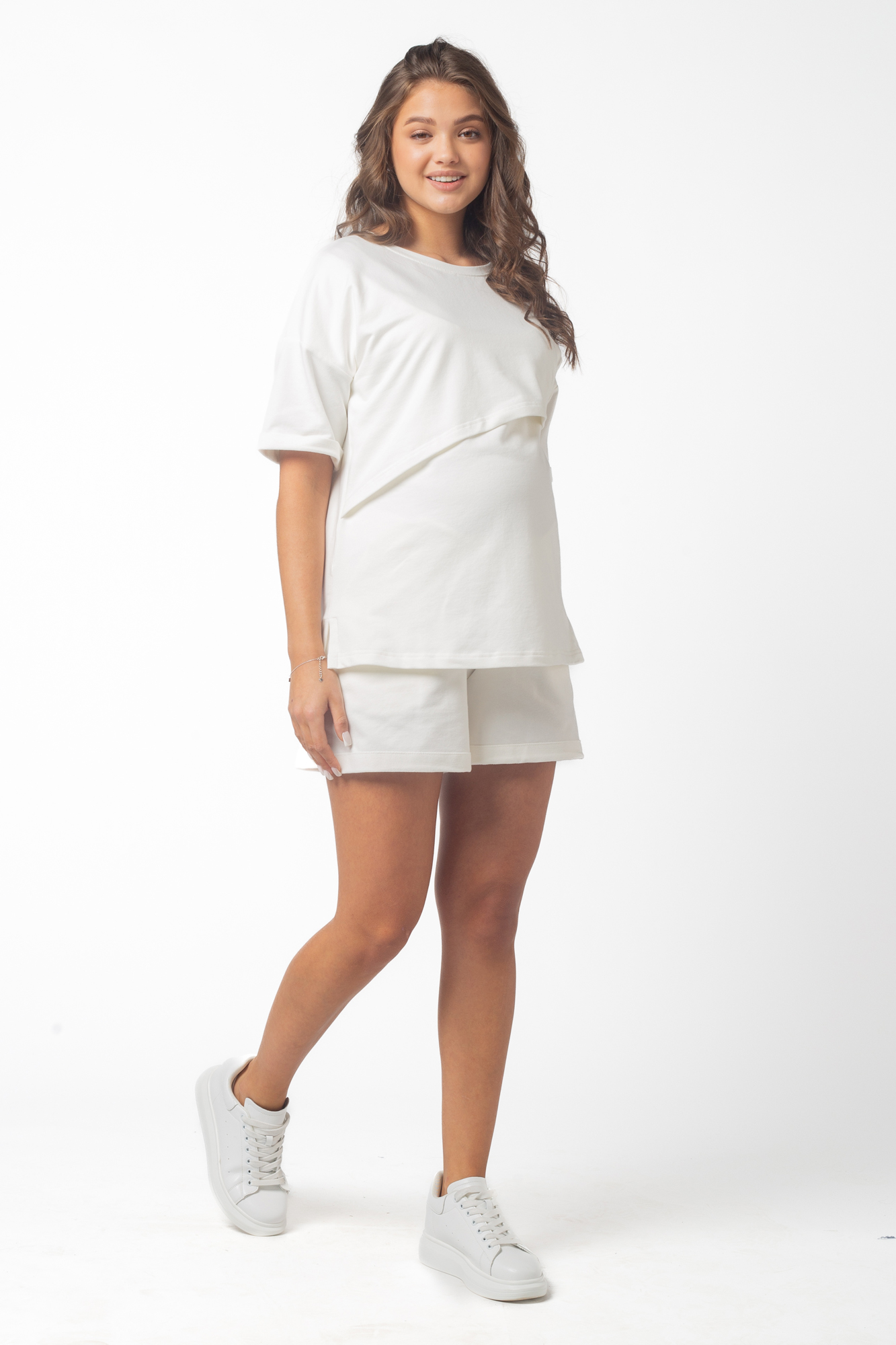 Летний костюм для беременных сшит из тонкого двухниточного футера. Ткань на основе хлопка имеет дышащую структуру, приятна на ощупь и гипоаллергенна. Футболка оверсайз со спущенной линией плеча дарит полную свободу движениям. Секрет для кормления позволяет с комфортом покормить малыша на прогулке или в гостях. Короткие широкие шорты с эластичным поясом и кулиской можно носить на любом месяце беременности и даже после родов. Стильный женский костюм подойдет для отдыха и путешествий, занятий спортом, посещений врача, а также для ношения дома. В линейке представлены нежные однотонные расцветки. Размерный ряд включает все стандартные модели.