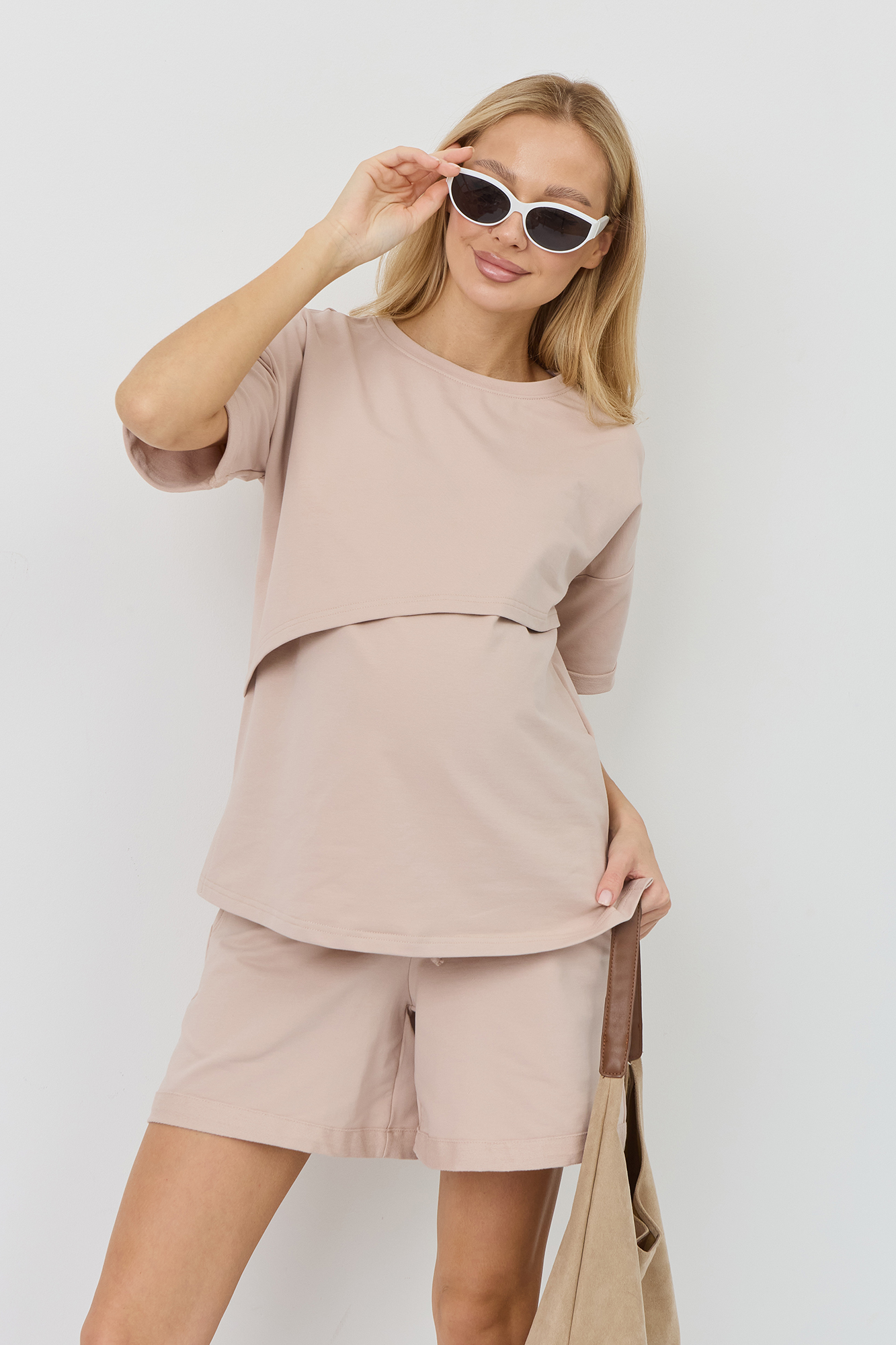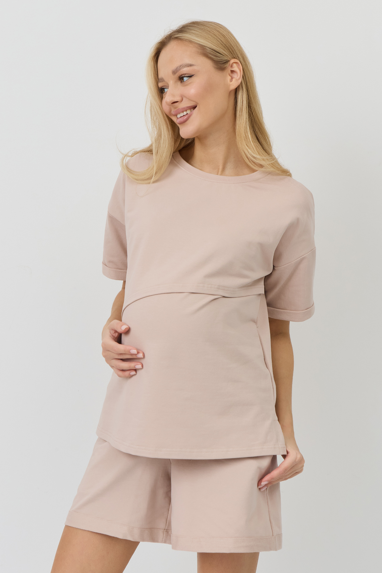 Летний костюм для беременных сшит из тонкого двухниточного футера. Ткань на основе хлопка имеет дышащую структуру, приятна на ощупь и гипоаллергенна. Футболка оверсайз со спущенной линией плеча дарит полную свободу движениям. Секрет для кормления позволяет с комфортом покормить малыша на прогулке или в гостях. Короткие широкие шорты с эластичным поясом и кулиской можно носить на любом месяце беременности и даже после родов. Стильный женский костюм подойдет для отдыха и путешествий, занятий спортом, посещений врача, а также для ношения дома. В линейке представлены нежные однотонные расцветки. Размерный ряд включает все стандартные модели.
