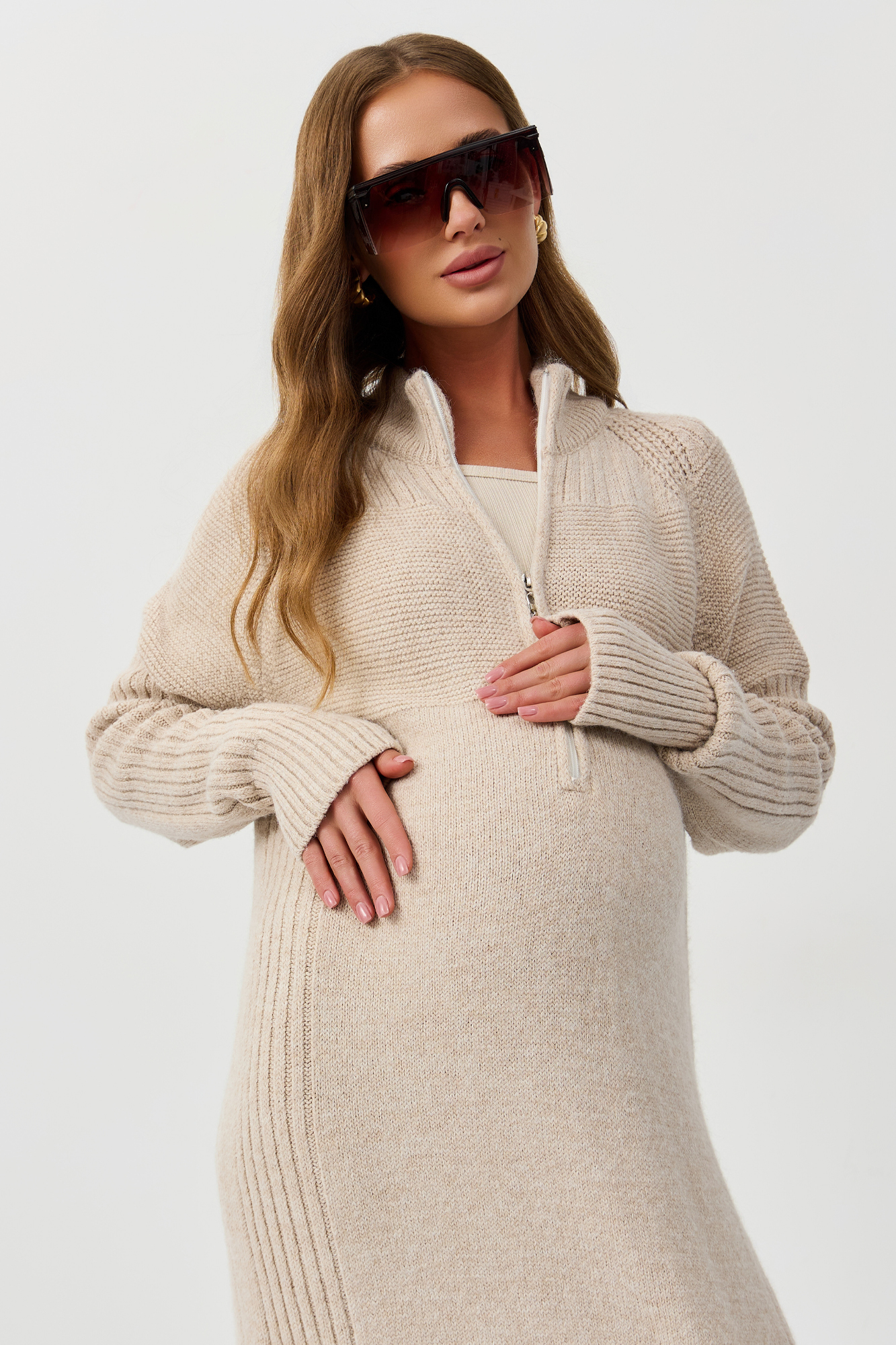 Платье для беременных вязаное теплое с добавлением шерсти. Теплое зимнее платье выполнено из вискозы плотной вязки с добавлением шерстяных нитей (20% шерсти). Свободная оверсайз модель практична и станет любимой вещью в гардеробе будущей мамы. Вязаное платье с контрастными полосами вязки создаст стильный и элегантный образ беременной женщины. Праздничное платье слегка облегает животик, образ получается нежный и женственный. Высокий воротник с длинной молнией защитит от холода и ветра, согреет осенью и зимой. Удобная молния обеспечит комфортное кормление малыша, вы сможете без труда использовать это платье не только в беременность, но и в период грудного вскармливания. Данная модель подойдет так же и девушкам plus size. Женщины с большим размером одежды могут с легкостью создавать нарядные образы с этим платьем. Теплая и мягкая вискоза с шерстью, незаменимый атрибут зимы. Длина платья миди позволяет носить его даже в самый холод.