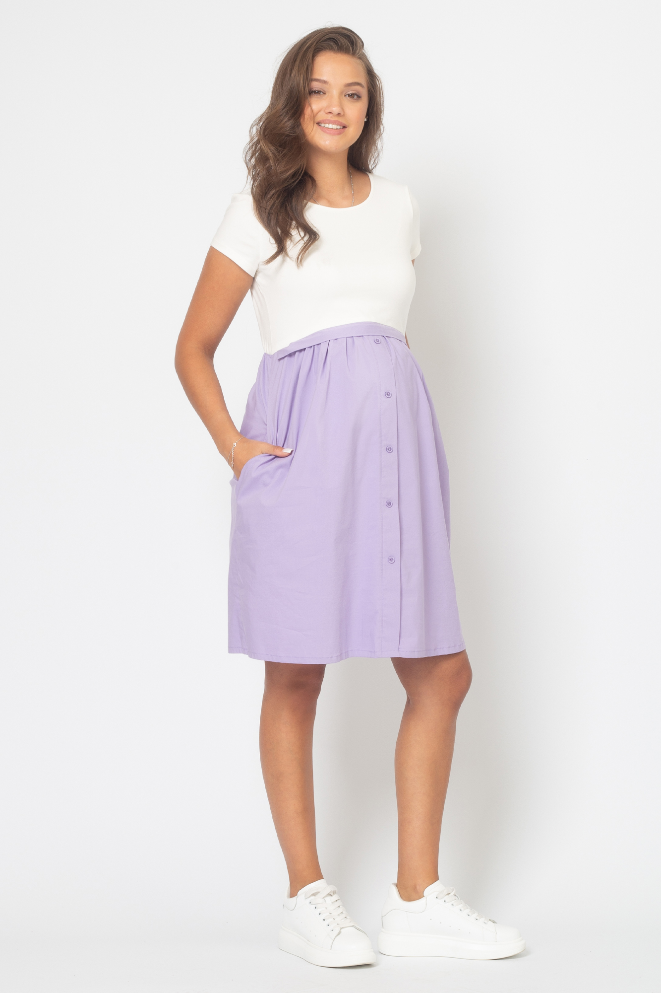 Летнее платье в стиле casual из комбинированных тканей для беременных и кормящих. Верхняя часть изделия выполнена из высококачественной кулирной глади пенье, нижняя - из хлопка. С ним не нарушается кожное дыхание, легко происходит впитывание и испарение влаги. В такой одежде вы будете чувствовать себя комфортно и легко. Детали: округлый вырез горловины, короткий рукав, практичная длина. Платье идеально подчеркивает округлившийся животик, но при этом не сковывает движений. Благодаря встречным потайным молниям под грудью Вам удастся покормить малыша с комфортом в любой ситуации. Платье прекрасно сидит на любом сроке беременности, а после родов скроет временные несовершенства фигуры.