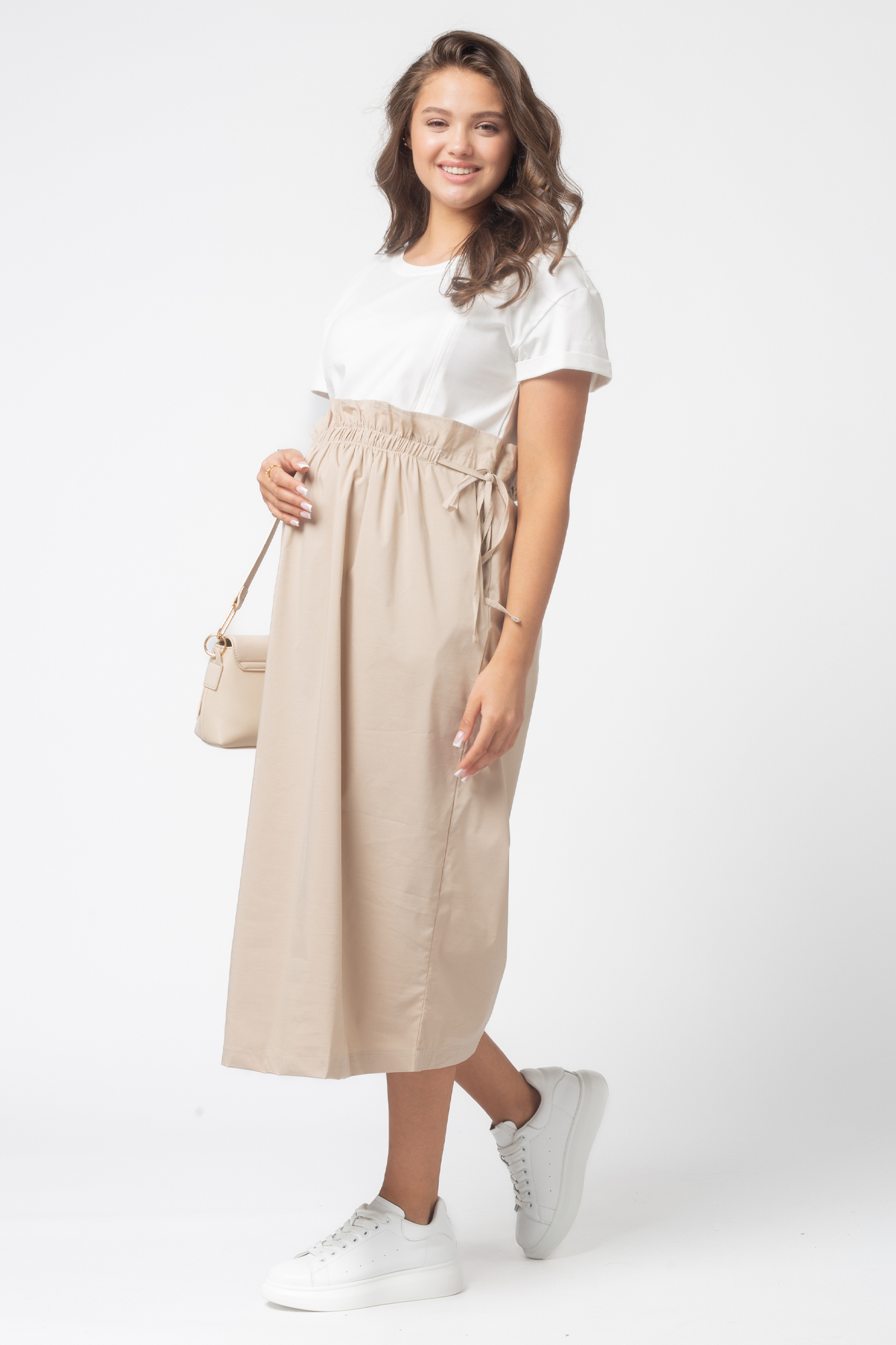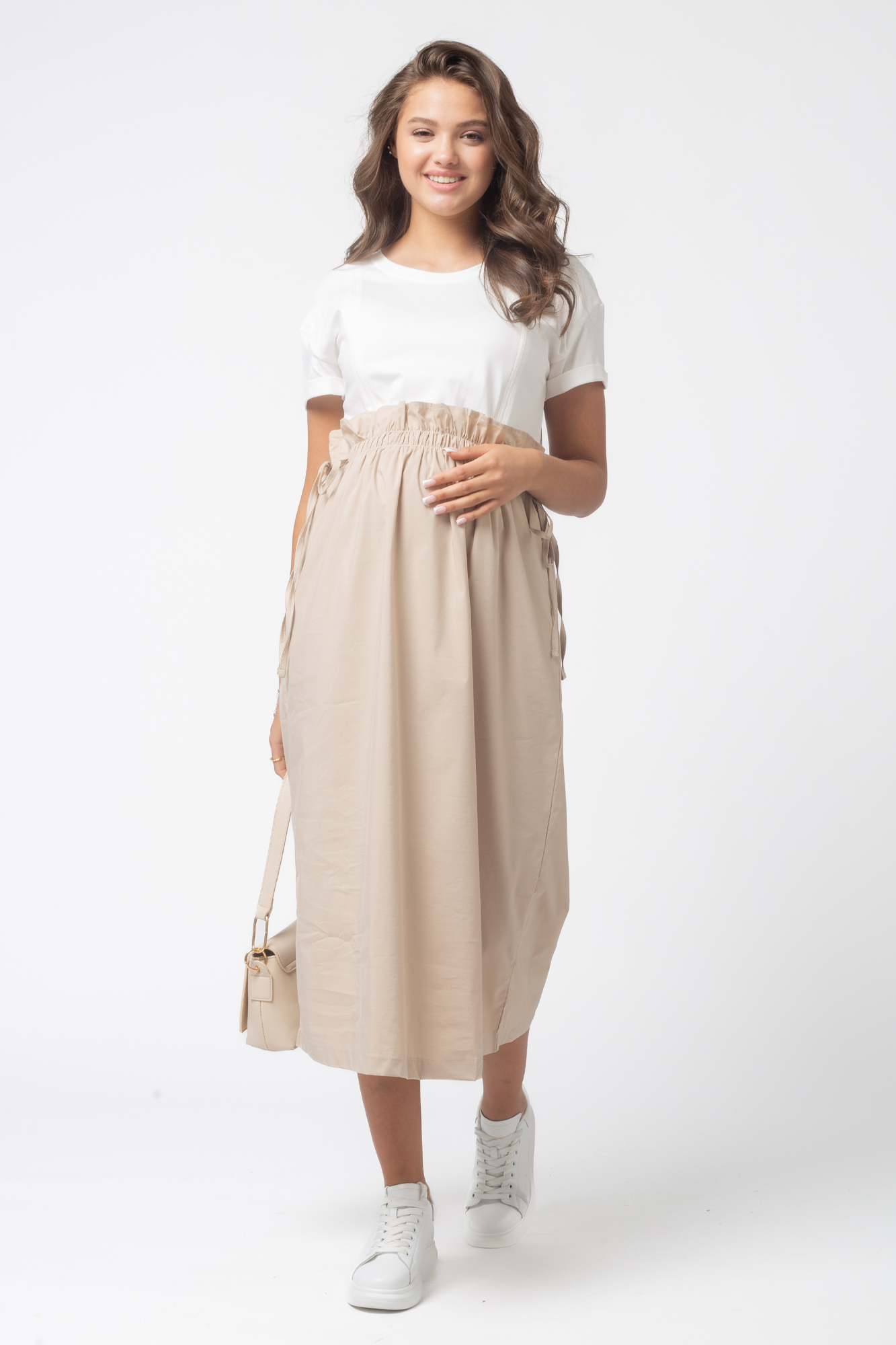 Летнее платье в стиле casual из комбинированных тканей для беременных и кормящих. В такой одежде вы будете чувствовать себя комфортно и легко. Детали: округлый вырез горловины, короткий рукав, практичная длина. Благодаря встречным потайным молниям под грудью Вам удастся покормить малыша с комфортом в любой ситуации. Платье прекрасно сидит на любом сроке беременности, а после родов скроет временные несовершенства фигуры.