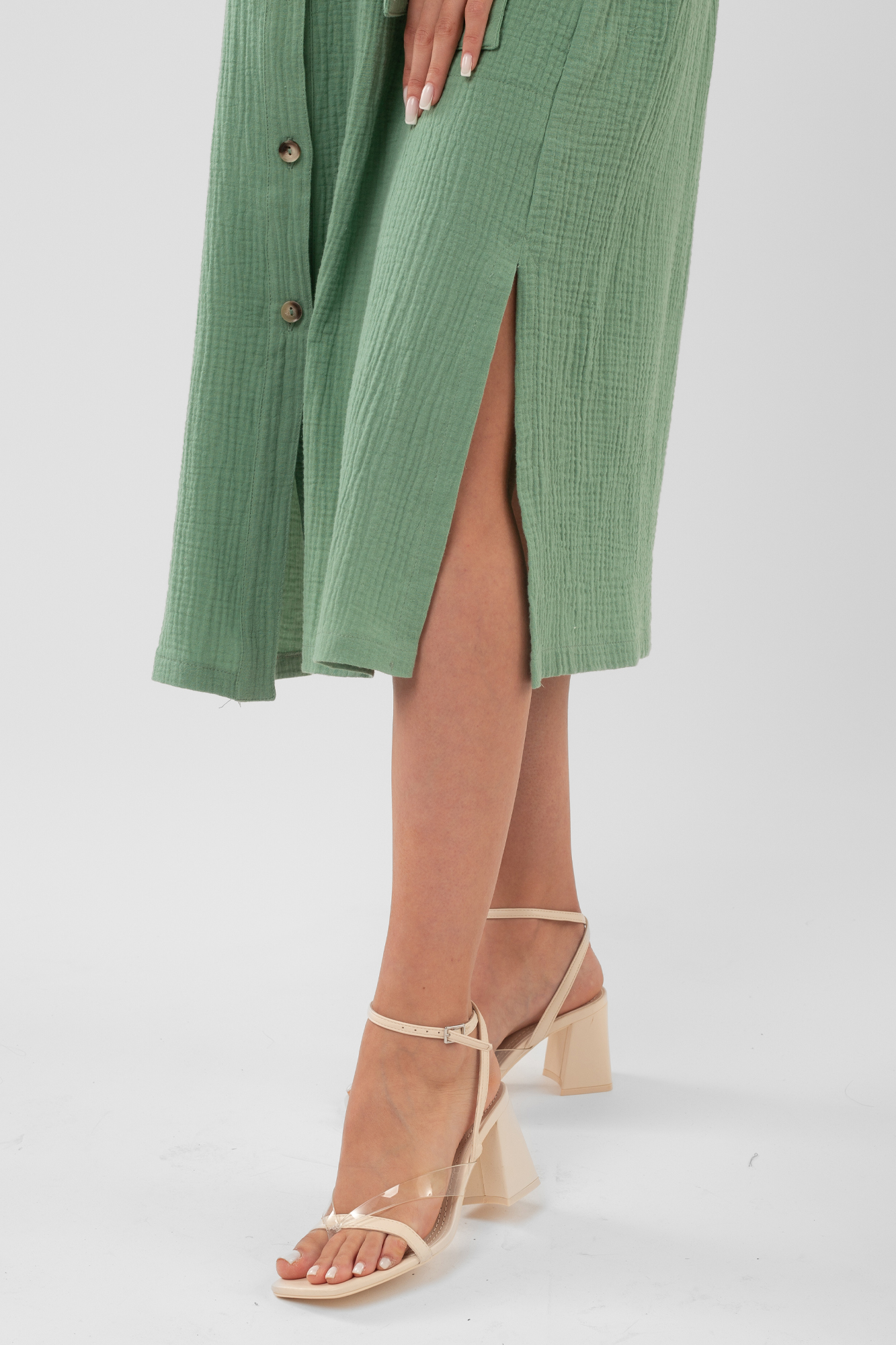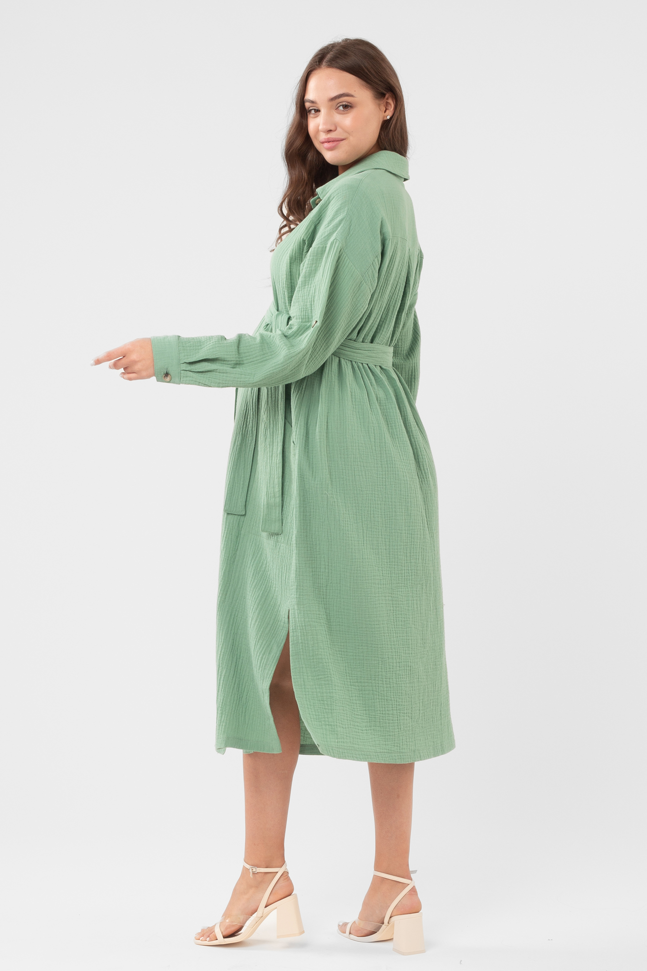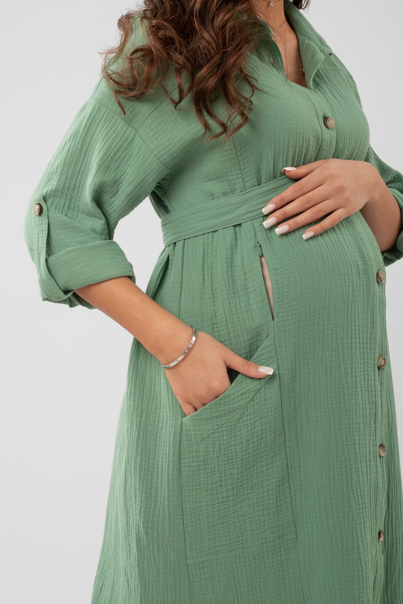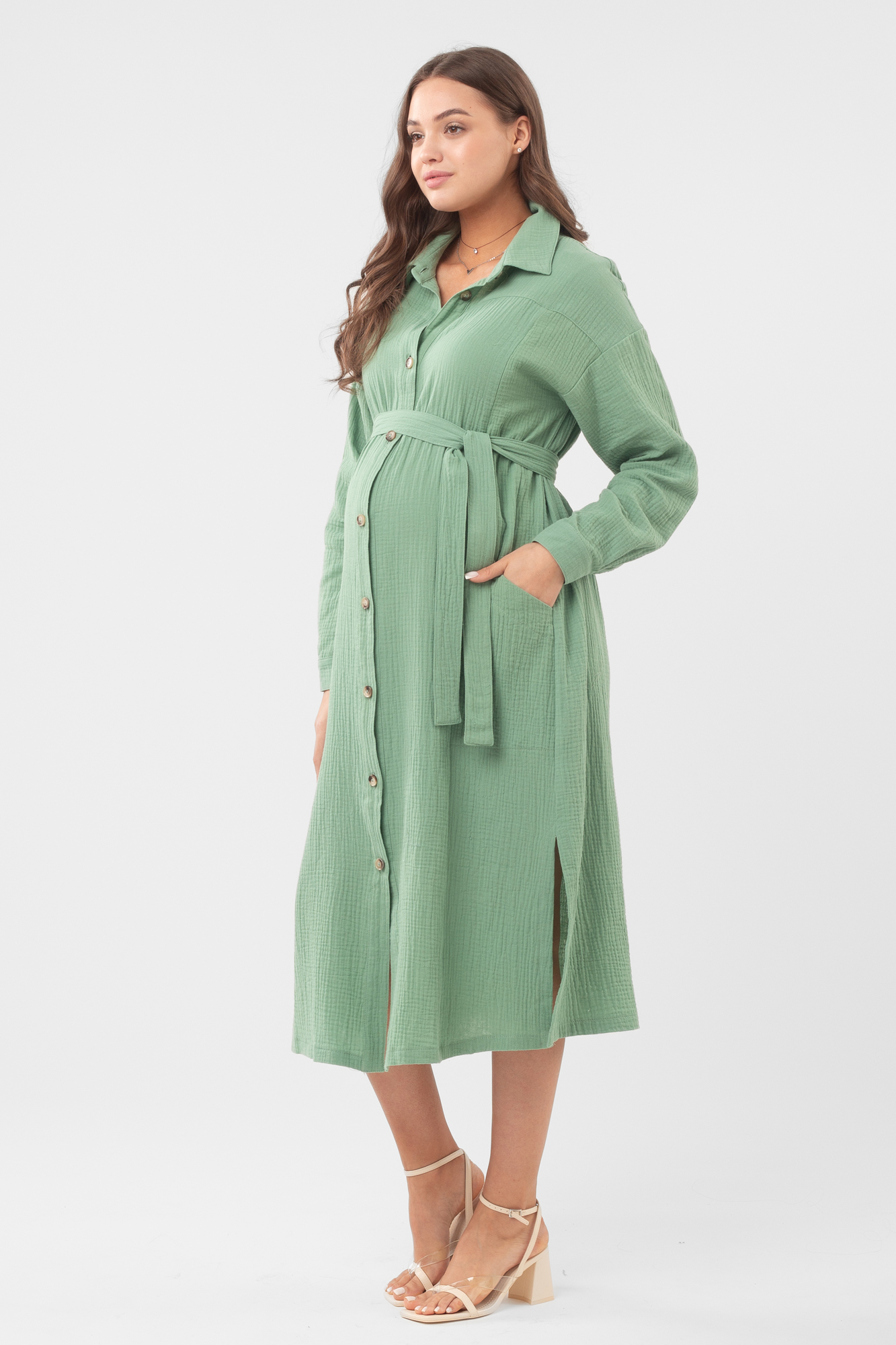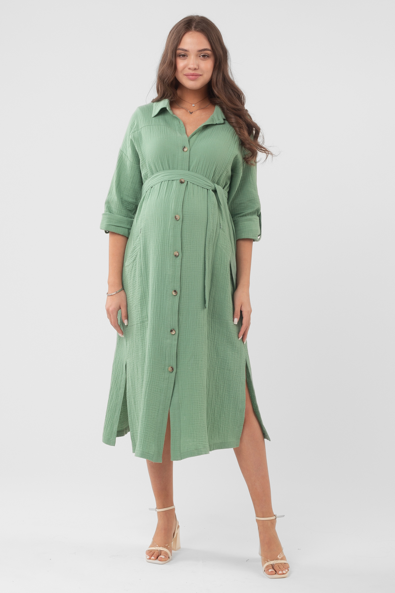 Платье рубашка для беременных из высококачественного муслина (натуральный хлопок) - идеальный повседневный вариант для теплого лета. Модель чуть приталенный крой и универсальную длину миди. Длинные рукава дополнены хлястиками для фиксации отворотов, воротник классический отложной, застежка на пуговицы, разрезы по бокам изделия. Для удобства платье дополнено боковыми карманами. Фасон сафари считается модным трендом летнего сезона; он удачно сочетается с кедами, кроссовками, классическими лодочками и босоножками. Красивое повседневное платье подойдет для офиса, деловых и дружеских встреч, посещений врача, прогулок с ребенком. В теплую погоду такую модель можно выбрать в качестве наряда на выписку. Сарафан предлагается в нескольких классических оттенках.