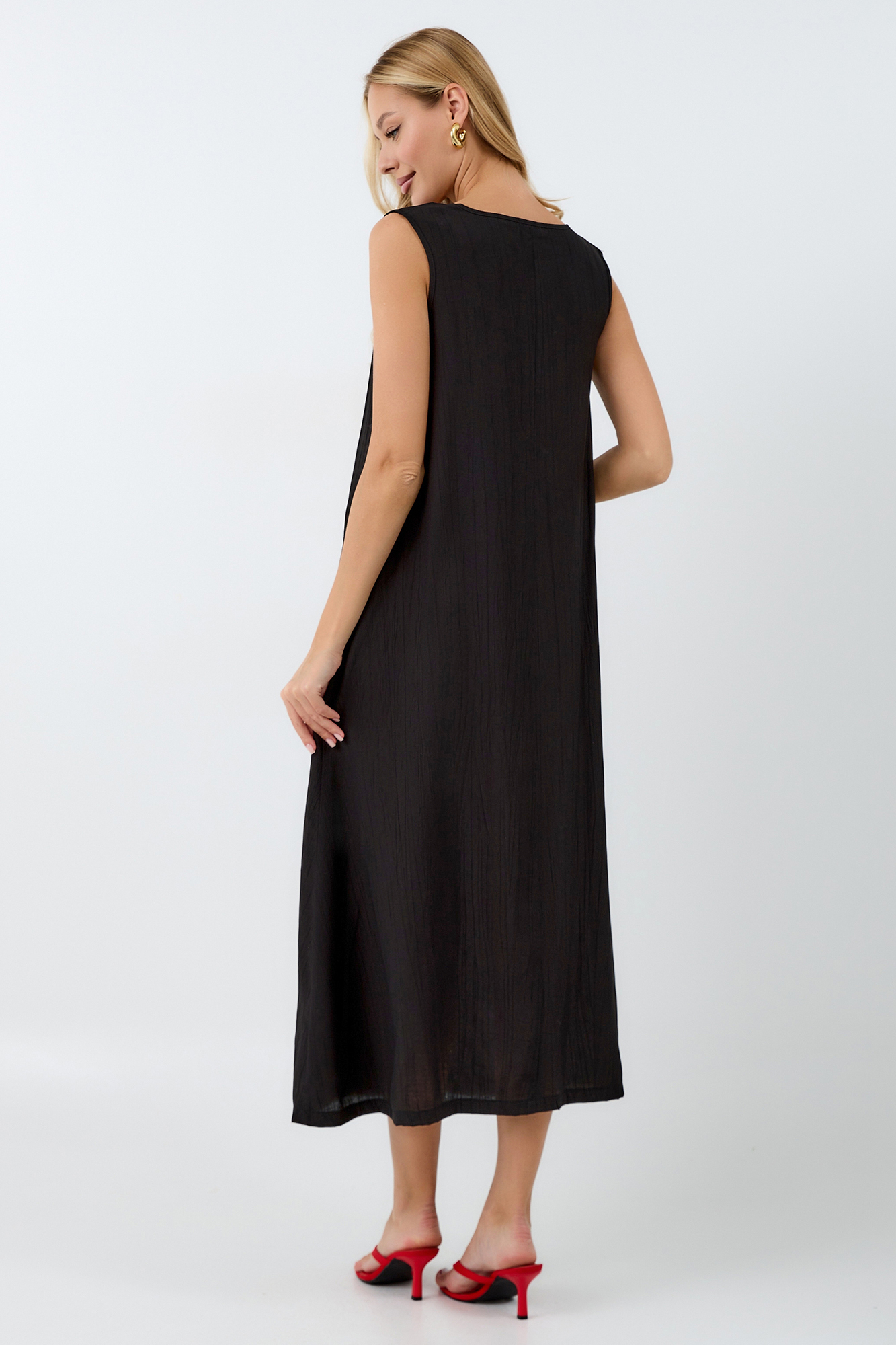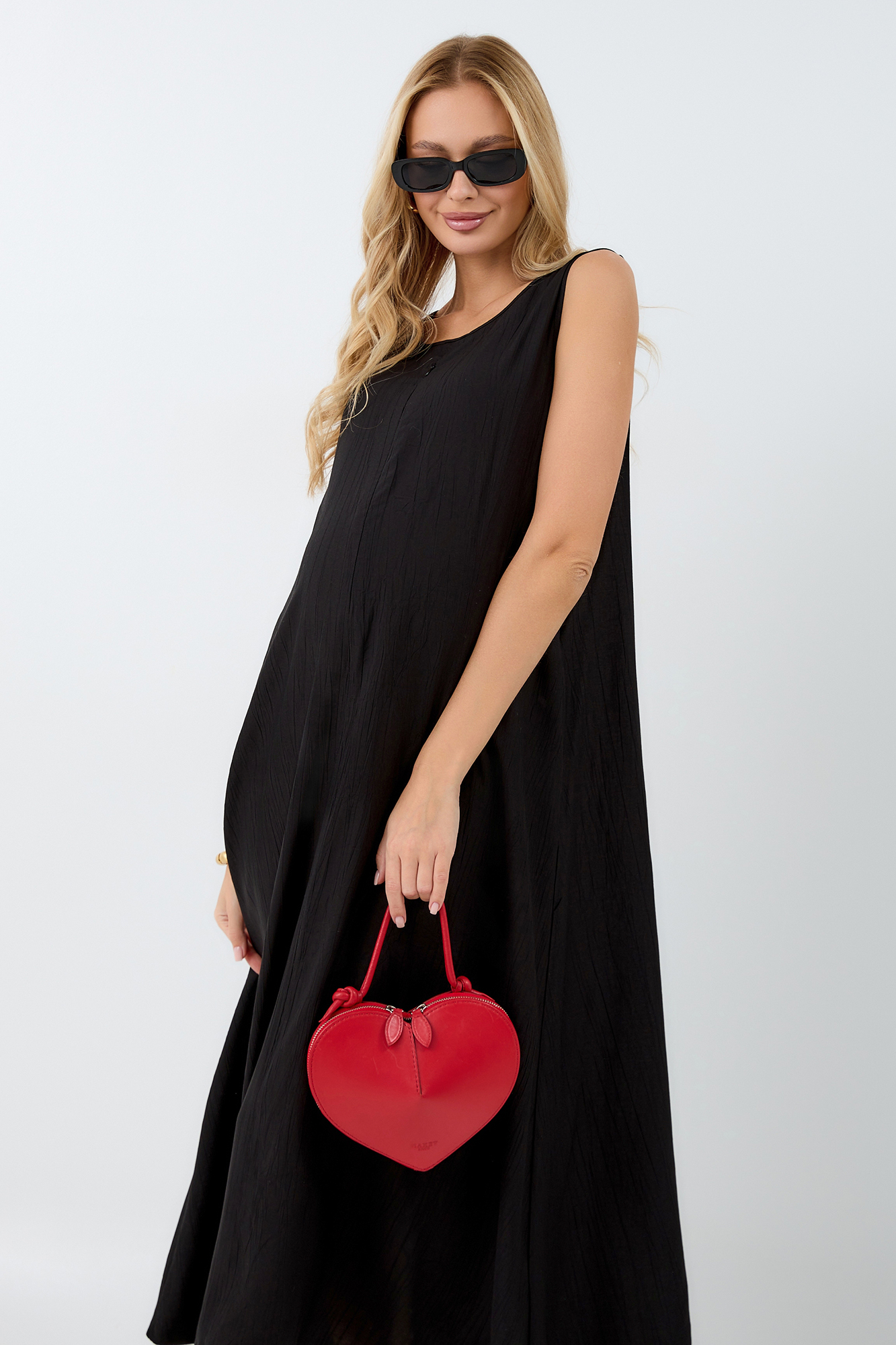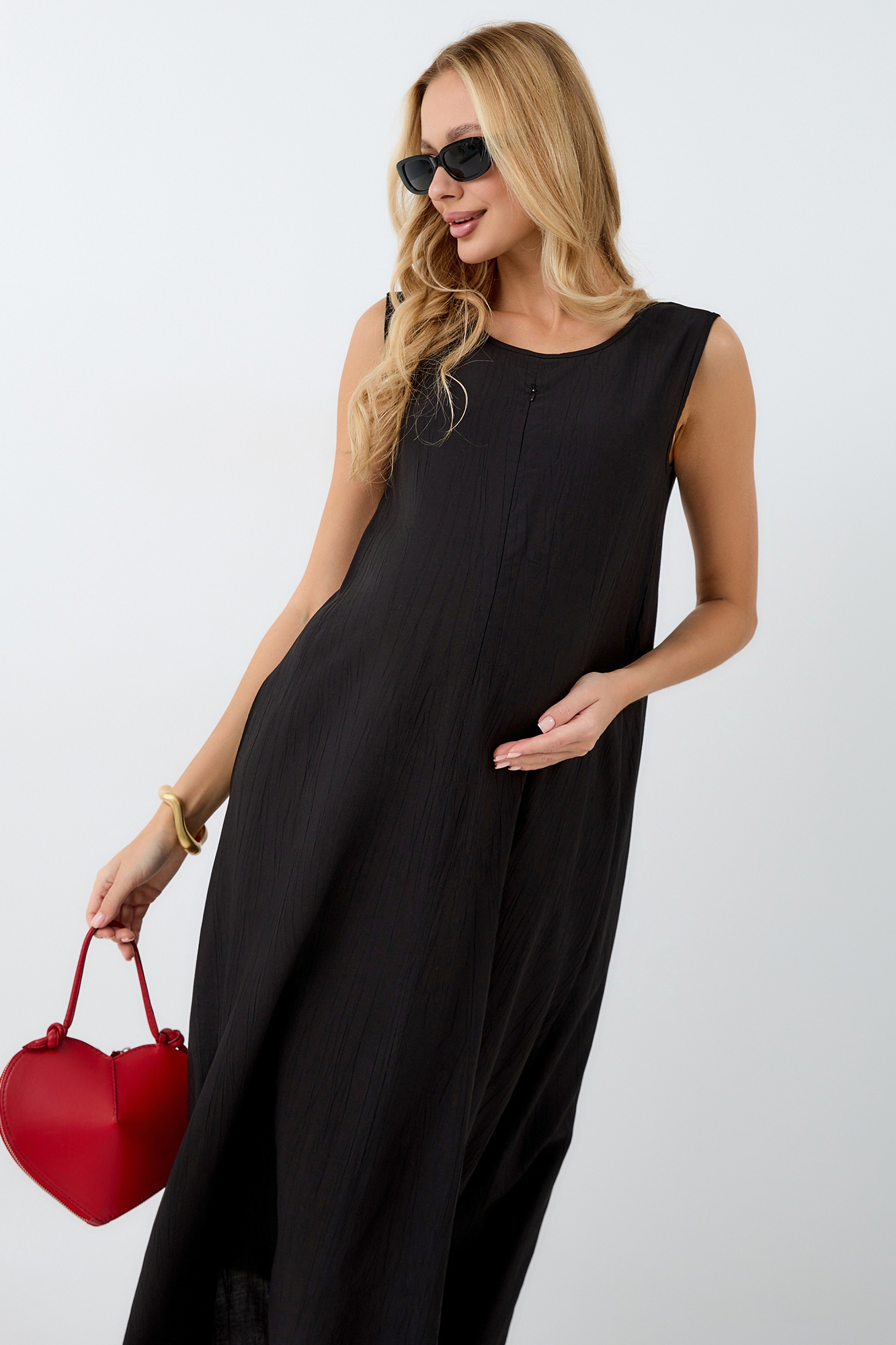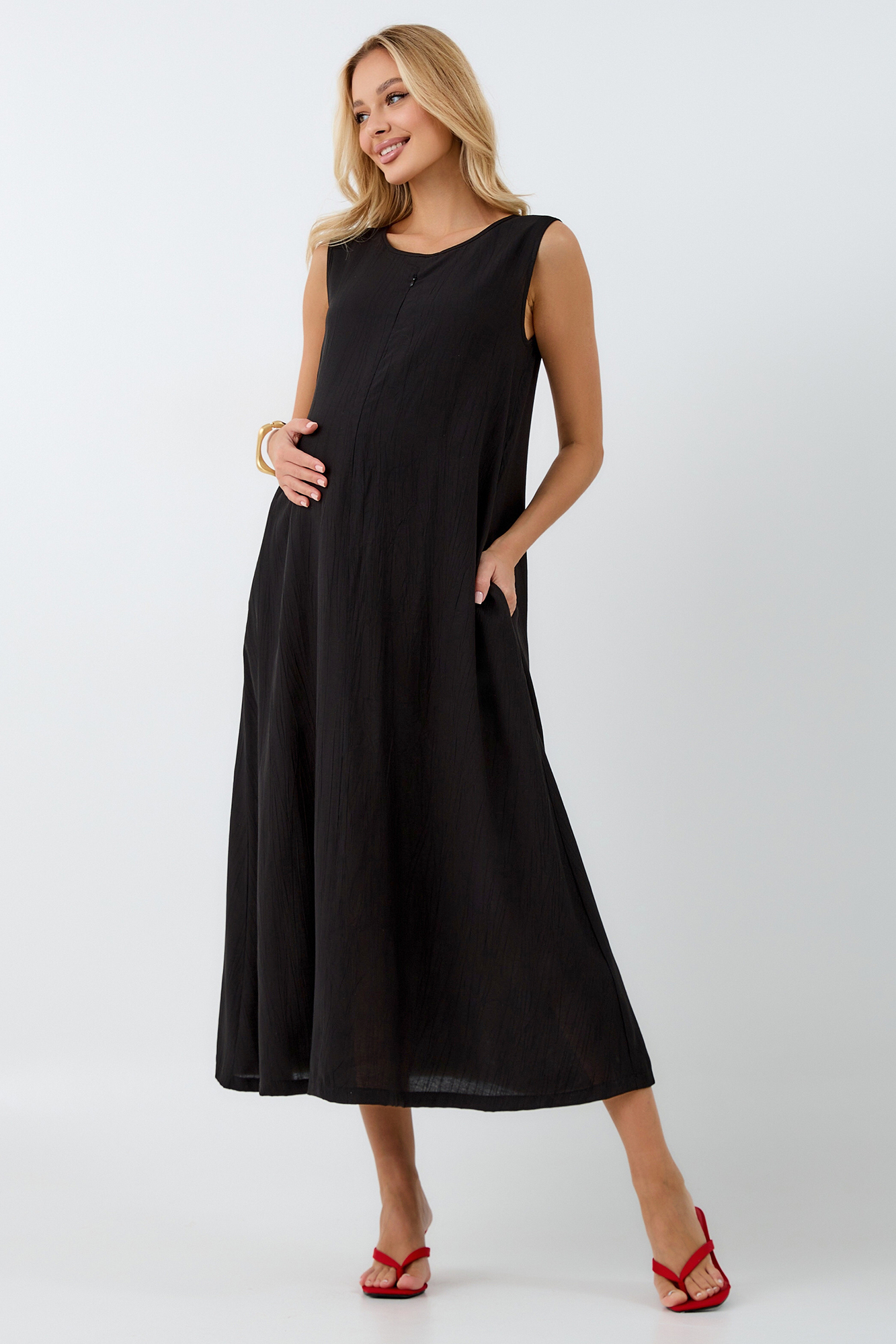 Платье для беременных, выполненное из высококачественной премиальной вискозы с эффектом жатки, подарит вам комфорт и безупречный внешний вид на протяжении всей беременности и после. Длинное платье макси с округлым вырезом горловины и без рукавов идеально подходит для теплых летних дней, а приталенный силуэт, подчеркиваемый резинкой под грудью и по спинке, выгодно акцентирует фигуру.