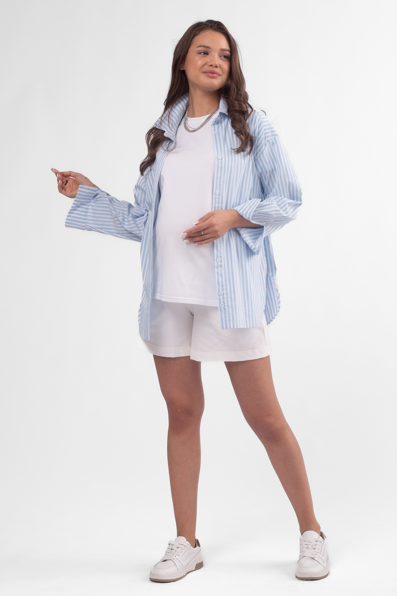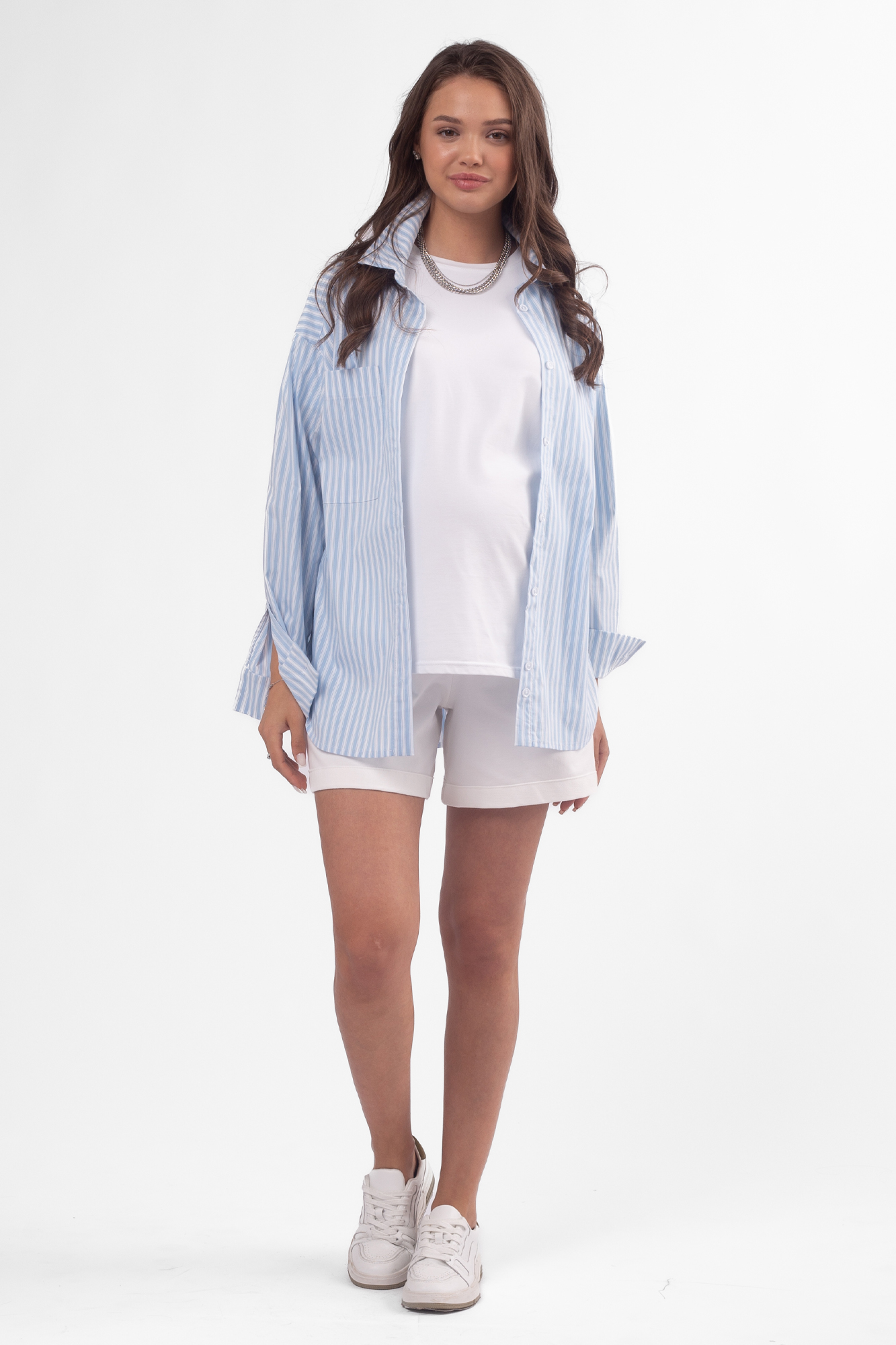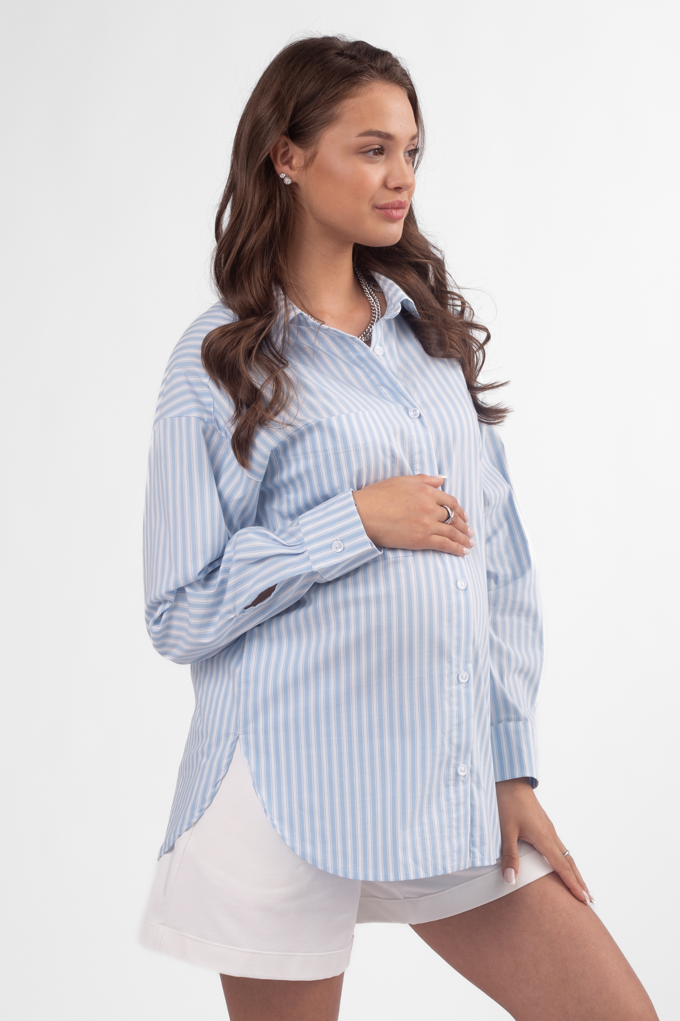 Классическая рубашка для беременных имеет прямой крой, спущенную линию плеча, отложной воротник, а также на груди добавлены карманы. Рубашка прекрасно подойдет на любом сроке беременности, а также станет отличным подойдет в период после родов. Базовая рубашка – модный элемент гардероба, который сочетается с джинсами, брюками, юбками и может использоваться как второй слой на футболку, майку или платье. Рубашка подойдет для офиса, мероприятий и встреч с друзьями.