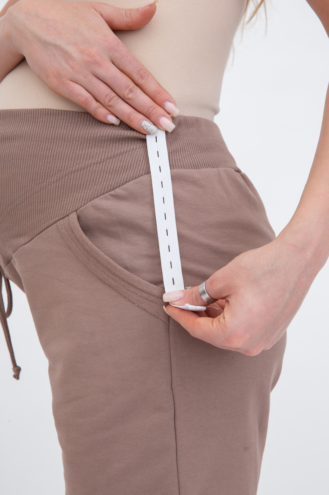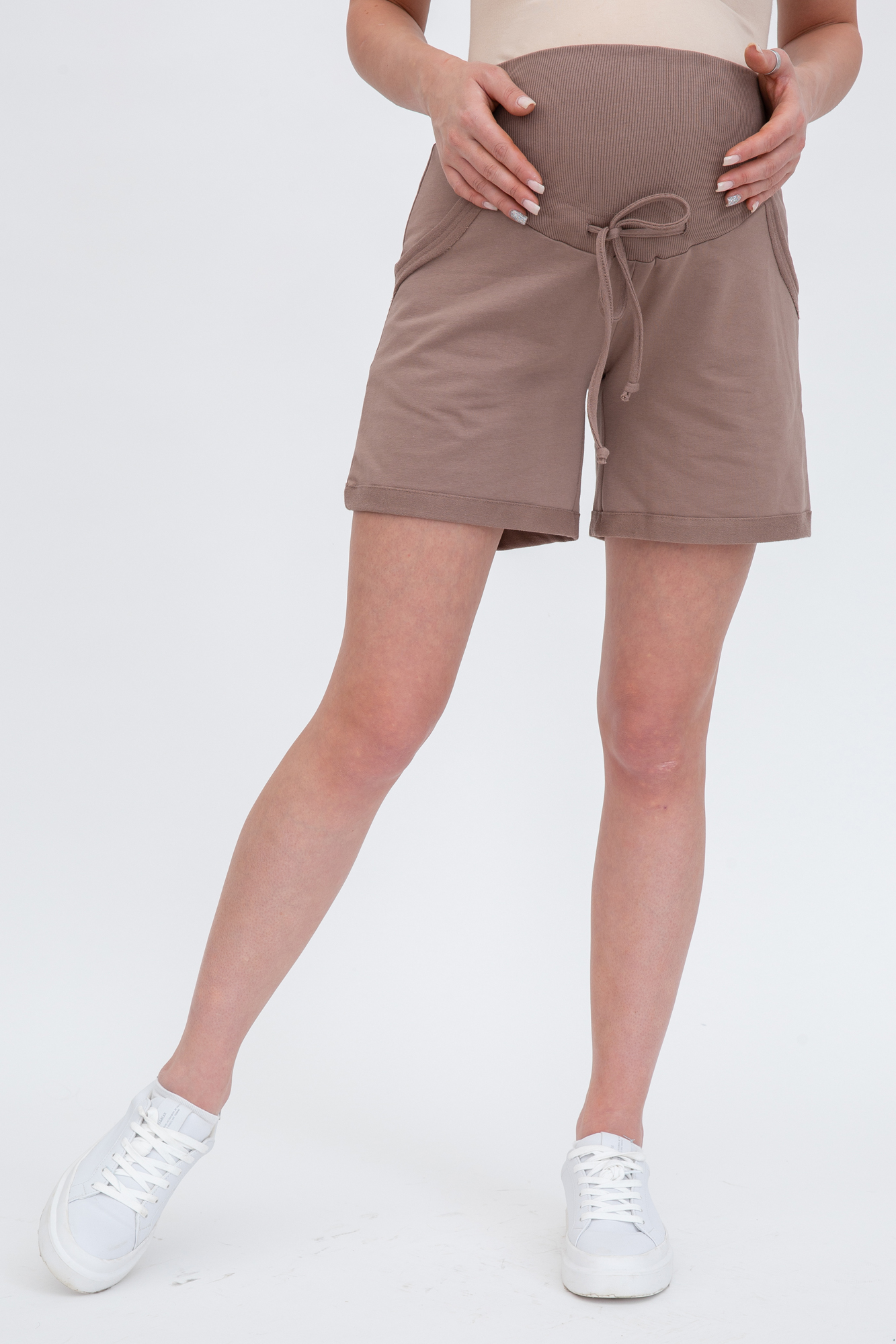 Стильные шорты из футера для беременных. Высокий эластичный бандаж мягко и деликатно поддерживает растущий животик. Объем регулируется шнурками в поясе и перфорированной резинкой, перестегивающейся на пуговицу, что позволяет носить брюки от начала до конца беременности и после родов. Невероятно комфортная модель для прогулок, занятий спортом и просто на каждый день.