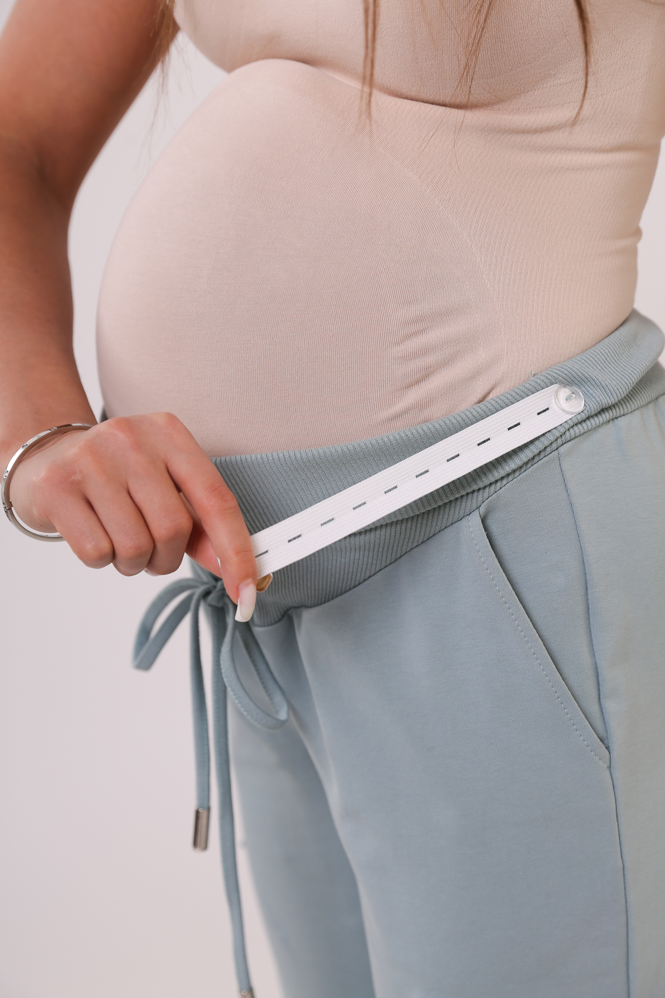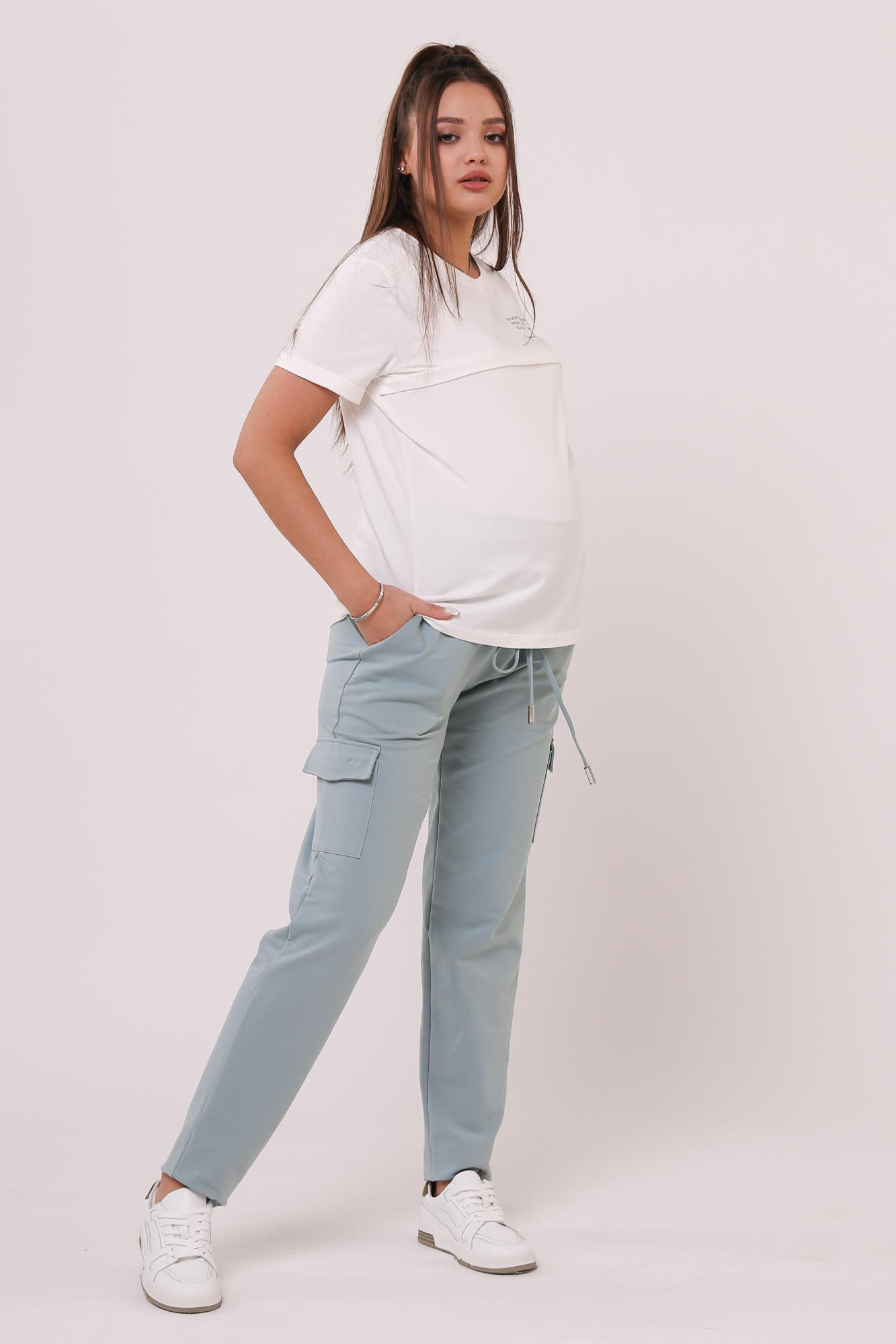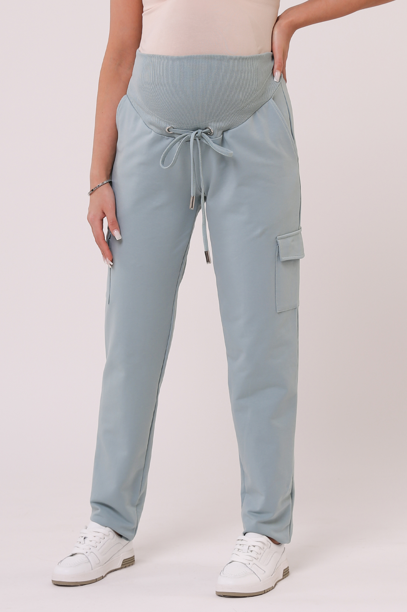Зауженные спортивные брюки из высококачественного двухниточного футера для беременных. Высокий эластичный бандаж мягко и деликатно поддерживает растущий животик. Объем регулируется шнурками в поясе и перфорированной резинкой, перестегивающейся на пуговицу, что позволяет носить брюки от начала до конца беременности и после родов. Невероятно комфортная модель для прогулок, занятий спортом и просто на каждый день.