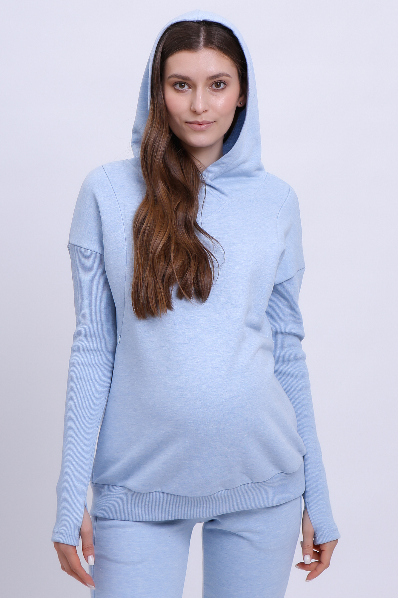 Спортивный костюм для беременных и кормящих выполнен из высококачественного трехниточного футера (петля). Стильное худи с объемным капюшоном согреет в прохладную погоду. Особый крой позволяет носить изделие на всем протяжении беременности и после нее. Благодаря вертикальным потайным молниям Вы сможете покормить малыша с комфортом в любой ситуации. Брюки с высоким эластичным поясом рассчитаны на любой срок беременности, не сдавливают и поддерживают растущий животик. Объем регулируется с помощью перфорированной резинки, перестегивающейся на пуговицу, продетой в пояс брюк.