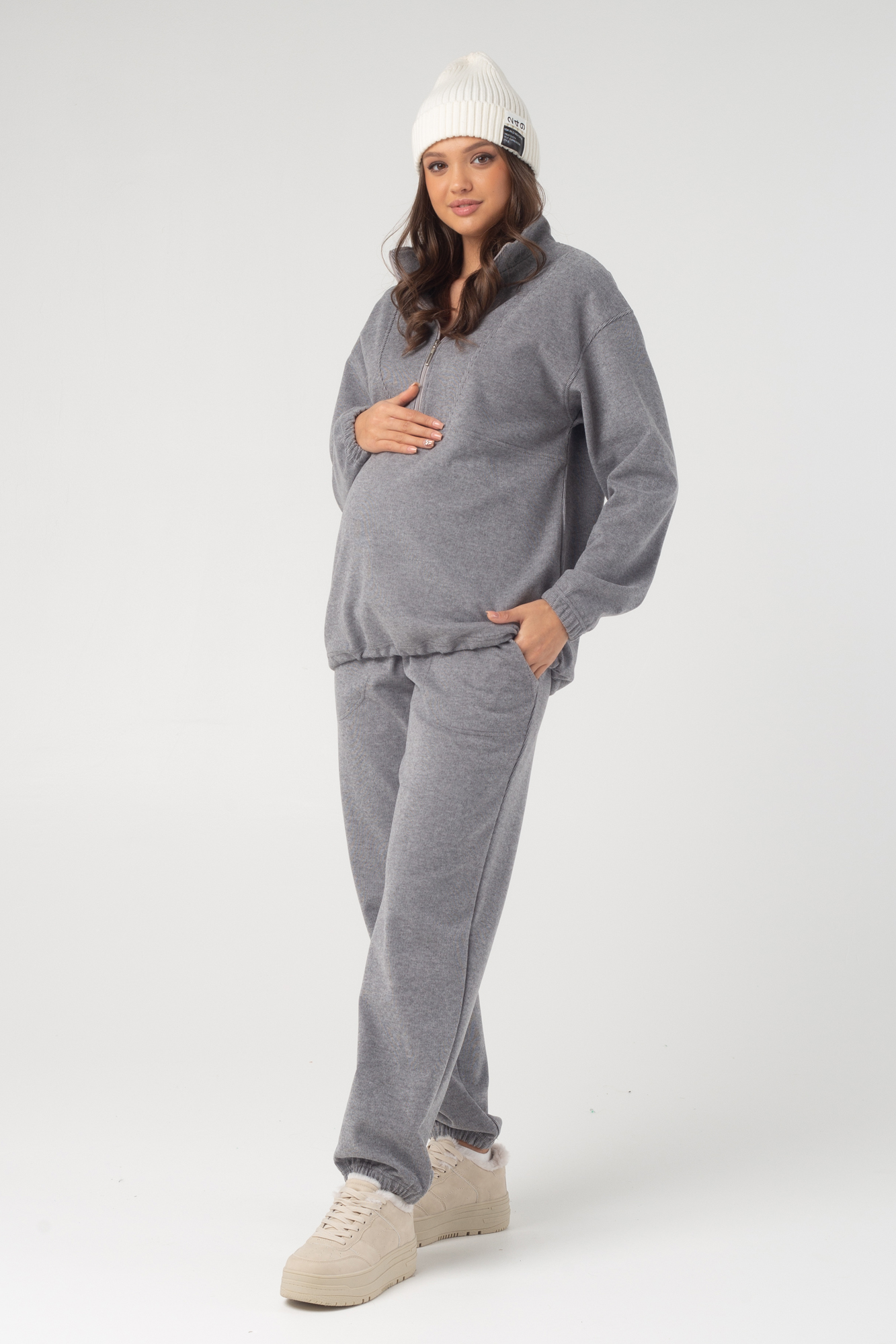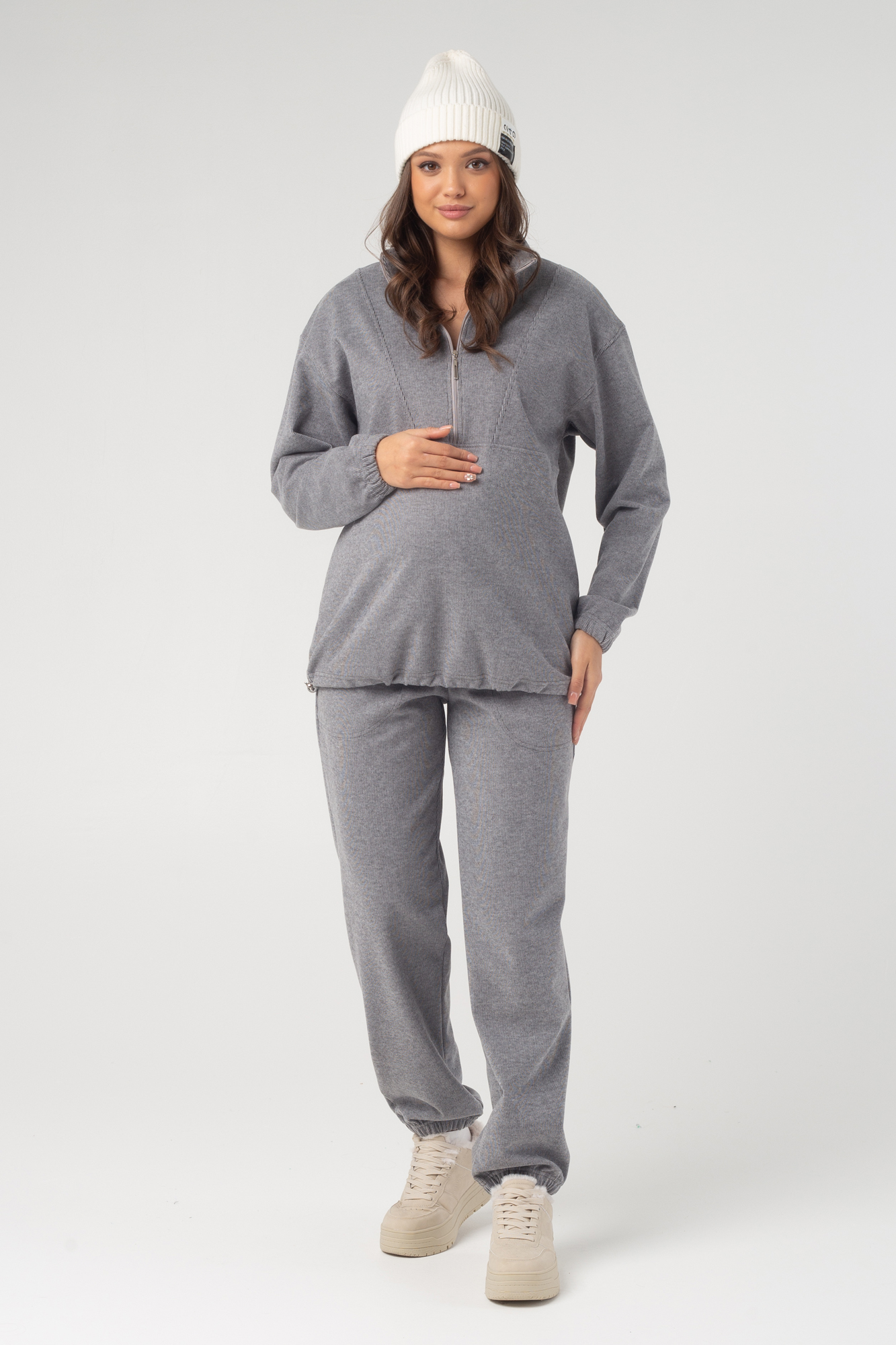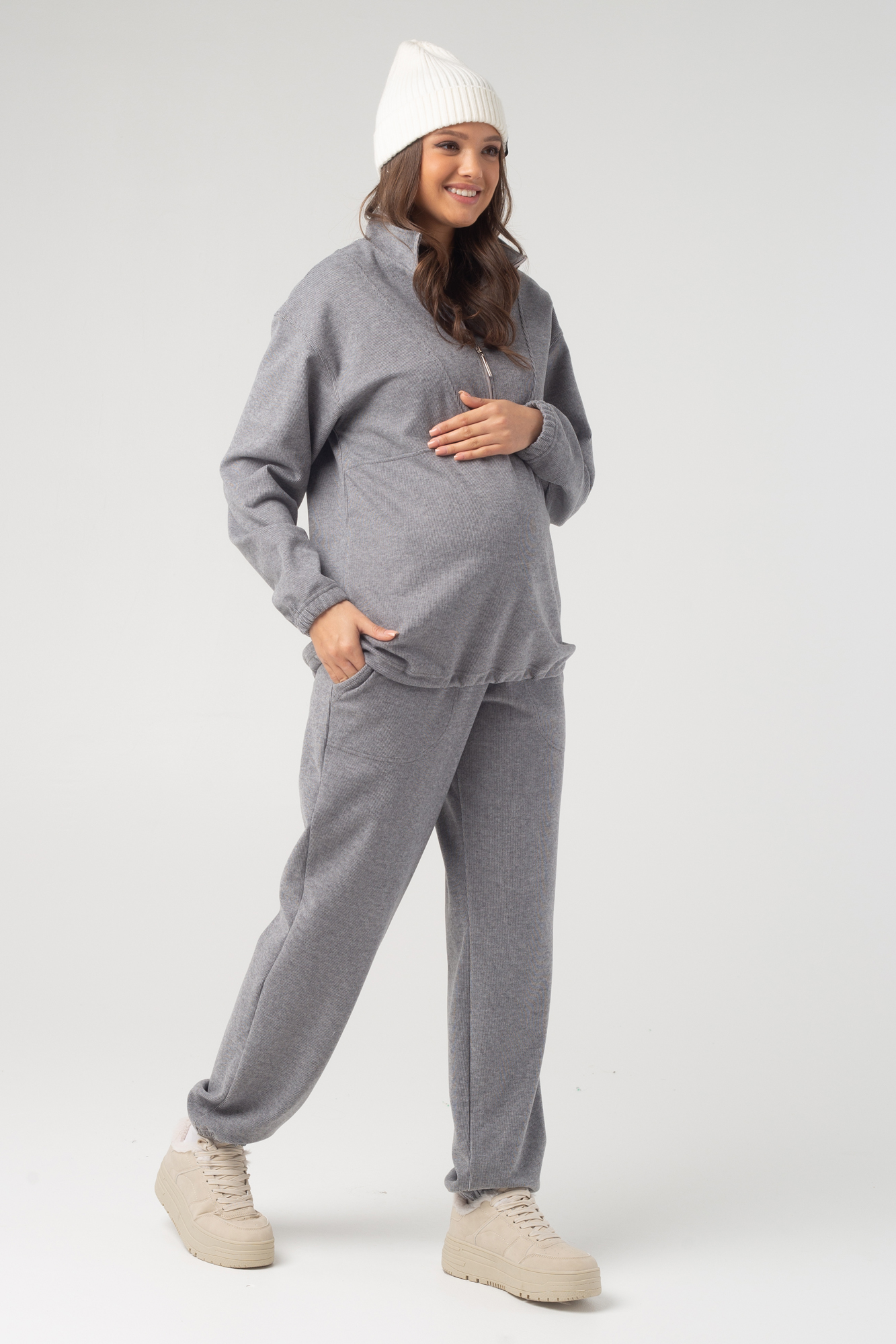 Костюм для беременных выполнен из плотного трикотажного полотна джерси. Брюки джоггеры оснащены высокой эластичной вставкой для живота с возможностью регулировки объема (за счет резинки на пуговице), украшены функциональными боковыми карманами. Свитшот свободного кроя с воротником. Манжеты на резинке. Низ джемпера на утяжках. Для комфортного кормления предусмотрена вертикальная молния. Стильный костюм подходит для ношения на любом месяце беременности и после родов. Костюм из трикотажа идеальный вариант повседневного образа для будущей мамы на прохладную осень.