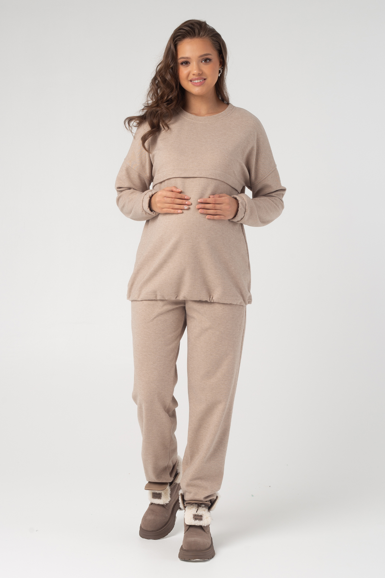 Костюм для беременных сшит из премиального плотного мягкого экокашемира. Ткань смотрится стильно, хорошо удерживает тепло и не вызывает раздражения. Брюки джоггеры оснащены высокой эластичной вставкой для живота с возможностью регулировки объема (за счет резинки на пуговице). Свитшот со спущенной линией плеча и рукавами с манжетами на резинке имеет свободный прямой крой. Низ джемпера на утяжках. Потайная горизонтальная молния рассчитана на комфортное кормление малыша. Стильный трикотажный костюм подходит для носки на любом месяце беременности и после родов. Костюм из трикотажа идеальный вариант повседневного образа для будущей мамы на прохладную осень.