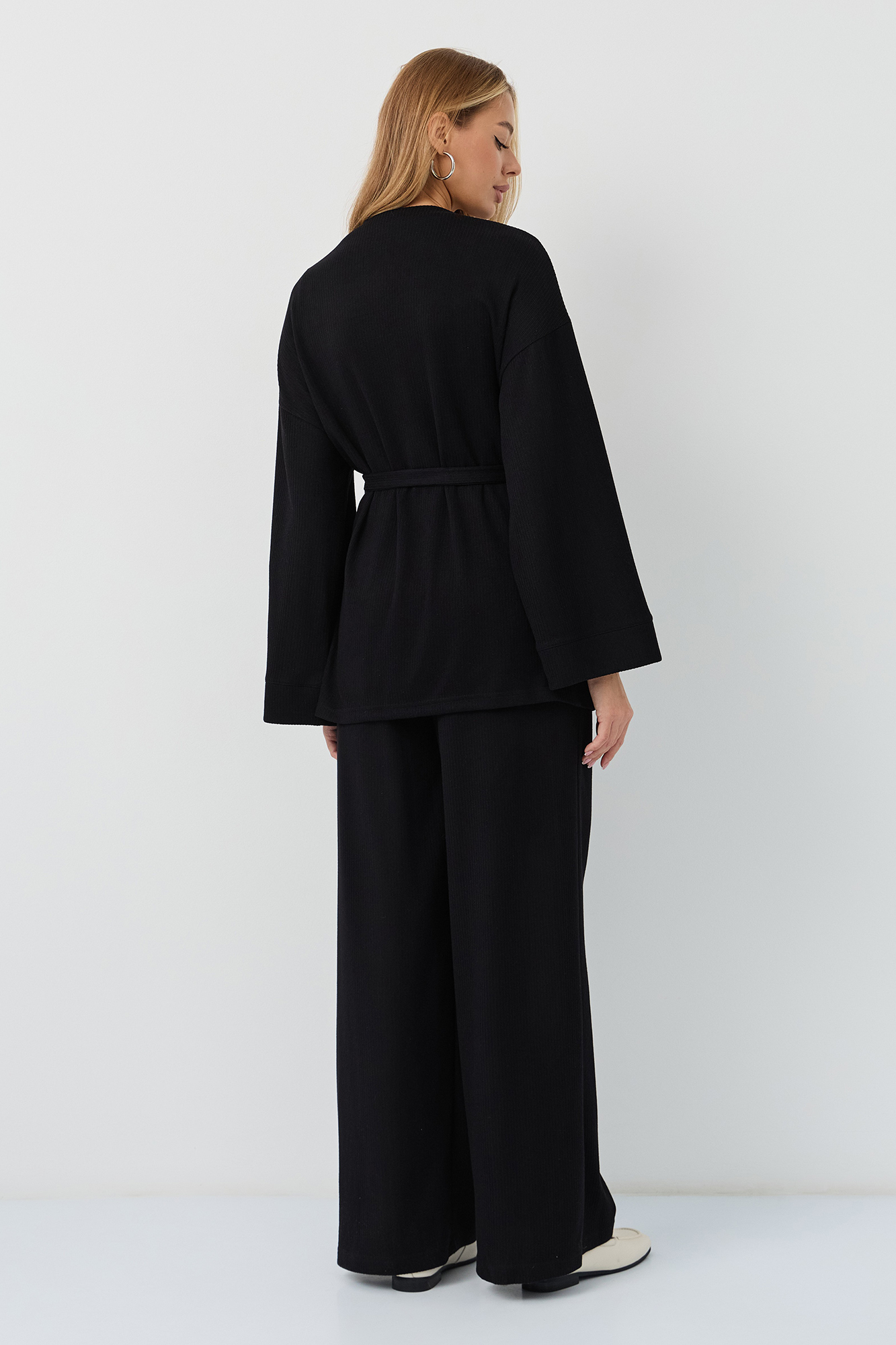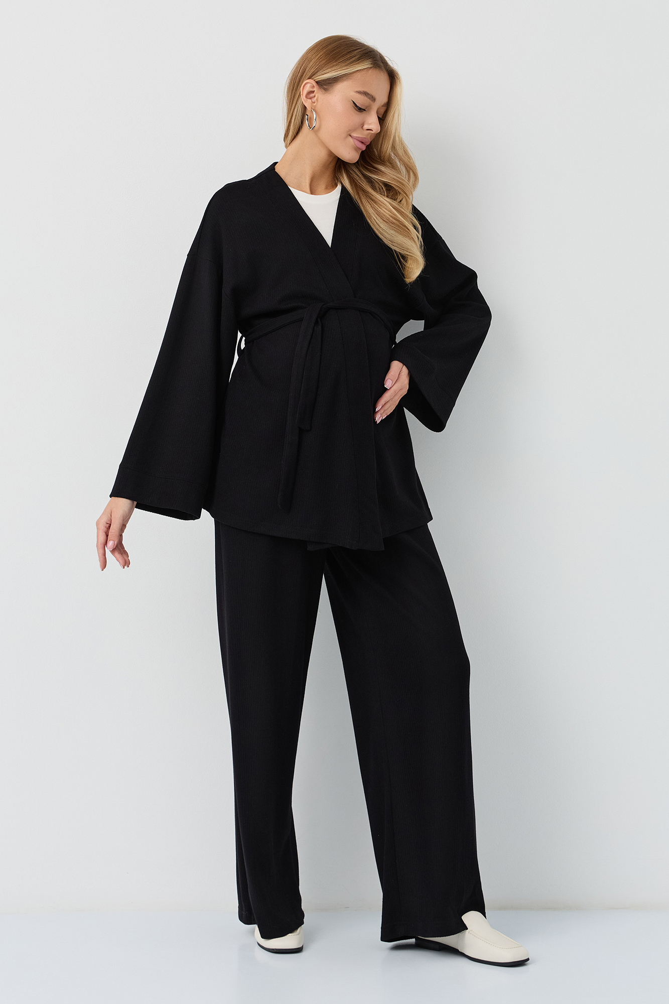Костюм для беременных изготовлен из качественного мягкого трикотажа в рубчик. Фактурная трикотажная ткань с эффектом вельвета приятна на ощупь и гипоаллергенна. Женский брючный костюм - отличный выбор для повседневного образа. В комплект для будущих мам входят кардиган на запах и штаны. К кимоно предусмотрен пояс. Щирокие штаны оверсайз, прямого кроя, с высоким эластичным поясом, который выполняет роль бандажа. Модель рассчитана на весь период беременности: обхват регулируется за счет пуговицы на резинке. Брючный летний костюм для беременных подойдет для прогулок, офиса или носки дома. Стильный костюм двойка - незаменимая одежда для беременных в любое время года. Трикотажный однотонный костюм подходит девушкам и женщинам больших размеров плюз сайз. Состав: 65% Вискоза, 30% Полиэстер, 5% Лайкра. Костюм для беременных - отличный выбор для будущих мам на весну.