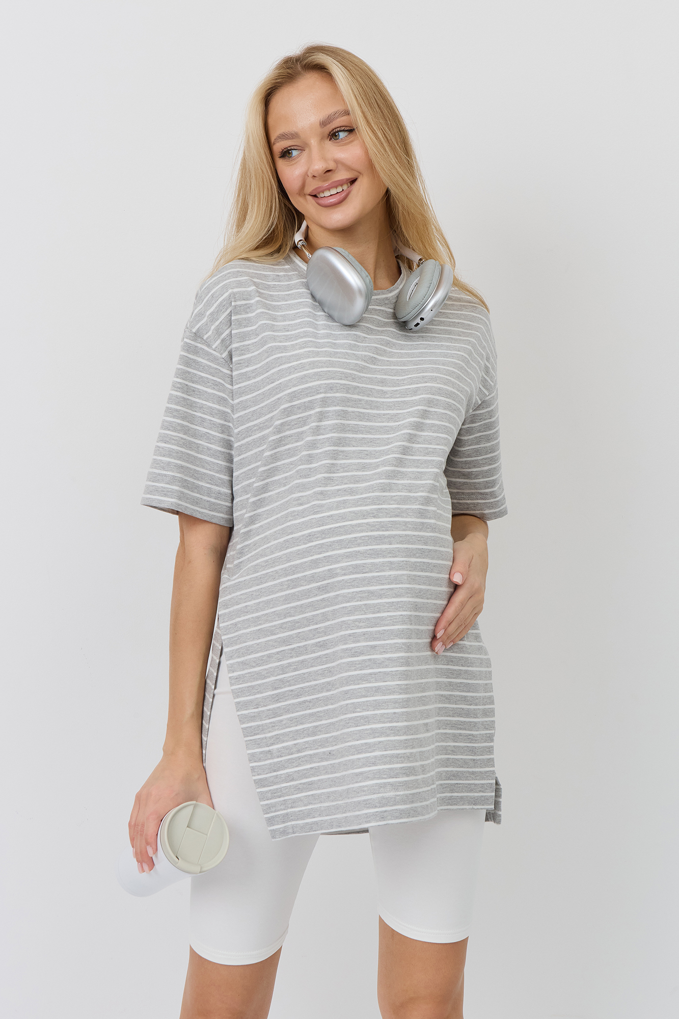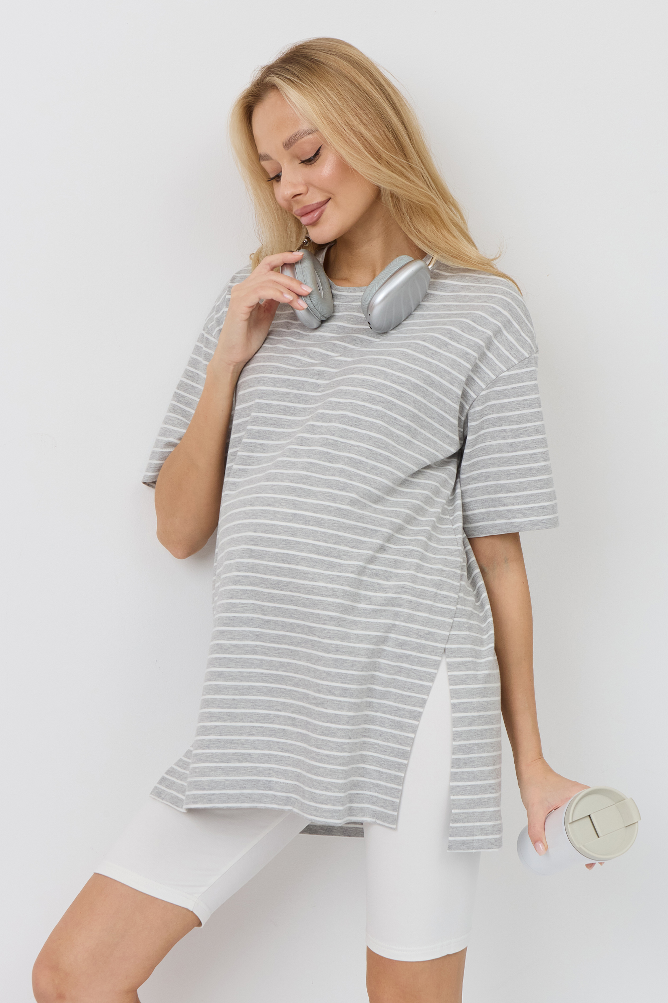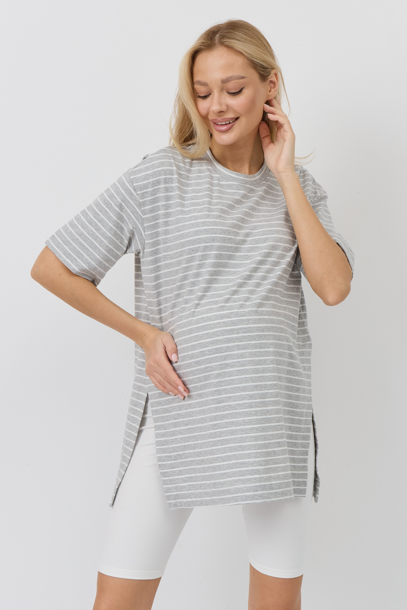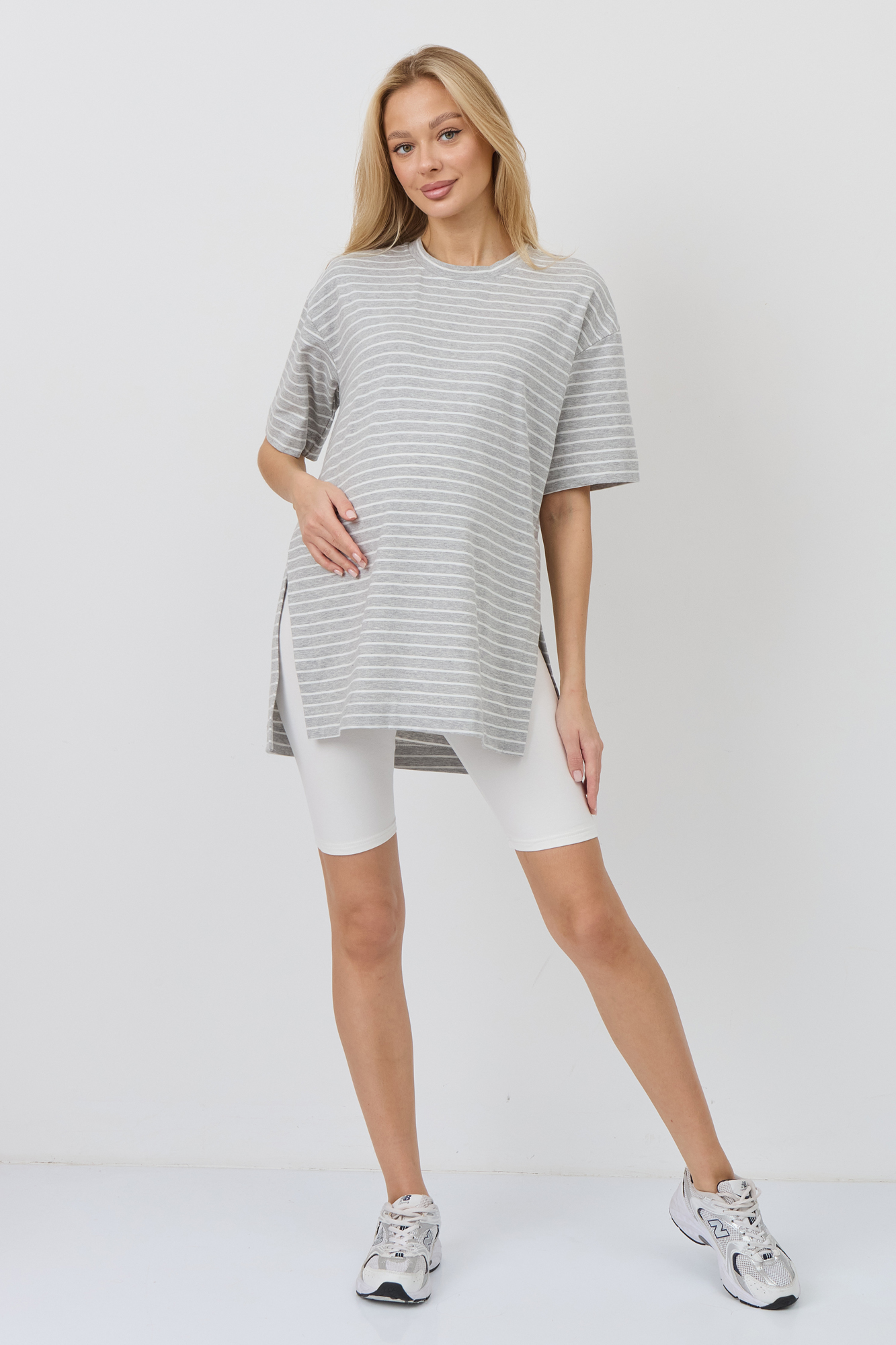 Верх комплекта — футболка оверсайз из кулирки свободного кроя, которая не сковывает движения и обеспечивает максимальный комфорт. Благодаря расслабленному силуэту она красиво садится по фигуре и не стесняет растущий животик. Универсальный фасон позволяет носить её навыпуск или частично заправленной, создавая разные варианты образов.