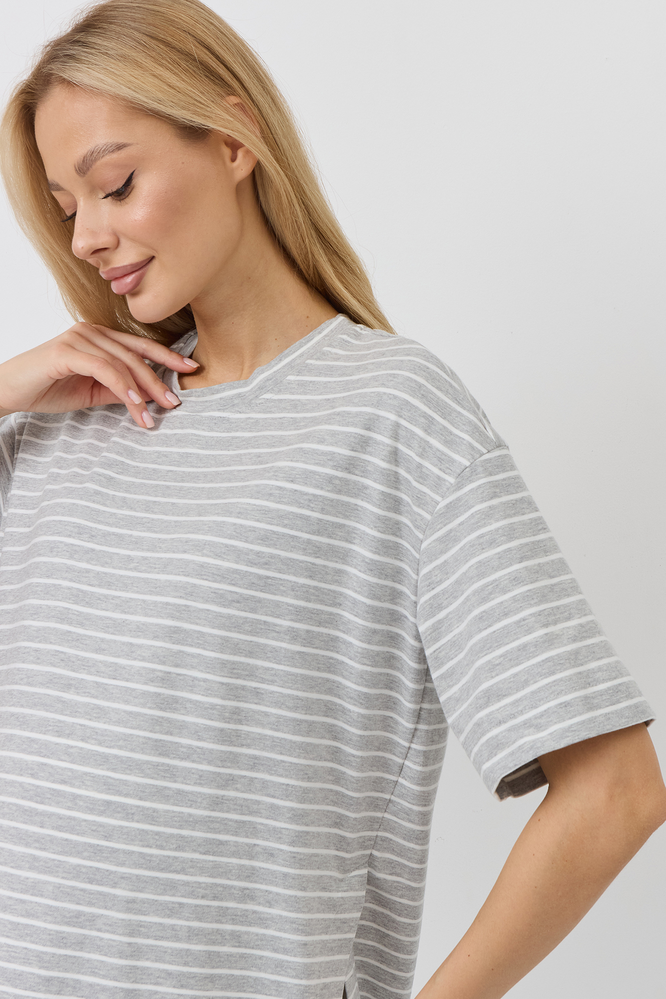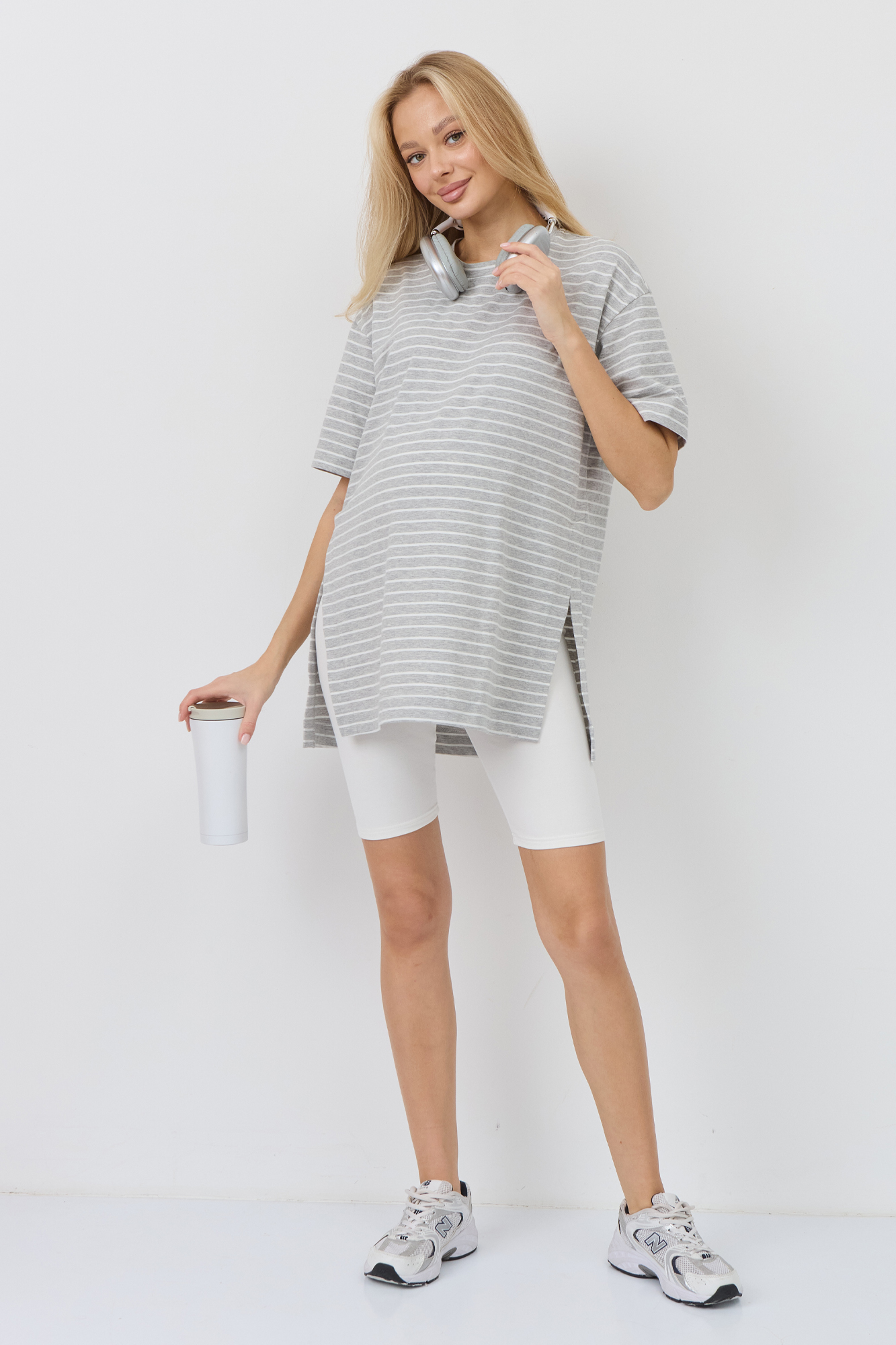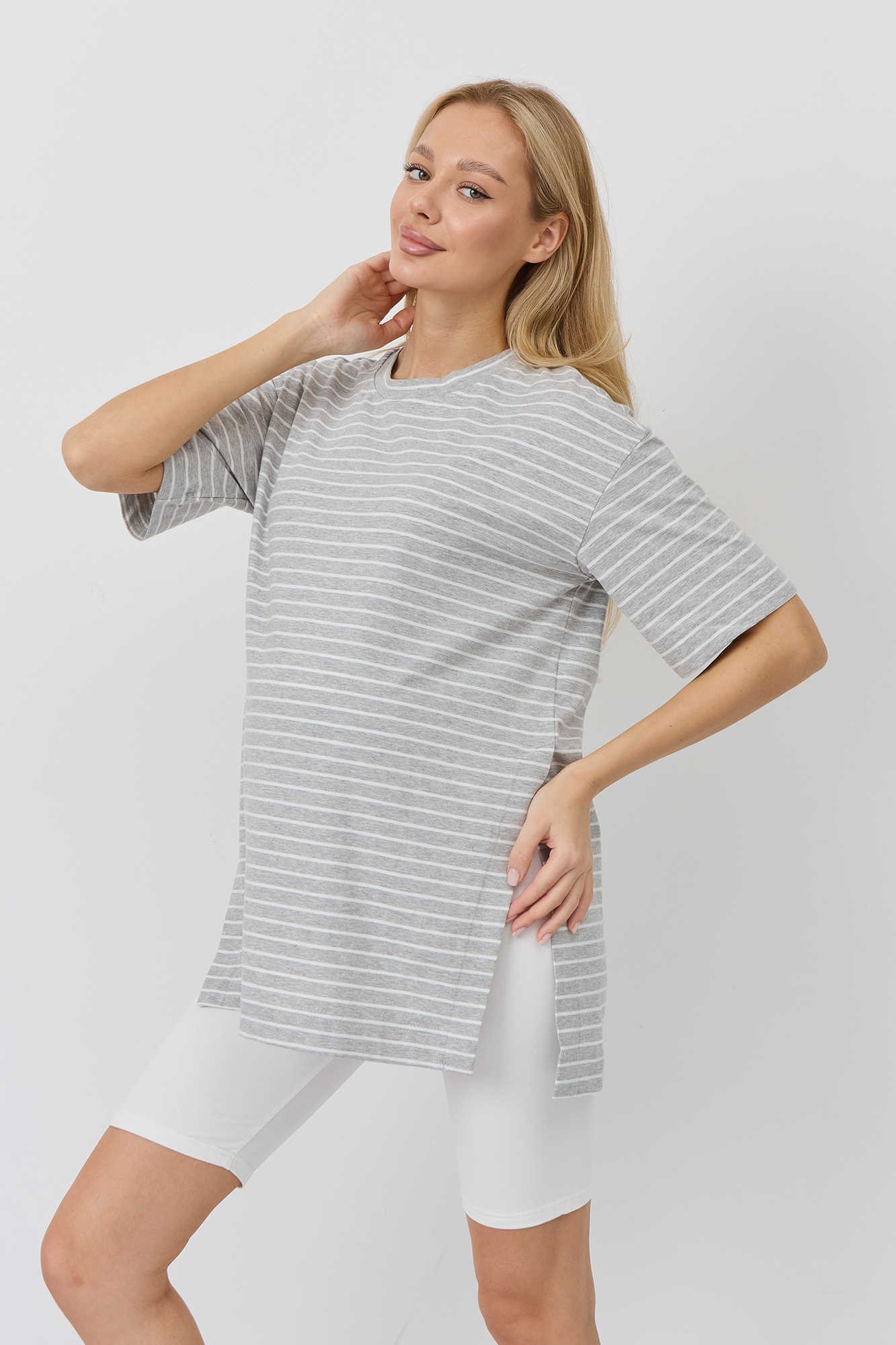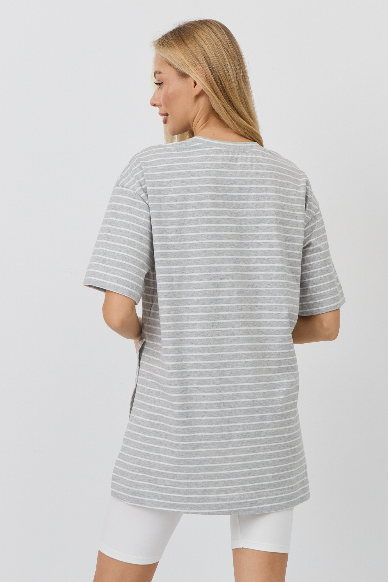 Верх комплекта — футболка оверсайз из кулирки свободного кроя, которая не сковывает движения и обеспечивает максимальный комфорт. Благодаря расслабленному силуэту она красиво садится по фигуре и не стесняет растущий животик. Универсальный фасон позволяет носить её навыпуск или частично заправленной, создавая разные варианты образов.