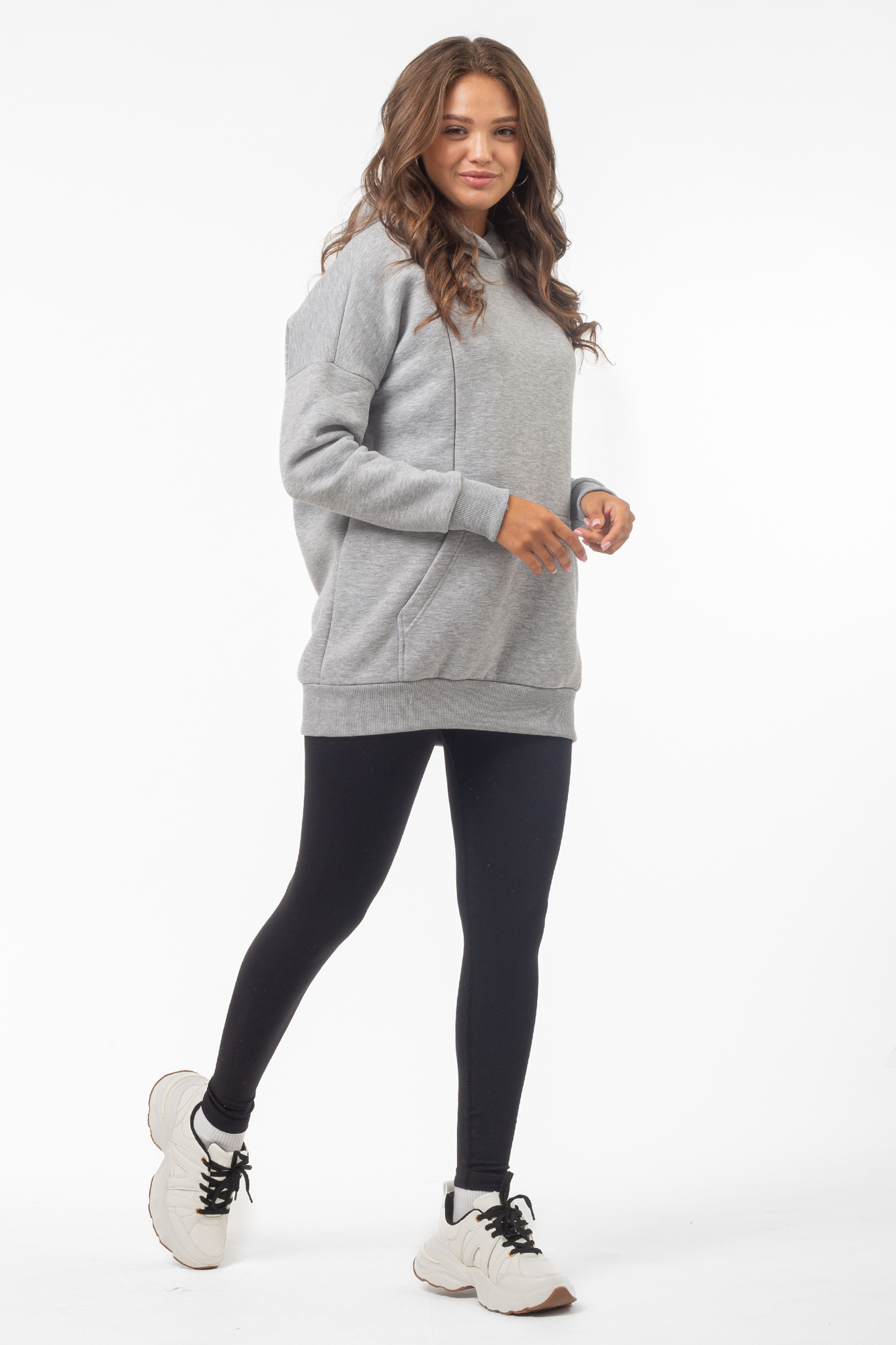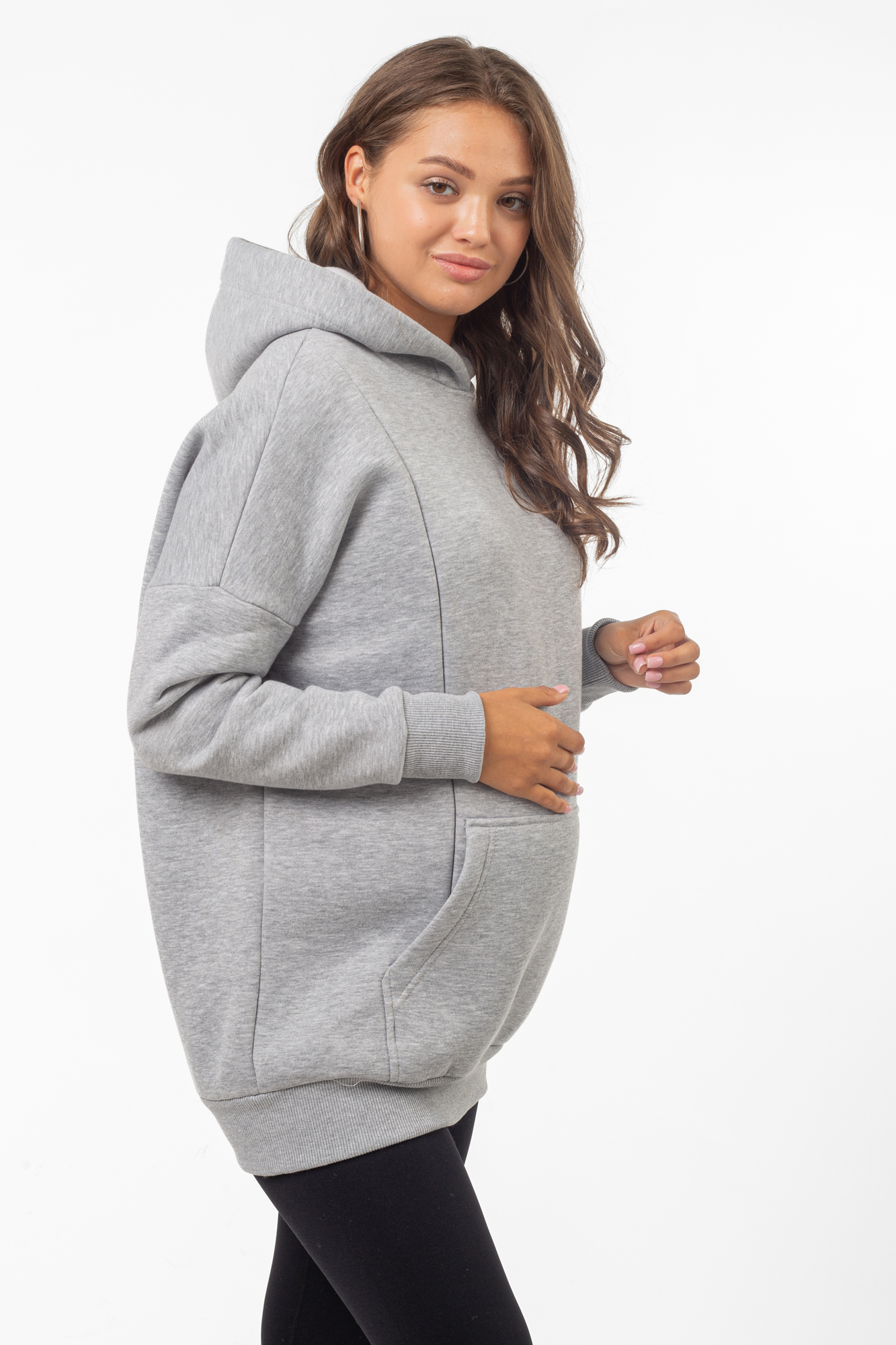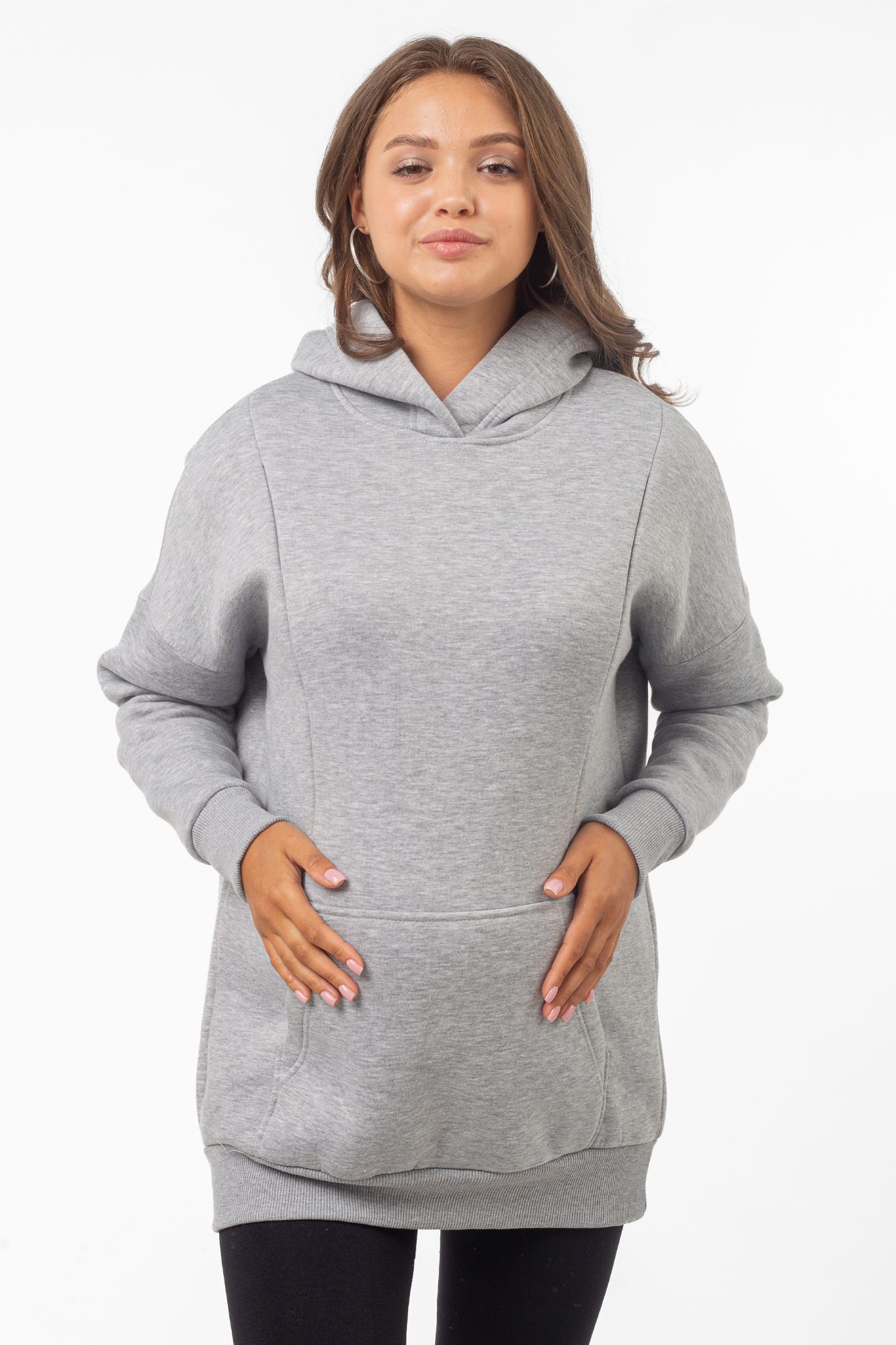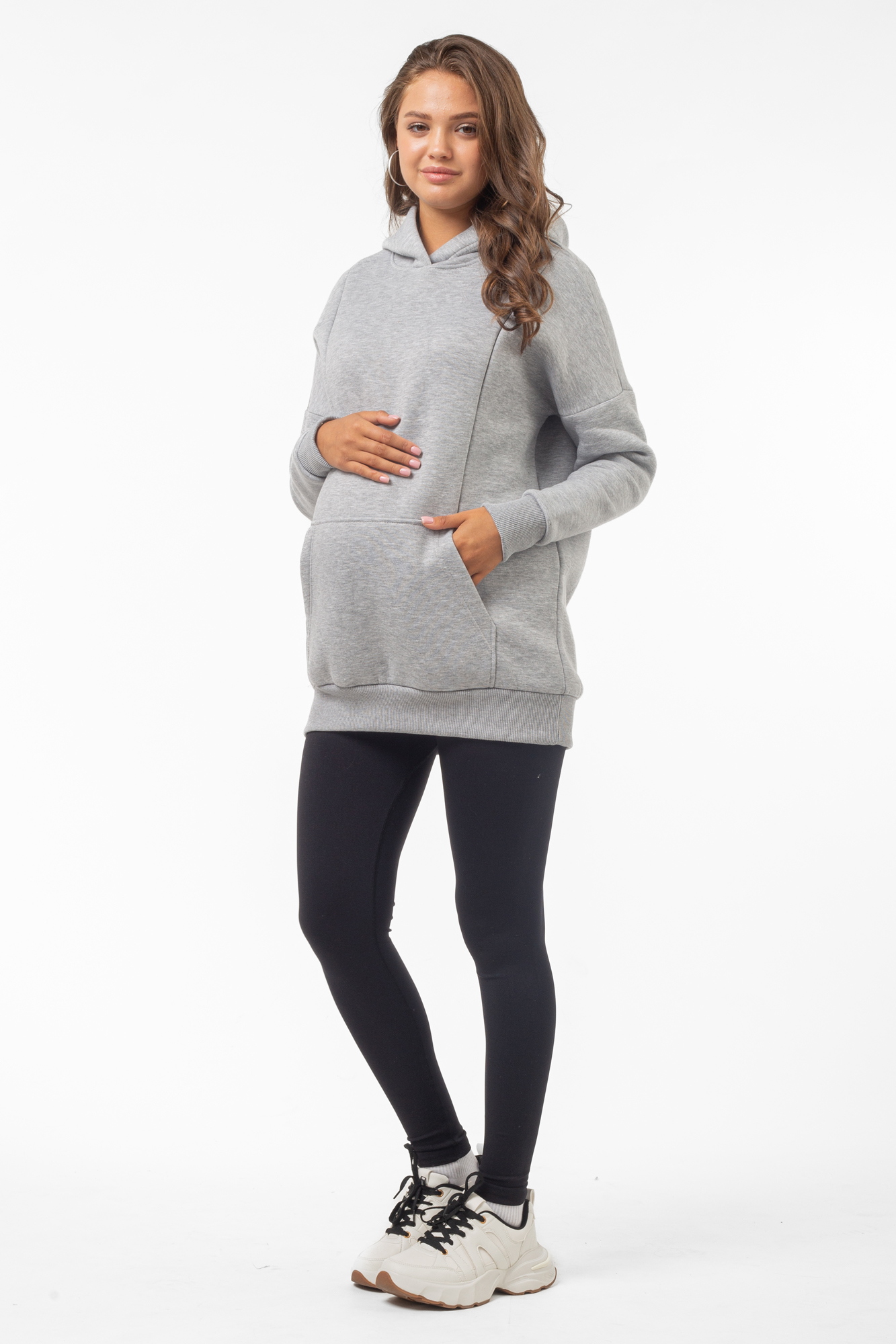 Базовая толстовка для беременных и кормящих женщин выполнена из качественного трехниточного футера с начесом. Фасон изделия по последним трендам: свободный крой оверсайз, средняя длина, длинный рукав на манжете и капюшон. На животе предусмотрен вместительный карман-кенгуру. Худи дополнит женский гардероб на любом сроке беременности, а также подойдет кормящим мамам: по бокам вшиты скрытые молнии для комфортного кормления малыша. Сочетать толстовку можно с большинством повседневных женских вещей - джинсами и леггинсами, футболками и майками, курткой и плащом. Вещь подойдет для ежедневного ношения, занятий спортом, путешествий и отдыха. В размерной линейке представлены стандартные размеры.
