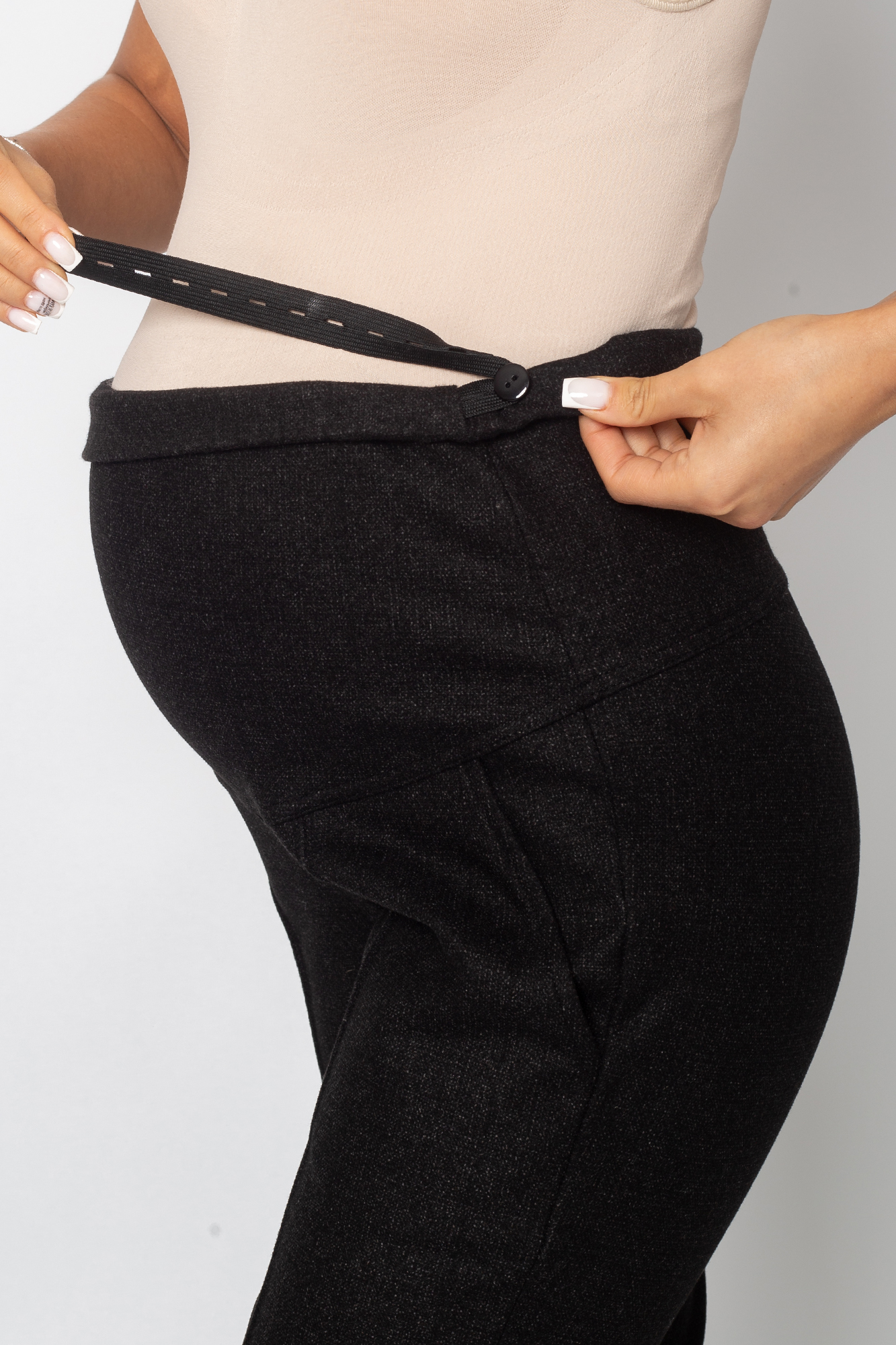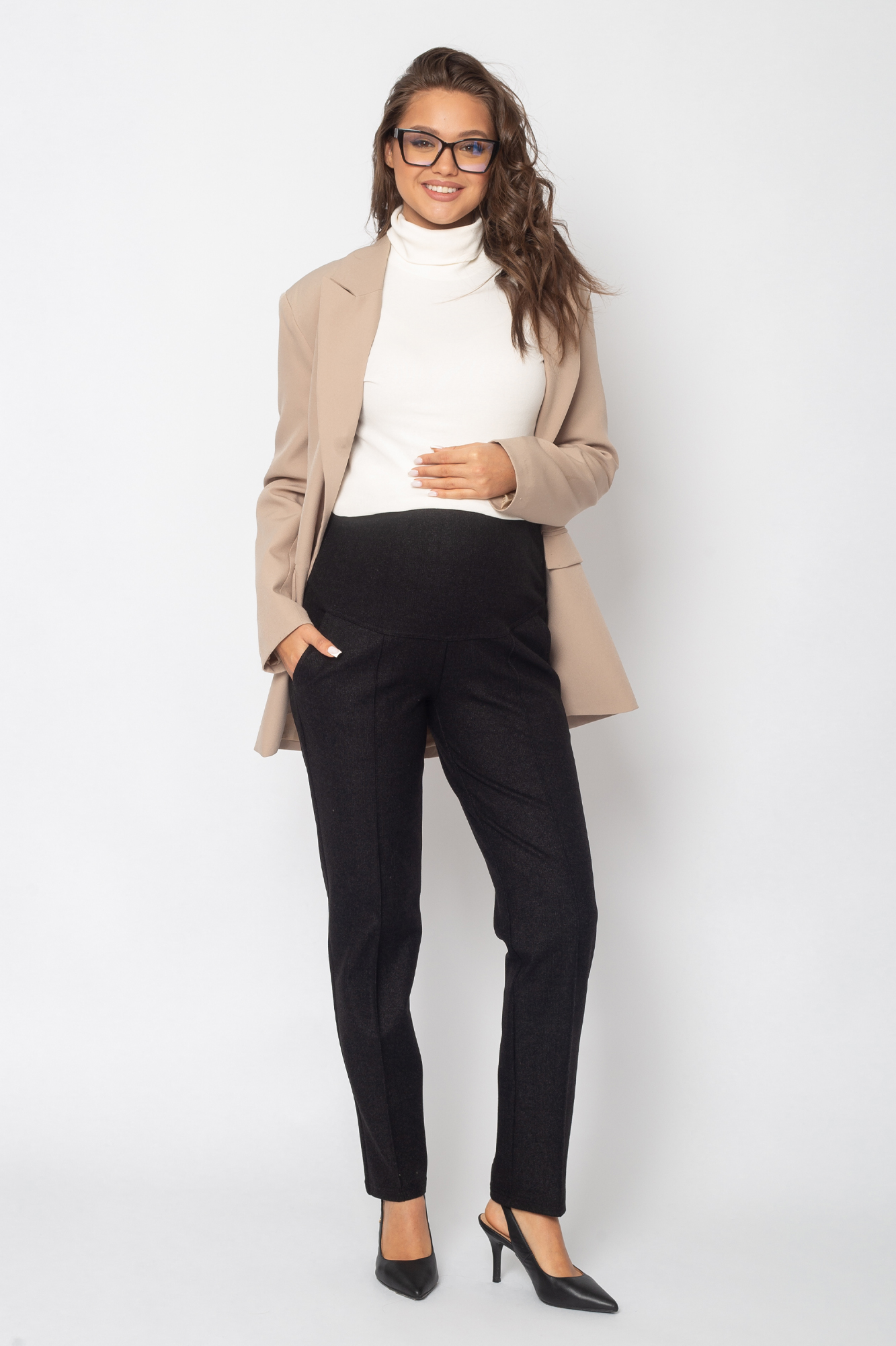 Зауженные брюки для беременных сшиты из теплого трикотажа джерси с начесом. Состав: 65% Вискоза 30% Полиэстер 5% Лайкра. Стильная трикотажная модель для повседневного гардероба будущей мамы. Женские зимние брюки с завышенной талией оснащены поясом, выполняющим функцию бандажа. Пояс можно регулировать по мере роста животика с помощью скрытой резинки на пуговице. Такие штаны подойдут на любой срок беременности, а также и после нее. Крой брюк зауженный, спереди - отстроченные стрелки, высокая посадка. Предусмотрены карманы. Классические брюки отлично подходят для повседневных прогулок холодной осенью или зимой. В них будет комфортно в любую погоду или для офиса. Модель подойдет в качестве одежды женщинам больших размеров.