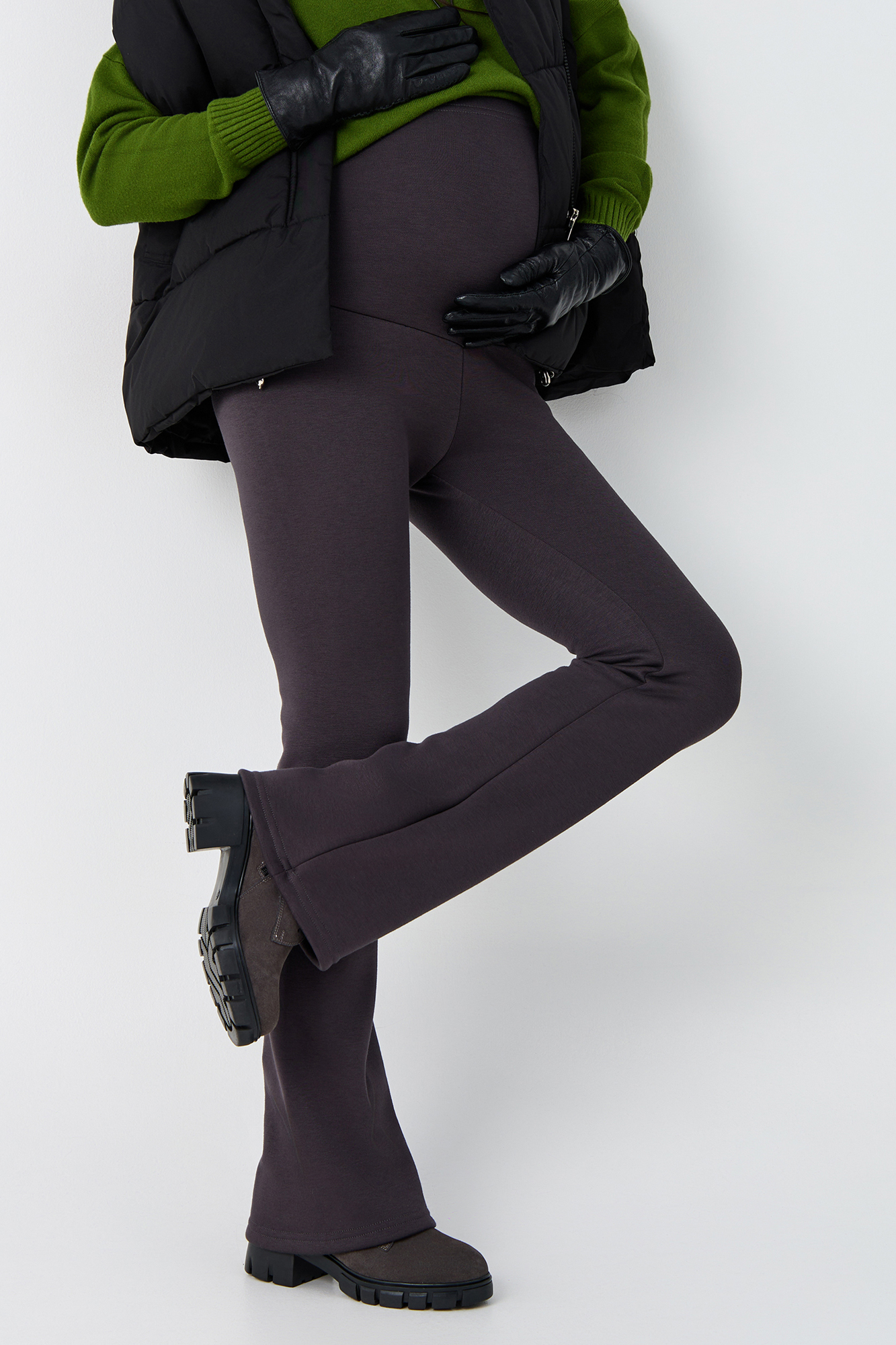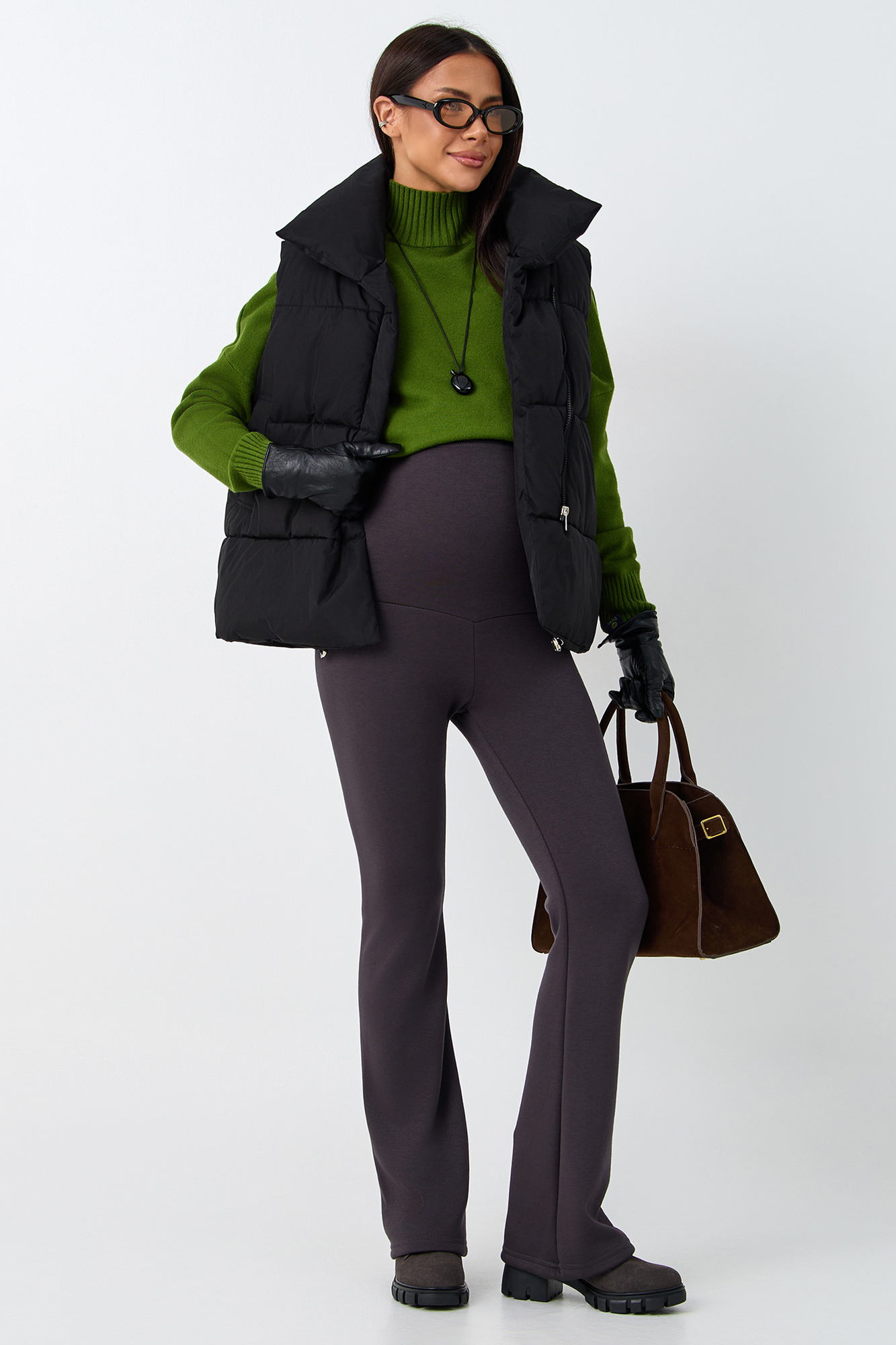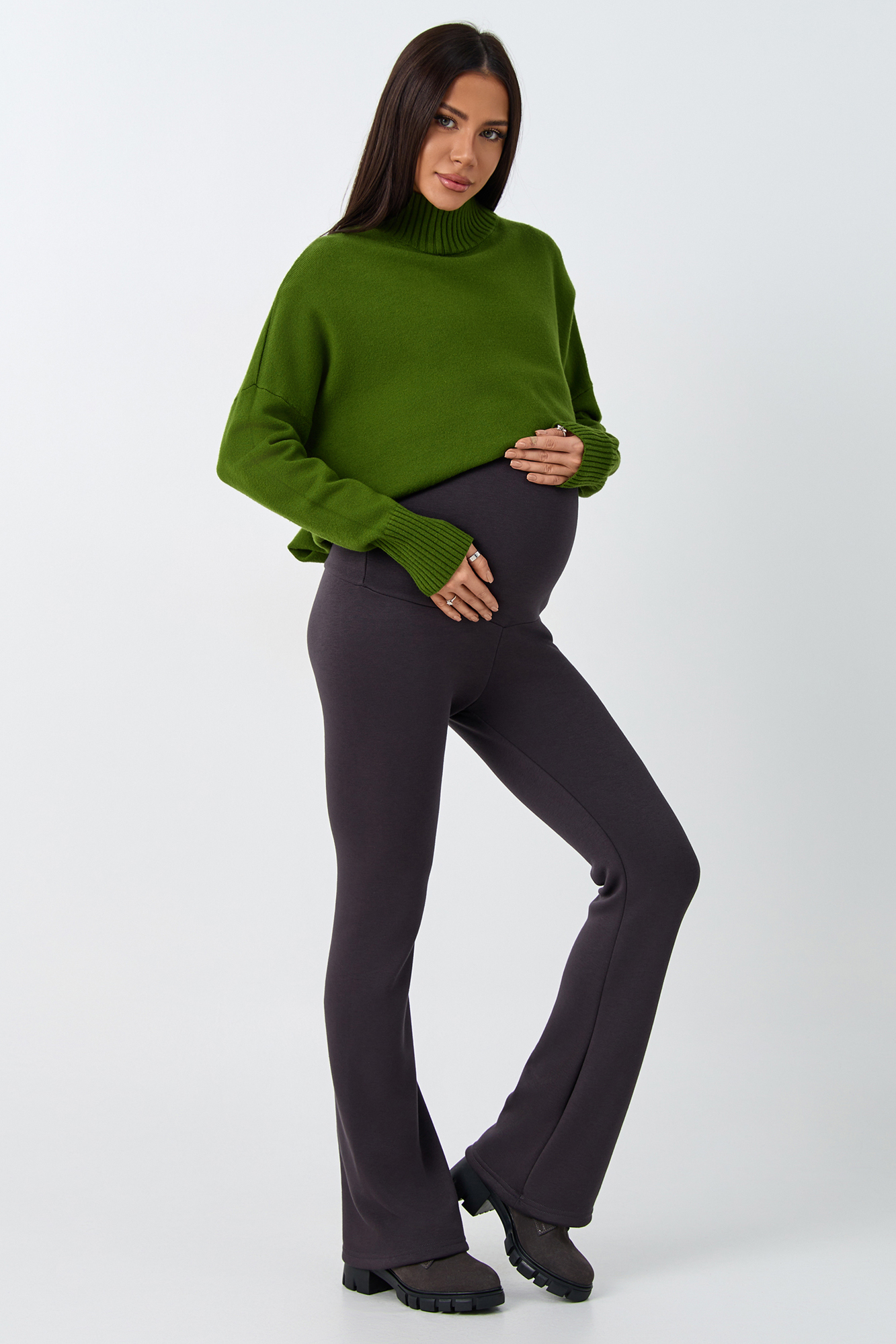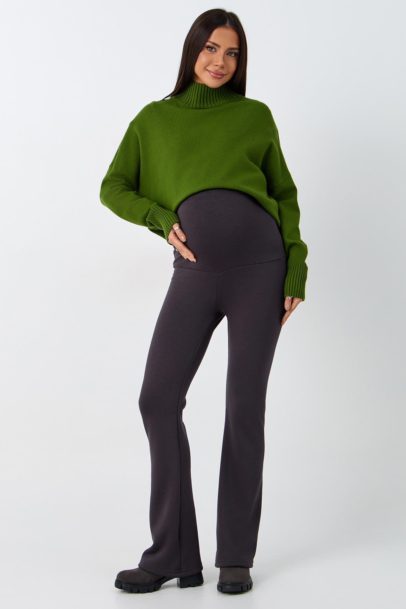 Брюки для беременных на меху клеш выполнены из плотного премиального джерси, утепленного с изнанки искусственным мехом. Зимние штаны оснащены эластичным широким бандажом, который позволит чувствовать себя комфортно на любом сроке беременности, а так же и после неё. Трикотажную вставку изделия можно отрегулировать с помощью утягивающей резинки, фиксирующейся на пуговицу. Комфорт и идеальная посадка обеспечены на протяжении всей беременности, а так же после родов. Универсальные облегающие брюки клеш для будущих мам можно носить в офис, на прогулку, использовать для повседневной носки. Мягкий мех не осыпается в процессе носки, не линяет, не колется. Базовая модель стрейч дополнена сзади кокеткой и накладными карманами, что создает моделирующий эффект пуш ап. Лосины с утеплением и завышенной талией подходят в том числе для девушек и женщин больших размеров. Стильные теплые брюки можно носить холодной осенью, в демисезон и зимой. Состав: 65% Вискоза 30% Полиэстер 5% Лайкра.