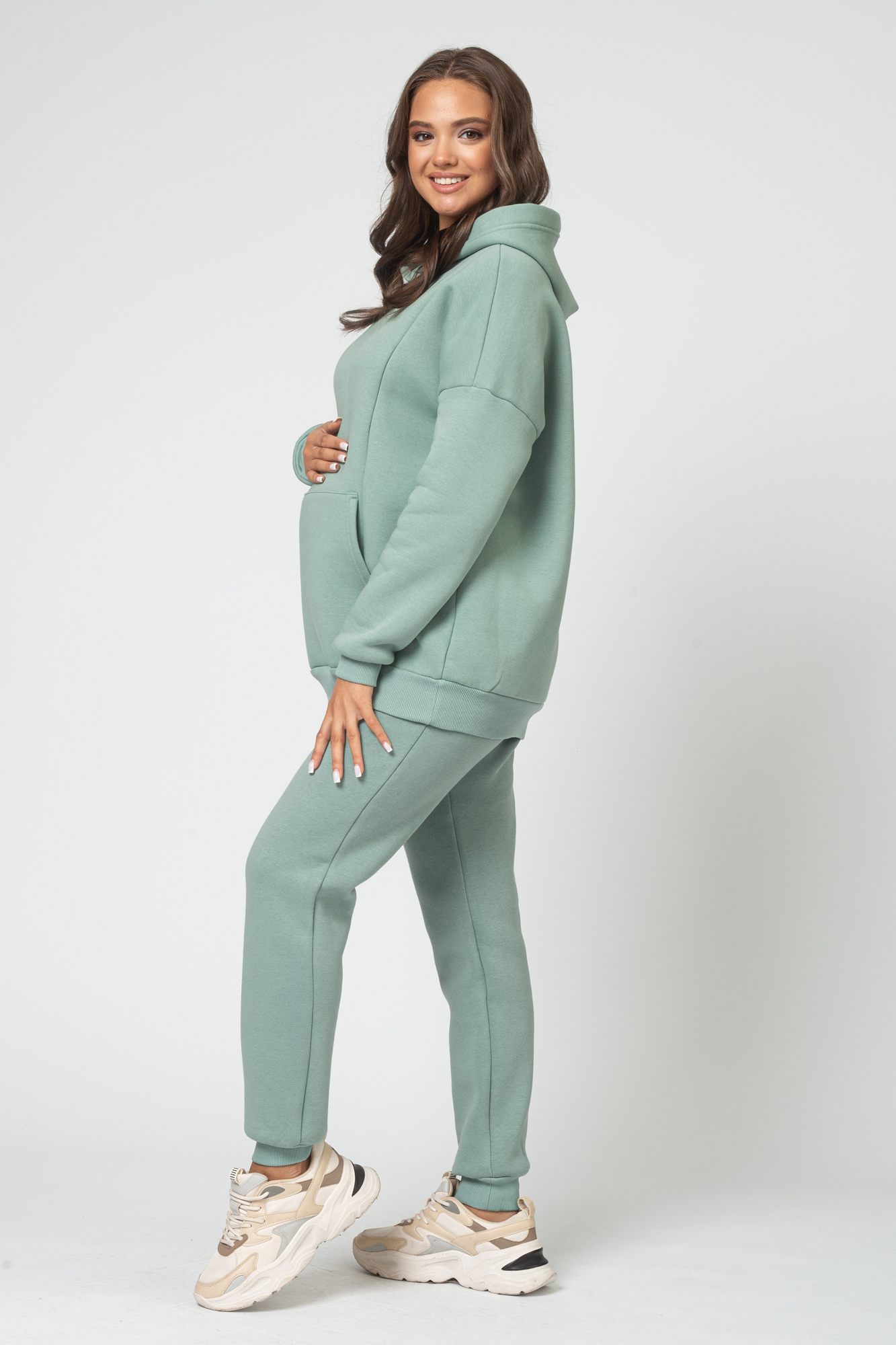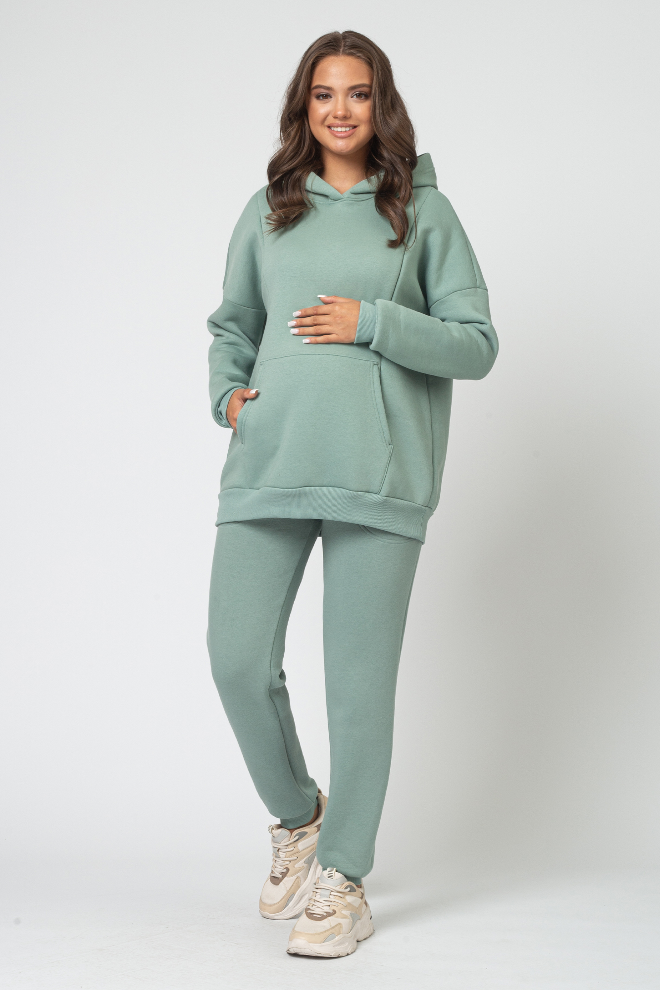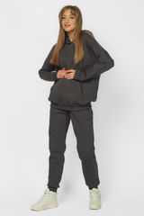 Утепленный спортивный костюм для беременных и кормящих выполнен из высококачественного трехниточного футера с начесом. Стильное теплое худи для будущих мам согреет в прохладную погоду. Особый крой позволяет носить изделие на всем протяжении беременности и после нее. Благодаря диагональным потайным молниям Вы сможете покормить малыша с комфортом в любой ситуации. Брюки с эластичным поясом рассчитаны на любой срок беременности, не сдавливают и поддерживают растущий животик. Объем регулируется с помощью перфорированной резинки, перестегивающейся на пуговицу, продетой в пояс брюк. Костюм подходит для спорта, для прогулок и просто в качестве домашней одежды.
