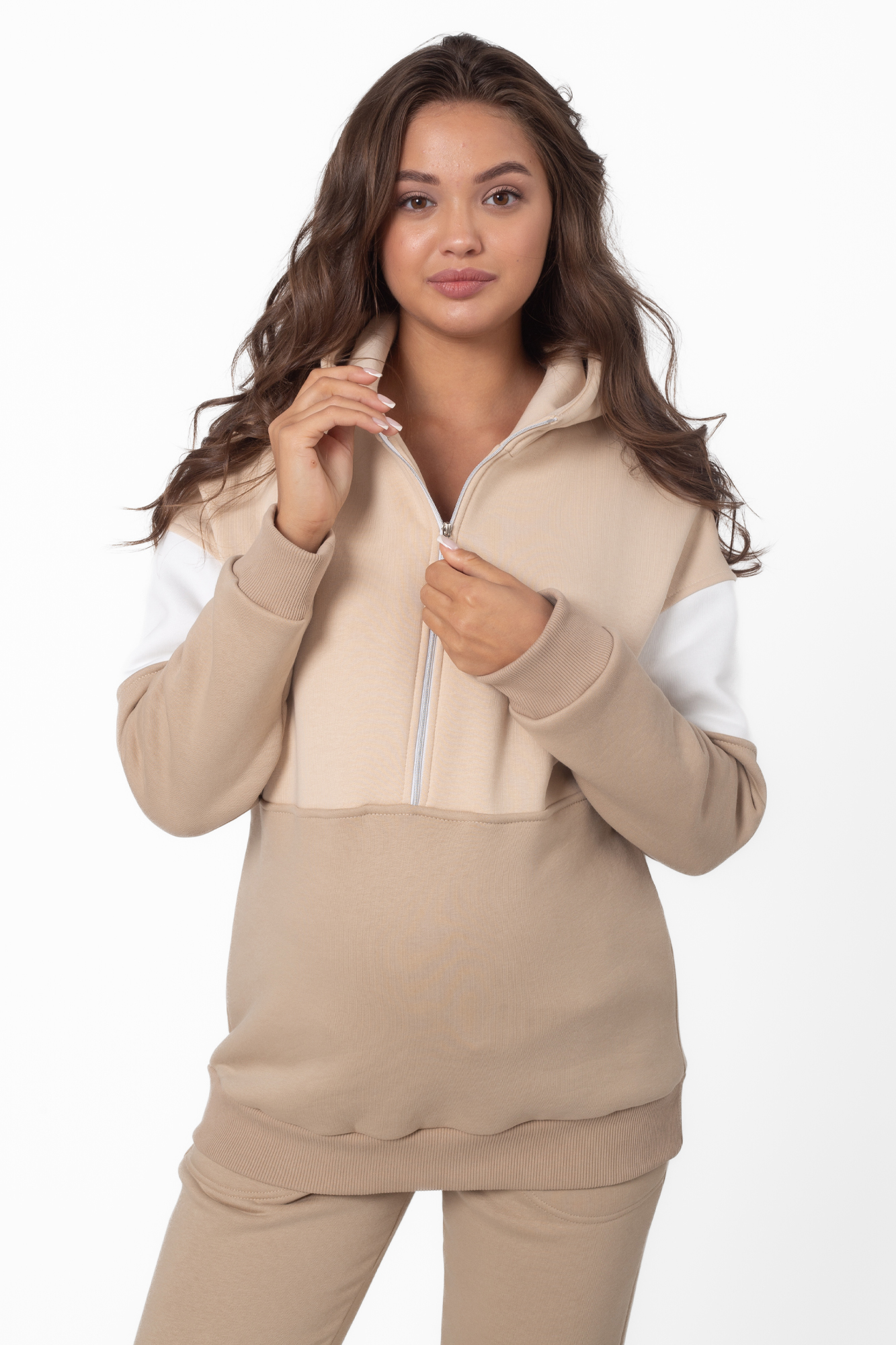 Утепленный спортивный костюм для беременных и кормящих выполнен из высококачественного трехниточного футера с начесом. Худи в стиле колорблок с манжетами по низу изделия и на рукавах. Вертикальная молния на уровне груди позволяет покормить малыша в любой ситуации. Особый крой позволяет носить изделие на всем протяжении беременности и после нее. Брюки с лампасами и эластичным поясом рассчитаны на любой срок беременности, не сдавливают и поддерживают растущий животик. Объем регулируется с помощью перфорированной резинки, перестегивающейся на пуговицу, продетой в пояс брюк.