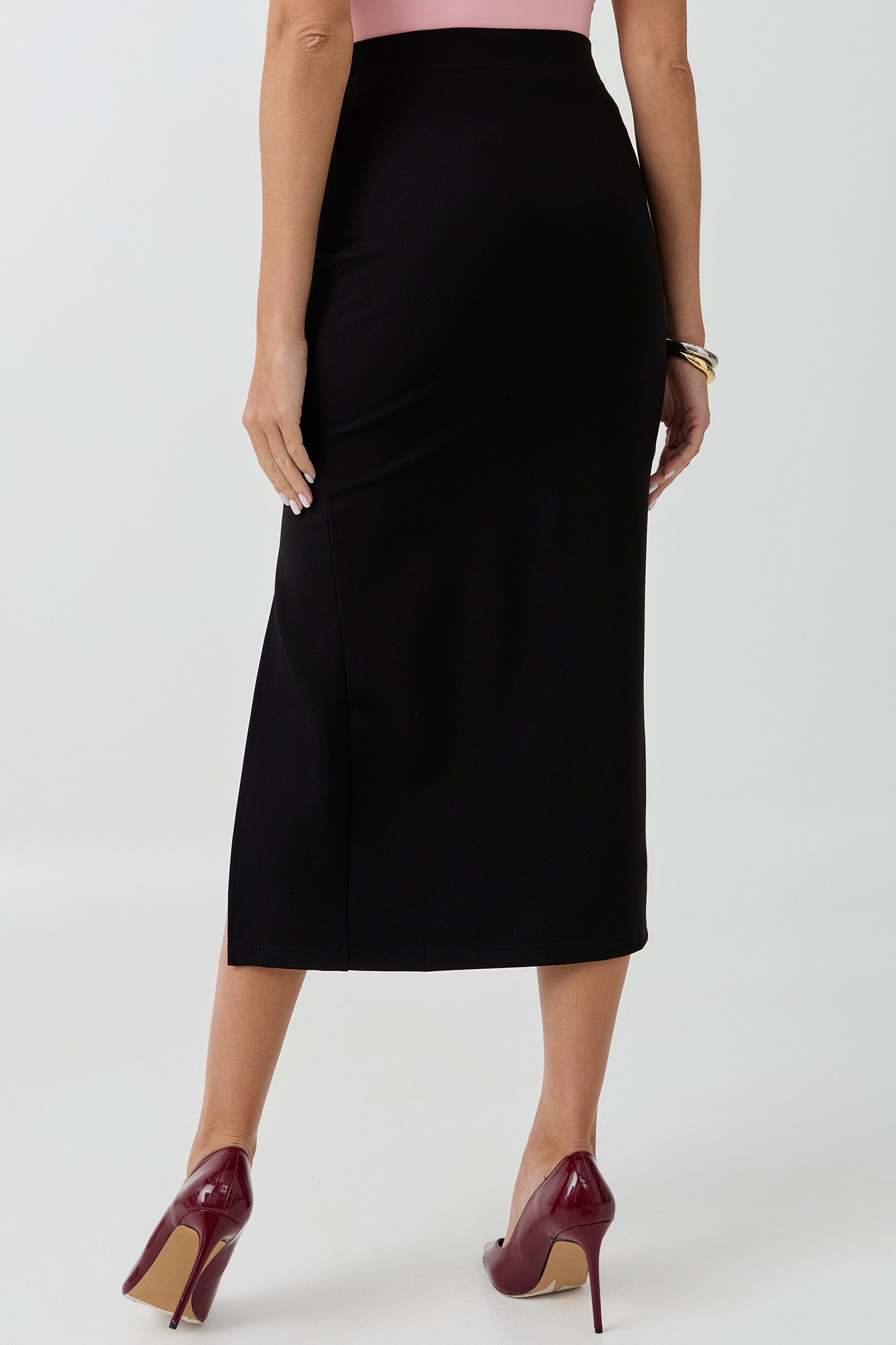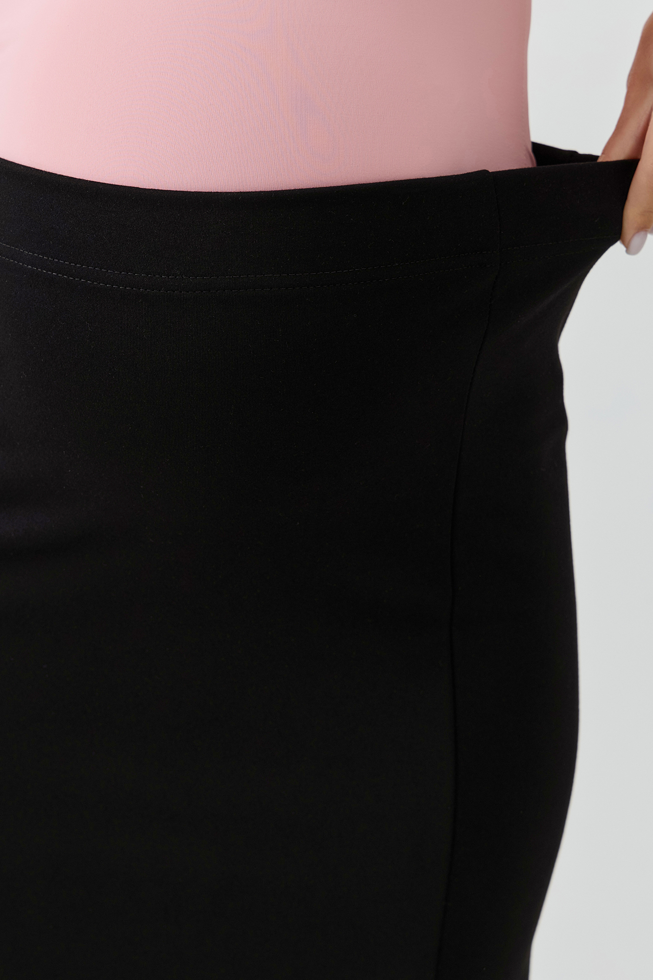 Юбка для беременных выполнена из трикотажной ткани джерси. Ткань приятна на ощупь и не вызывает дискомфорта, что особенно важно для чувствительной кожи во время беременности. Особый крой позволяет носить изделие на протяжении всей беременности. Эластичная юбка карандаш с завышенной талией мягко облегает и не сдавливает живот. Разрез сбоку изделия обеспечит свободу движений.