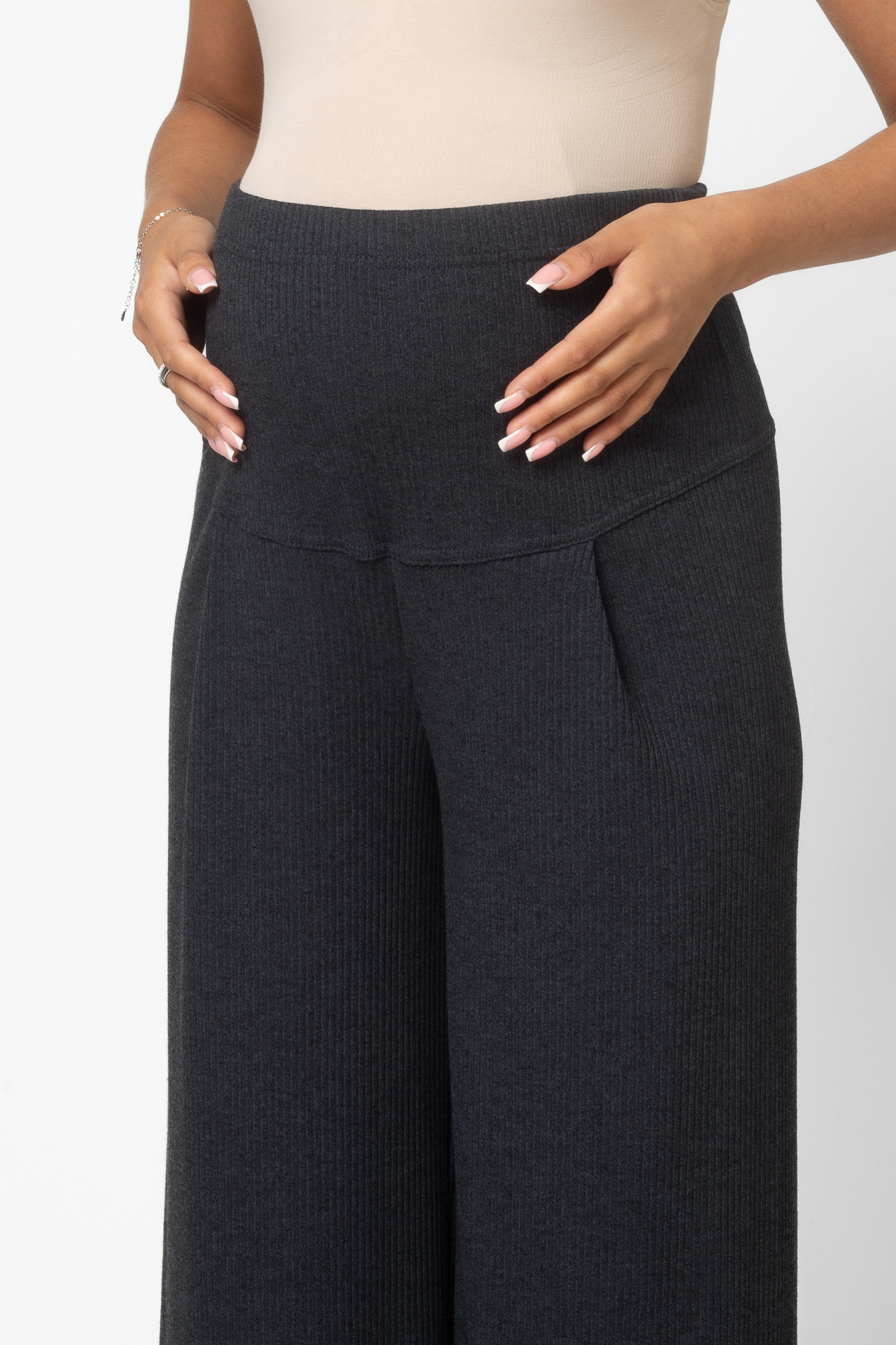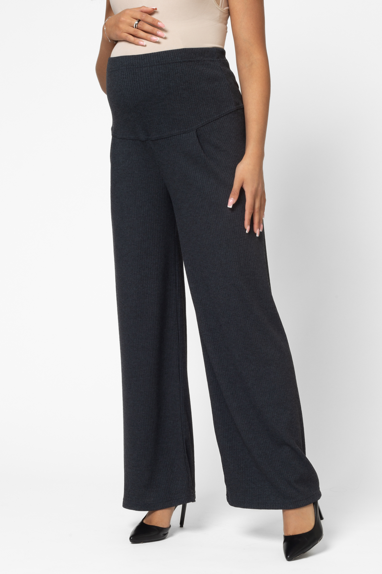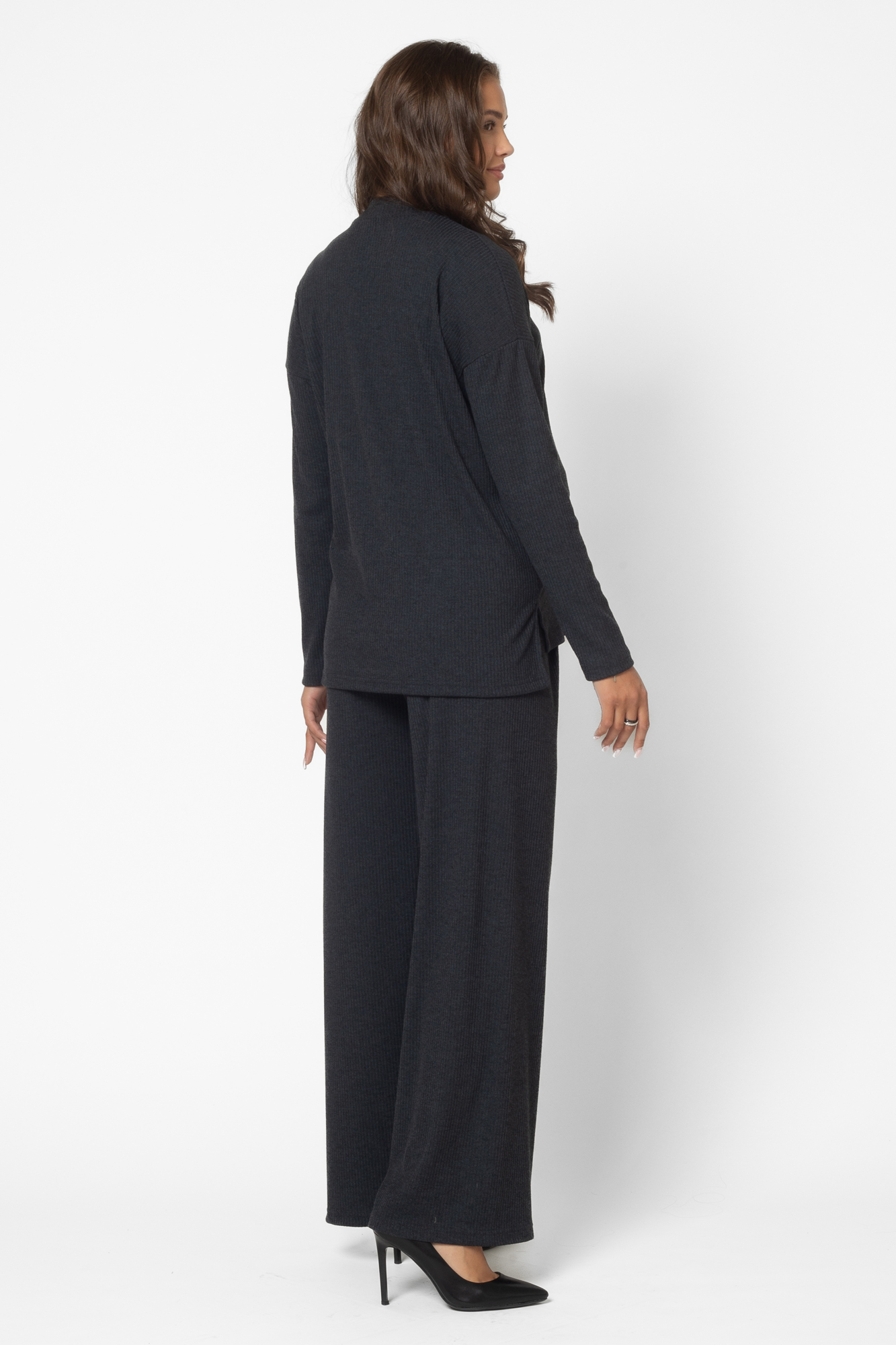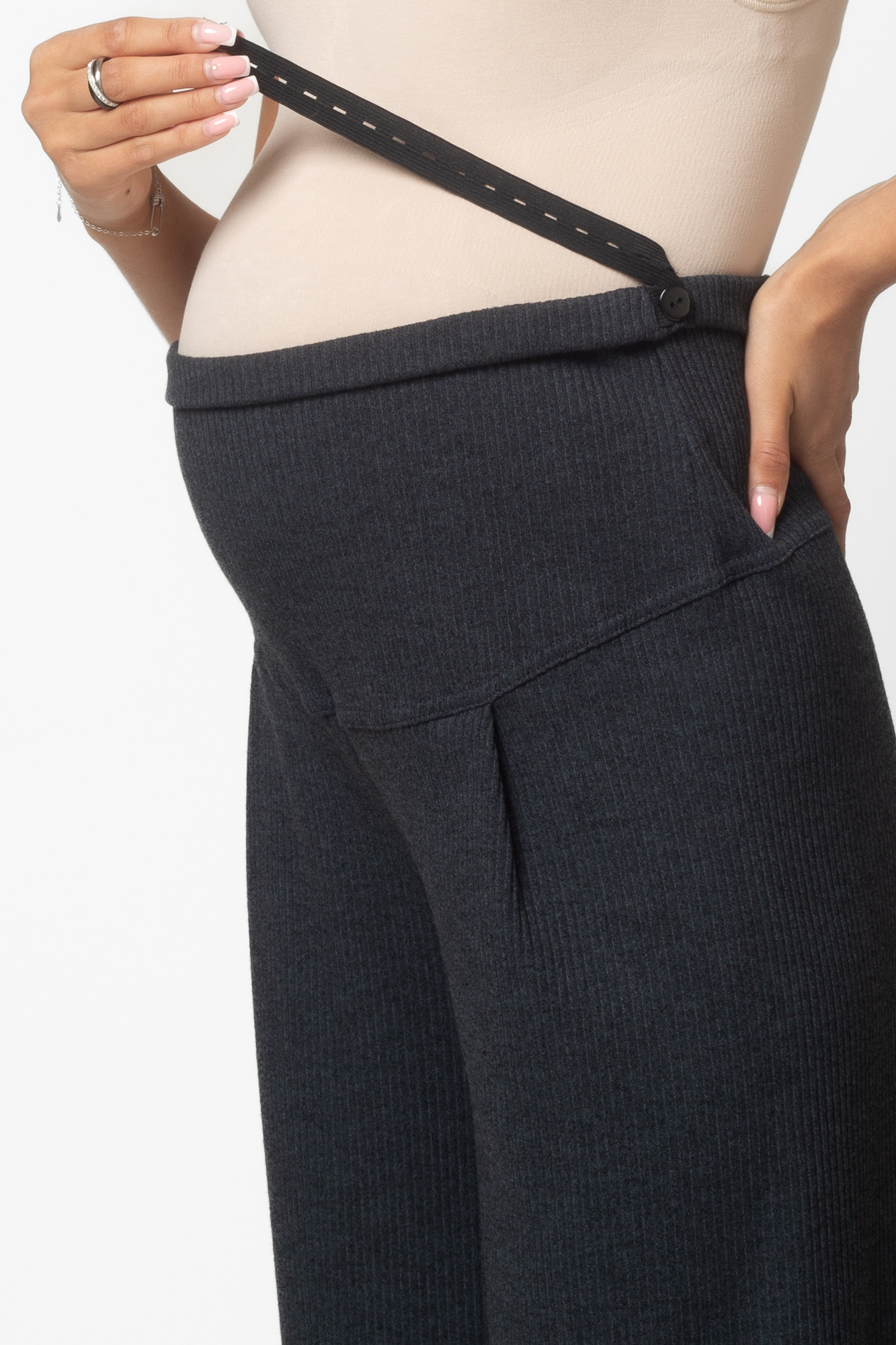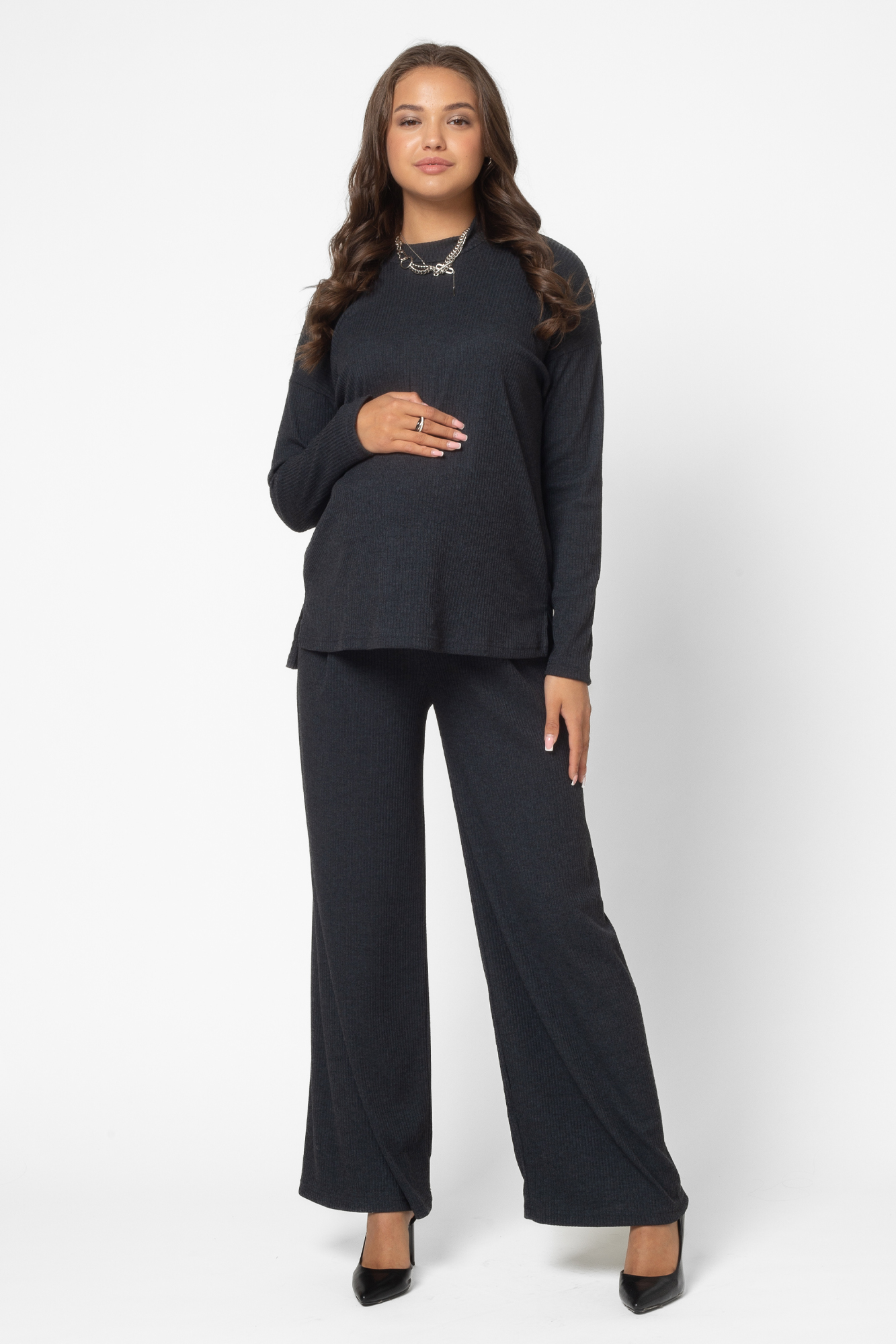 Оригинальный костюм в рубчик для беременных выполнен из высококачественного трикотажа-лапши. Костюм состоит из джемпера и брюк. Джемпер с воротником-стойкой, длинным рукавом, заниженной линией плеча, разрезами по бокам изделия. Брюки широкого кроя с эластичной высокой вставкой-бандажом рассчитаны на весь период беременности. Объем регулируется с помощью перфорированной резинки, перестегивающейся на пуговицу. Идеальное сочетание стиля и комфорта!