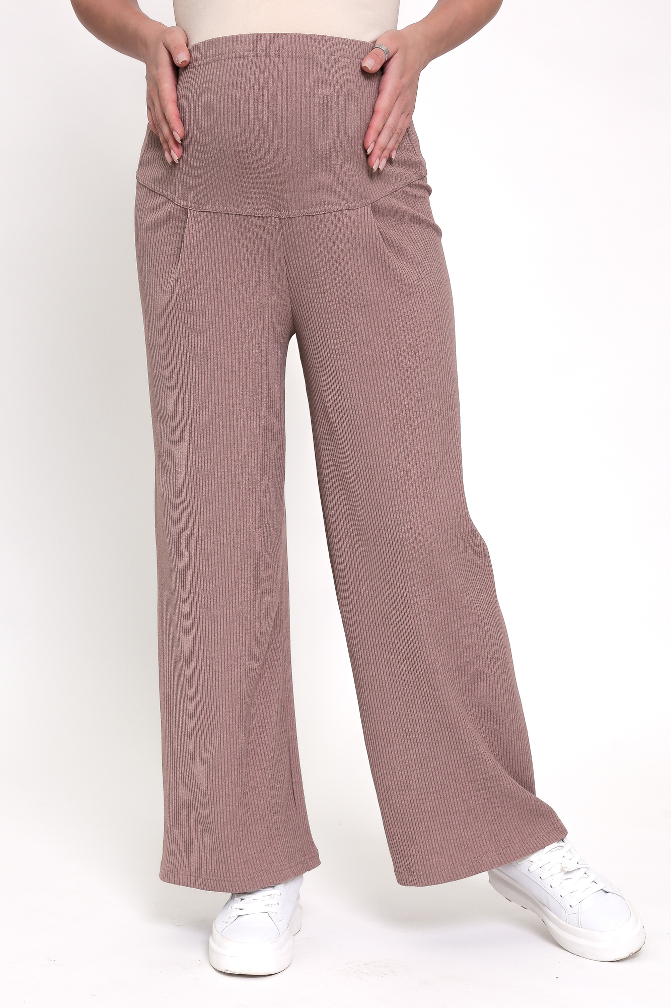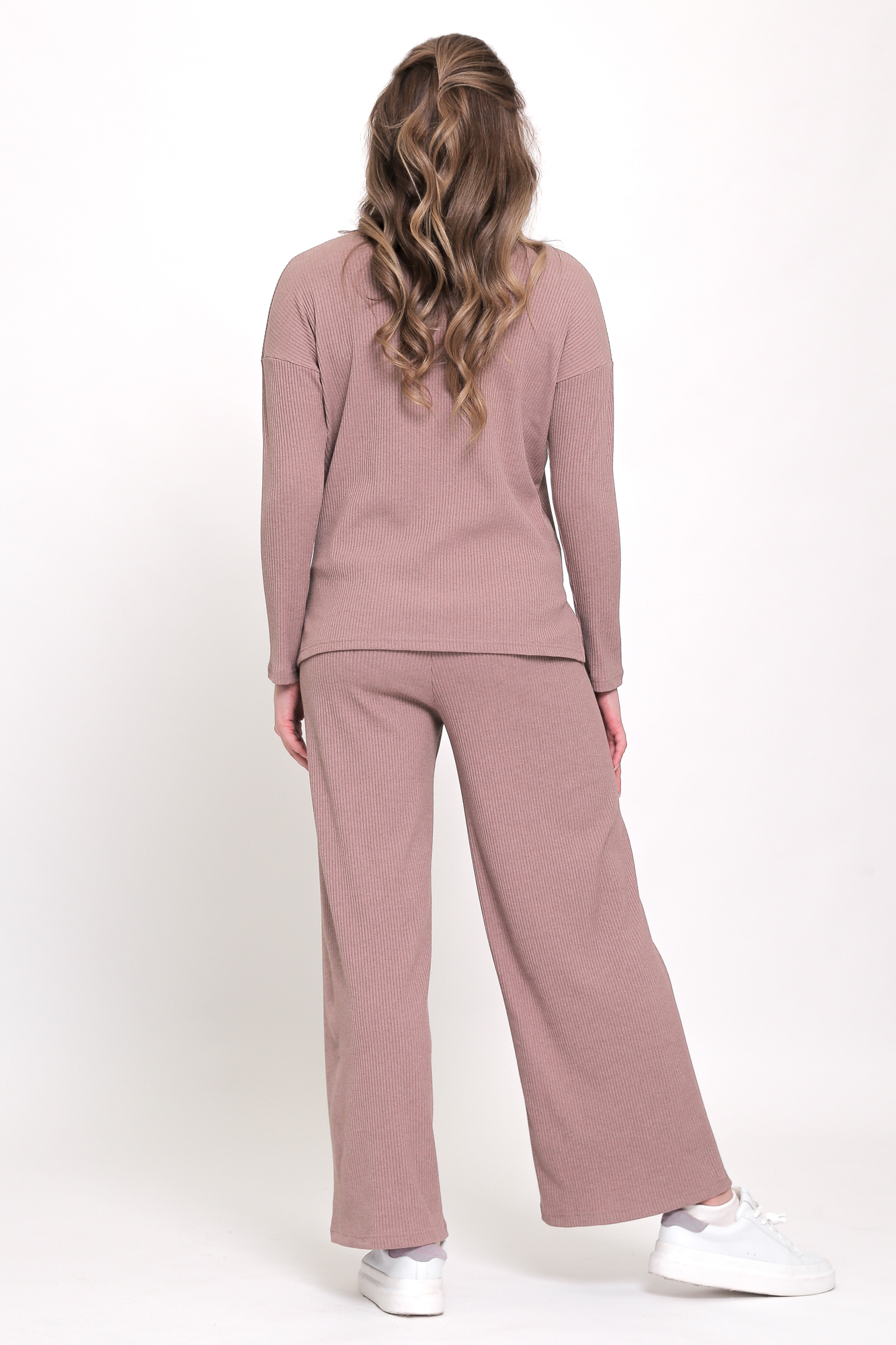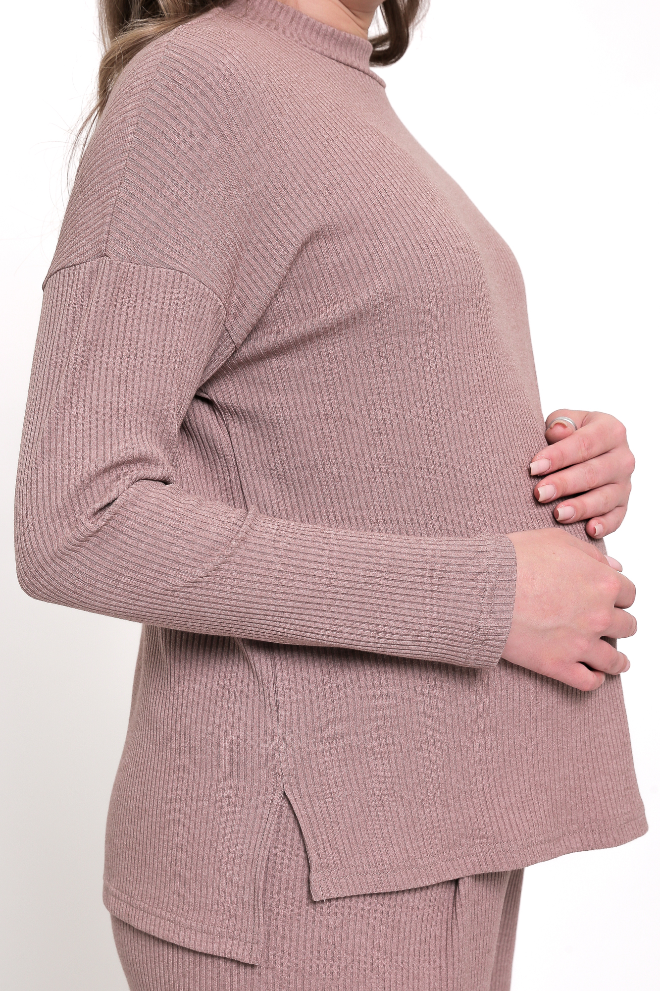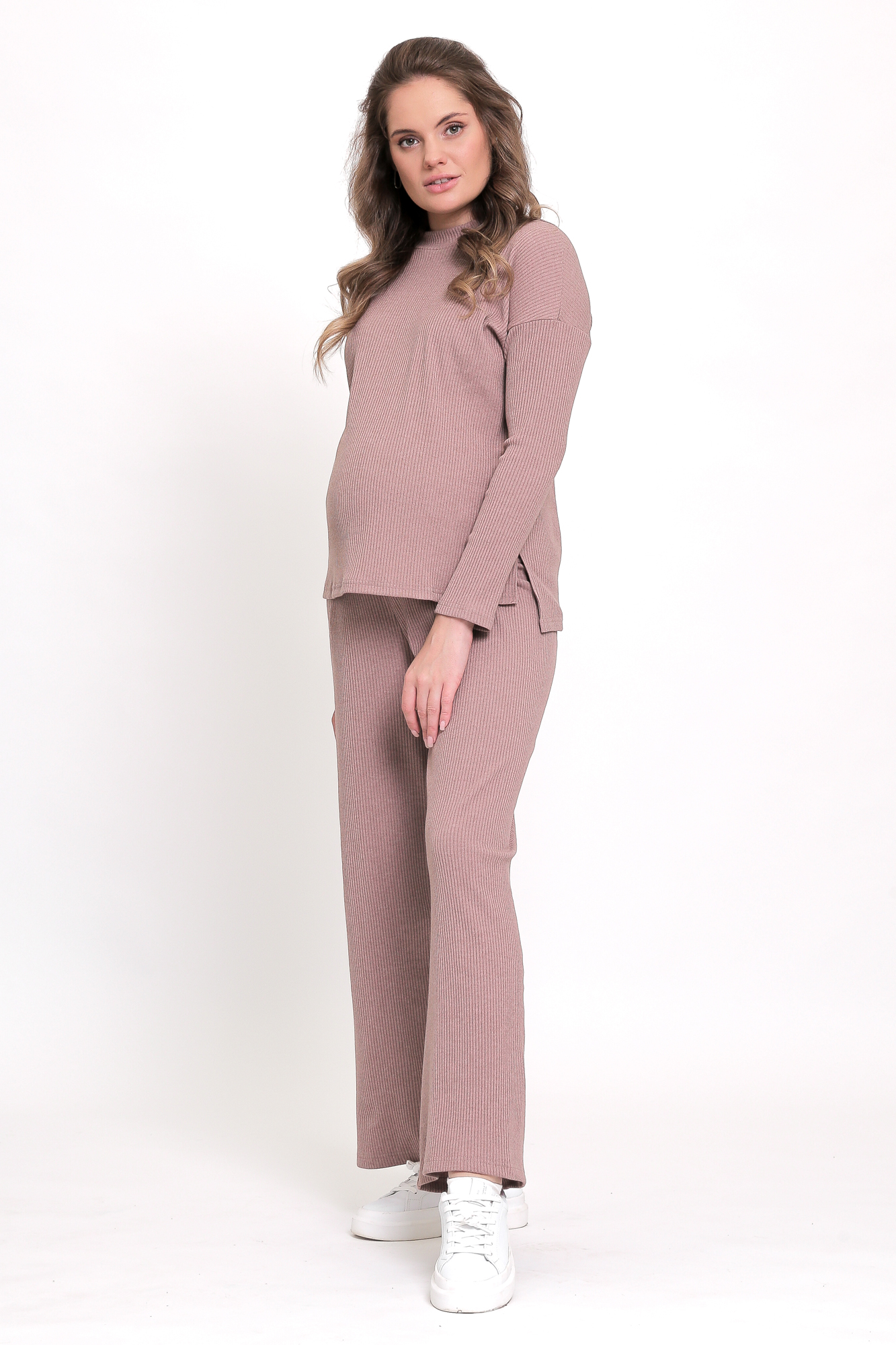 Оригинальный костюм в рубчик для беременных выполнен из высококачественного трикотажа-лапши. Костюм состоит из джемпера и брюк. Джемпер с воротником-стойкой, длинным рукавом, заниженной линией плеча, разрезами по бокам изделия. Брюки широкого кроя с эластичной высокой вставкой-бандажом рассчитаны на весь период беременности. Объем регулируется с помощью перфорированной резинки, перестегивающейся на пуговицу. Идеальное сочетание стиля и комфорта!