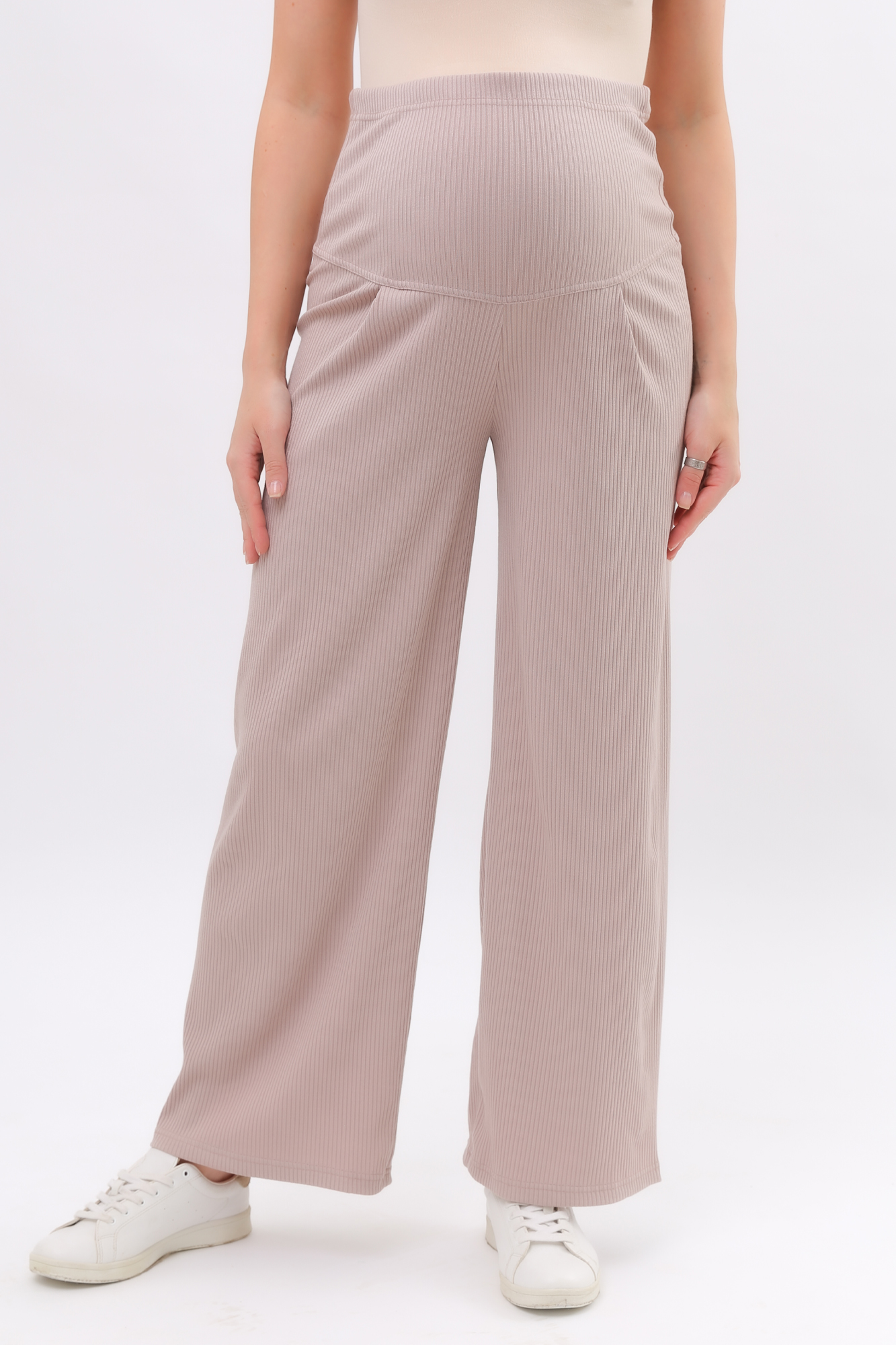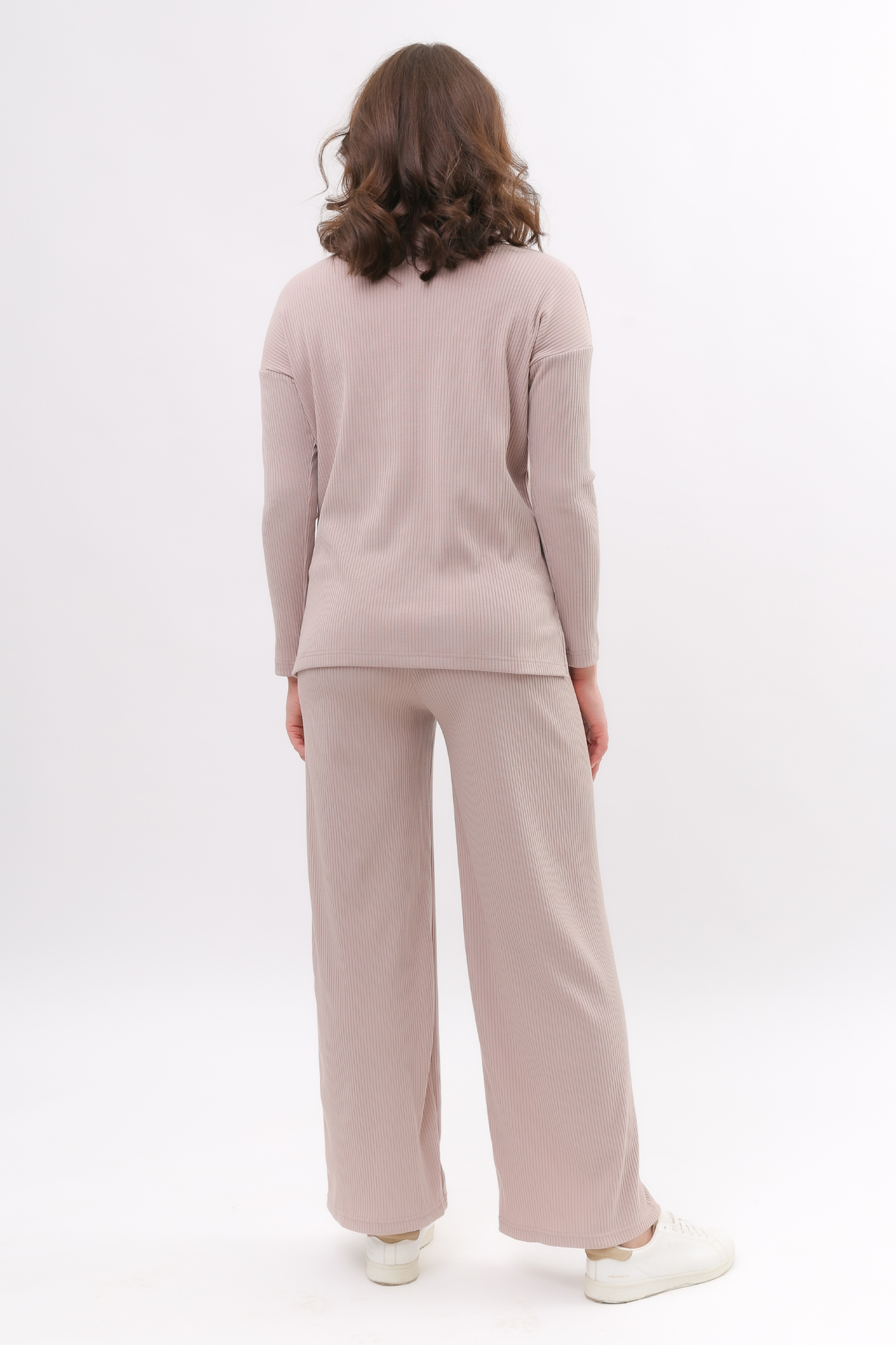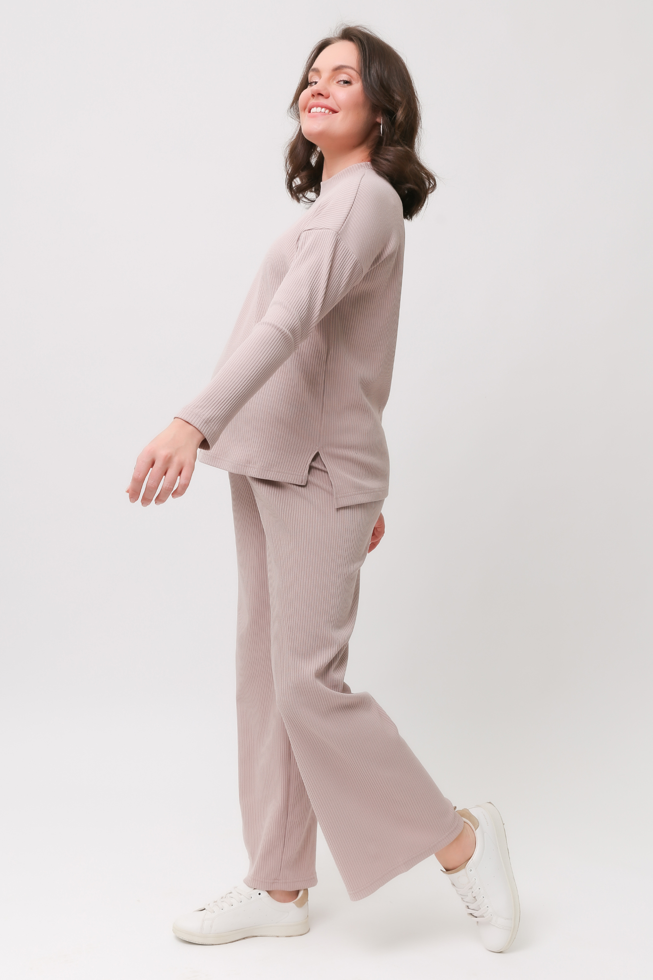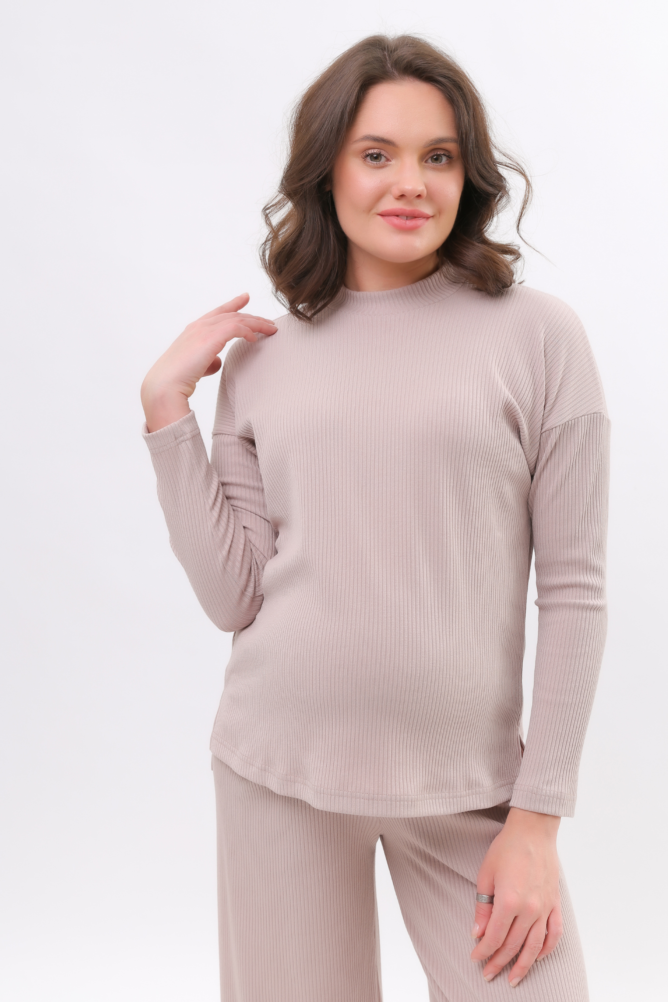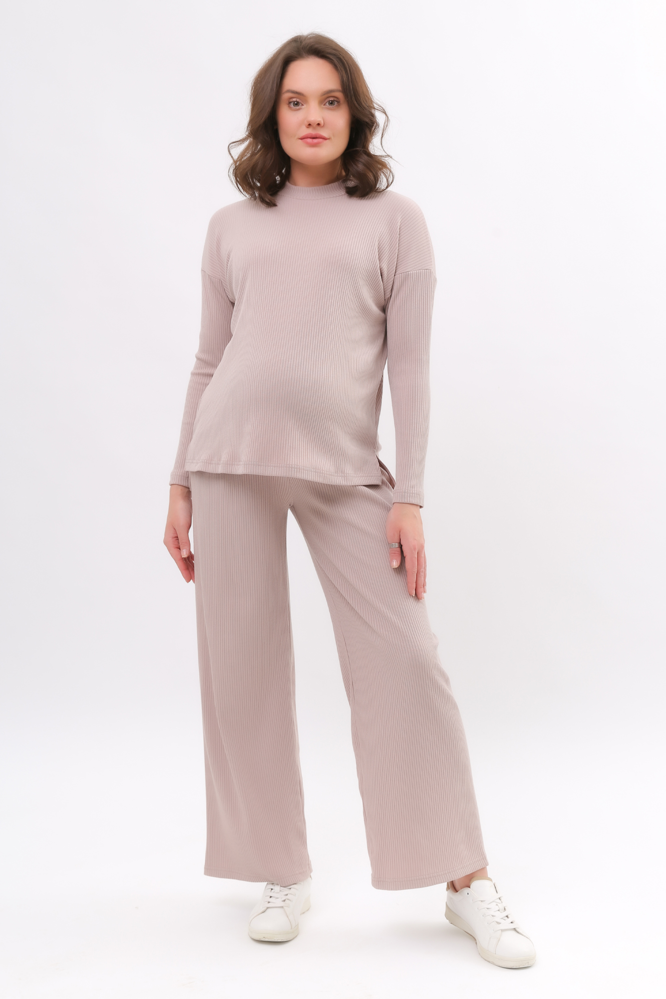 Оригинальный костюм в рубчик для беременных выполнен из высококачественного трикотажа-лапши. Костюм состоит из джемпера и брюк. Джемпер с воротником-стойкой, длинным рукавом, заниженной линией плеча, разрезами по бокам изделия. Брюки широкого кроя с эластичной высокой вставкой-бандажом рассчитаны на весь период беременности. Объем регулируется с помощью перфорированной резинки, перестегивающейся на пуговицу. Идеальное сочетание стиля и комфорта!