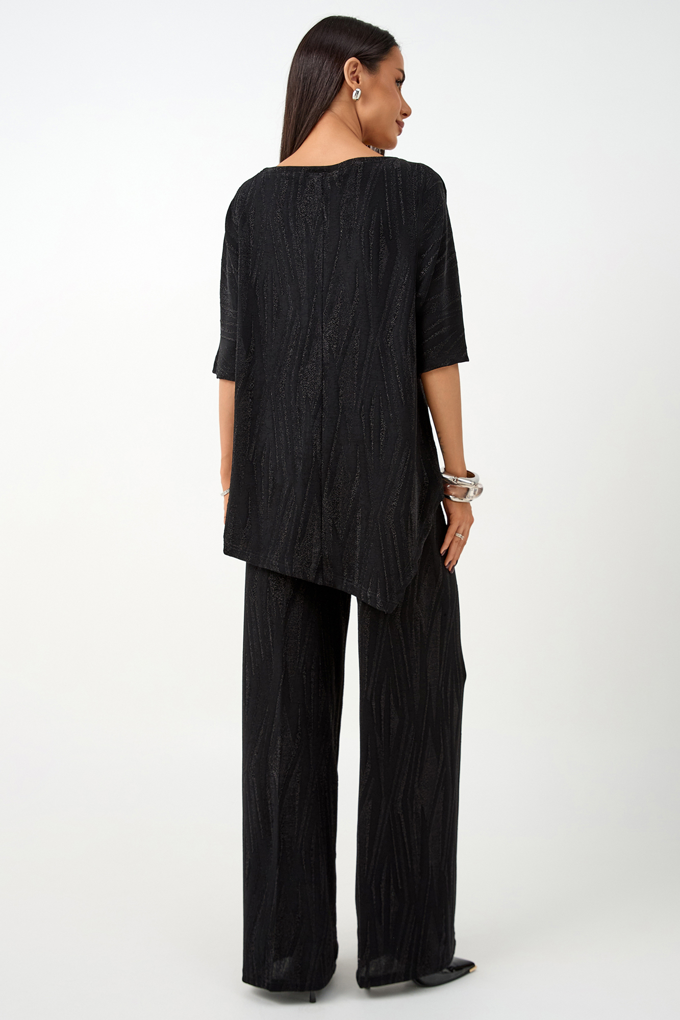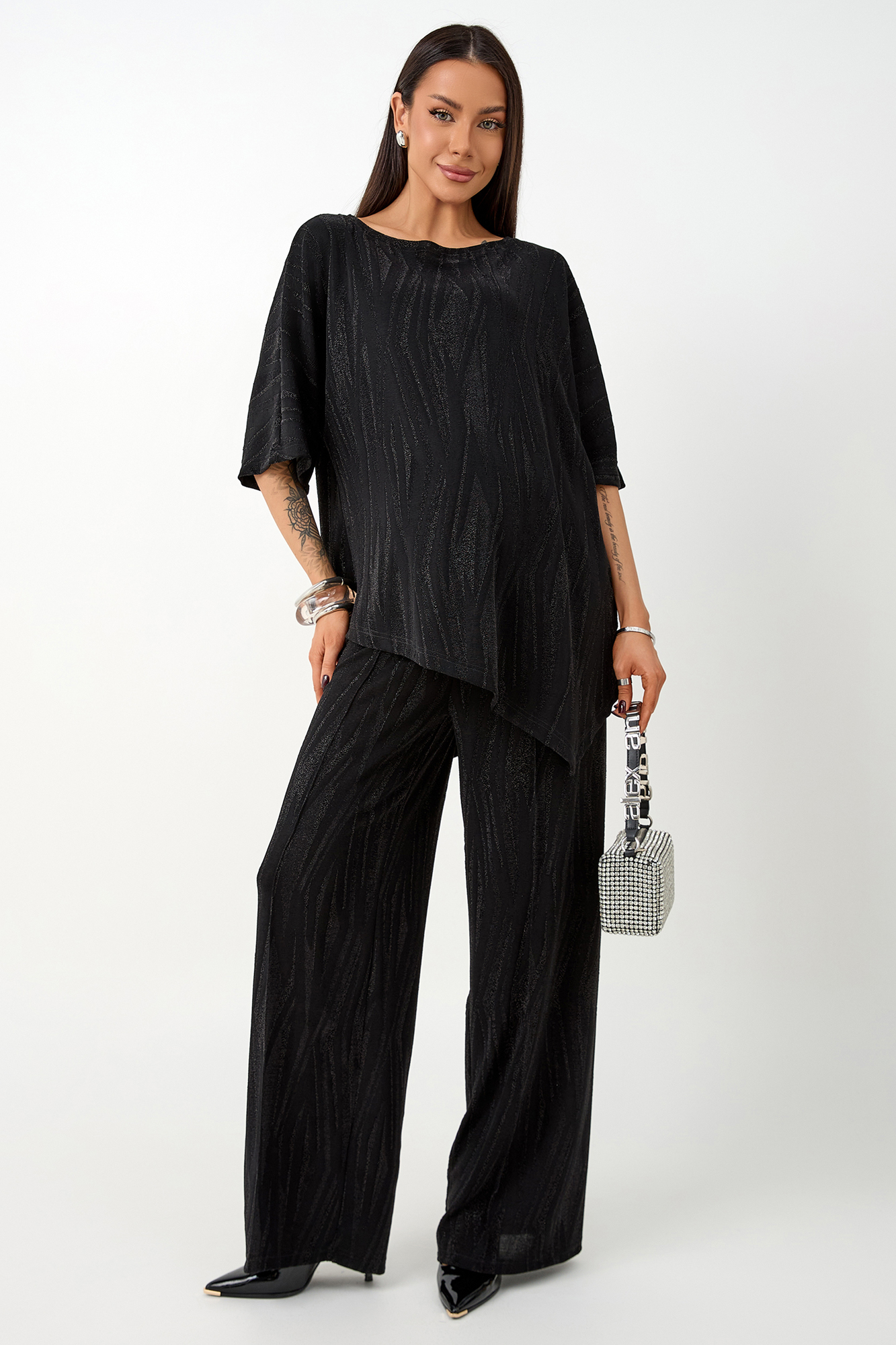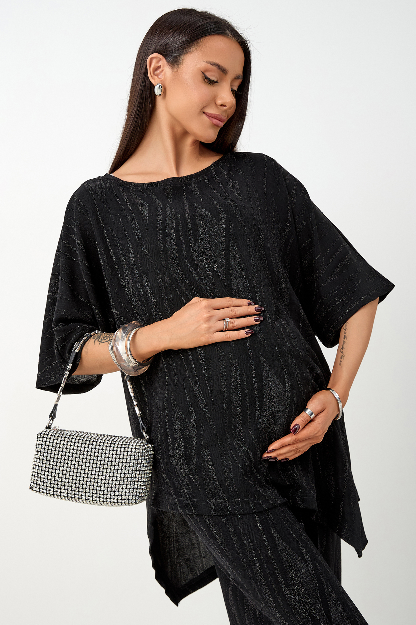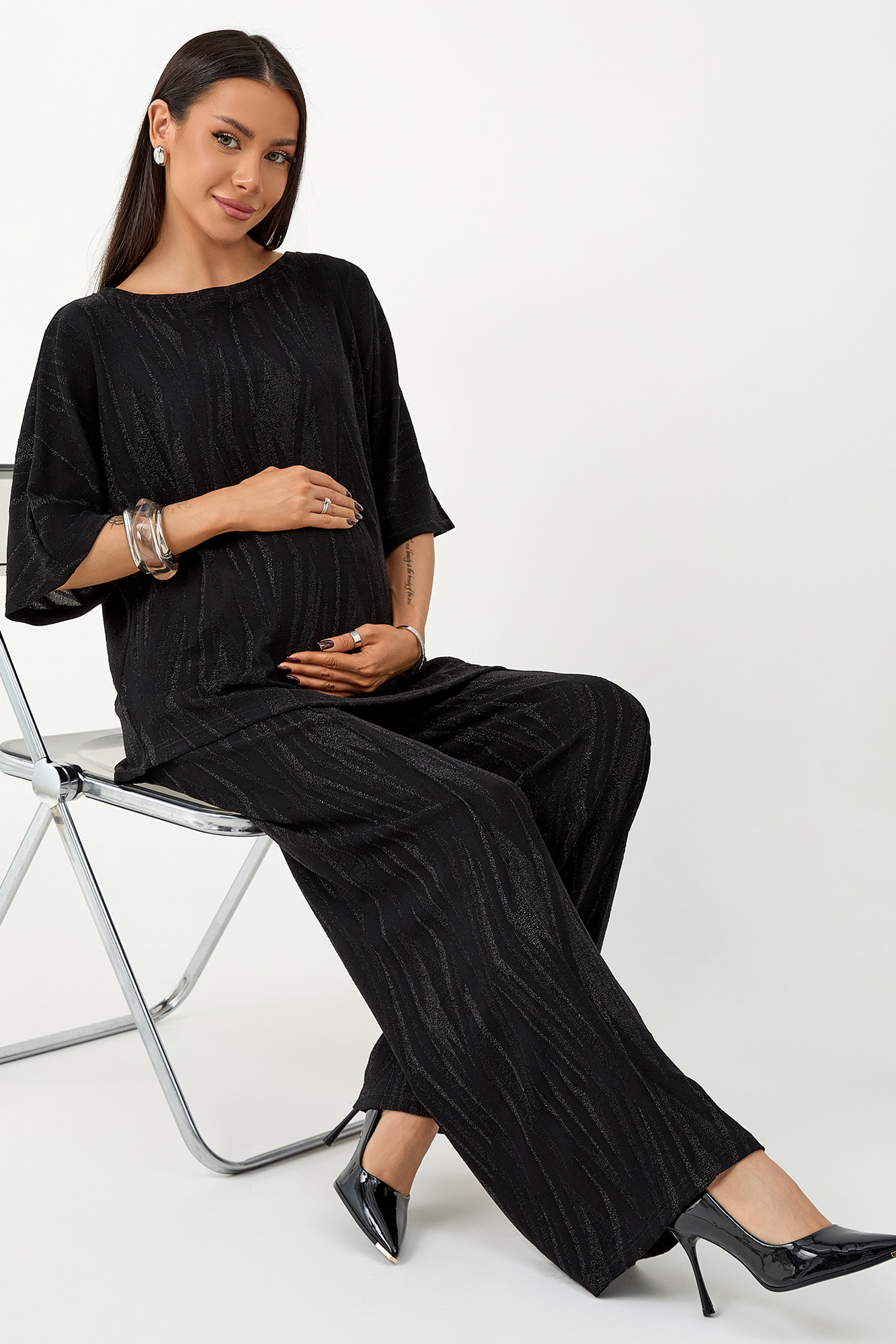 Нарядный костюм для беременных изготовлен из фактурного трикотажа с люрексом. Ткань приятна на ощупь, комфортна в носке и отлично держит форму. Костюм станет идеальным выбором для будущих мам, ценящих стиль и комфорт.