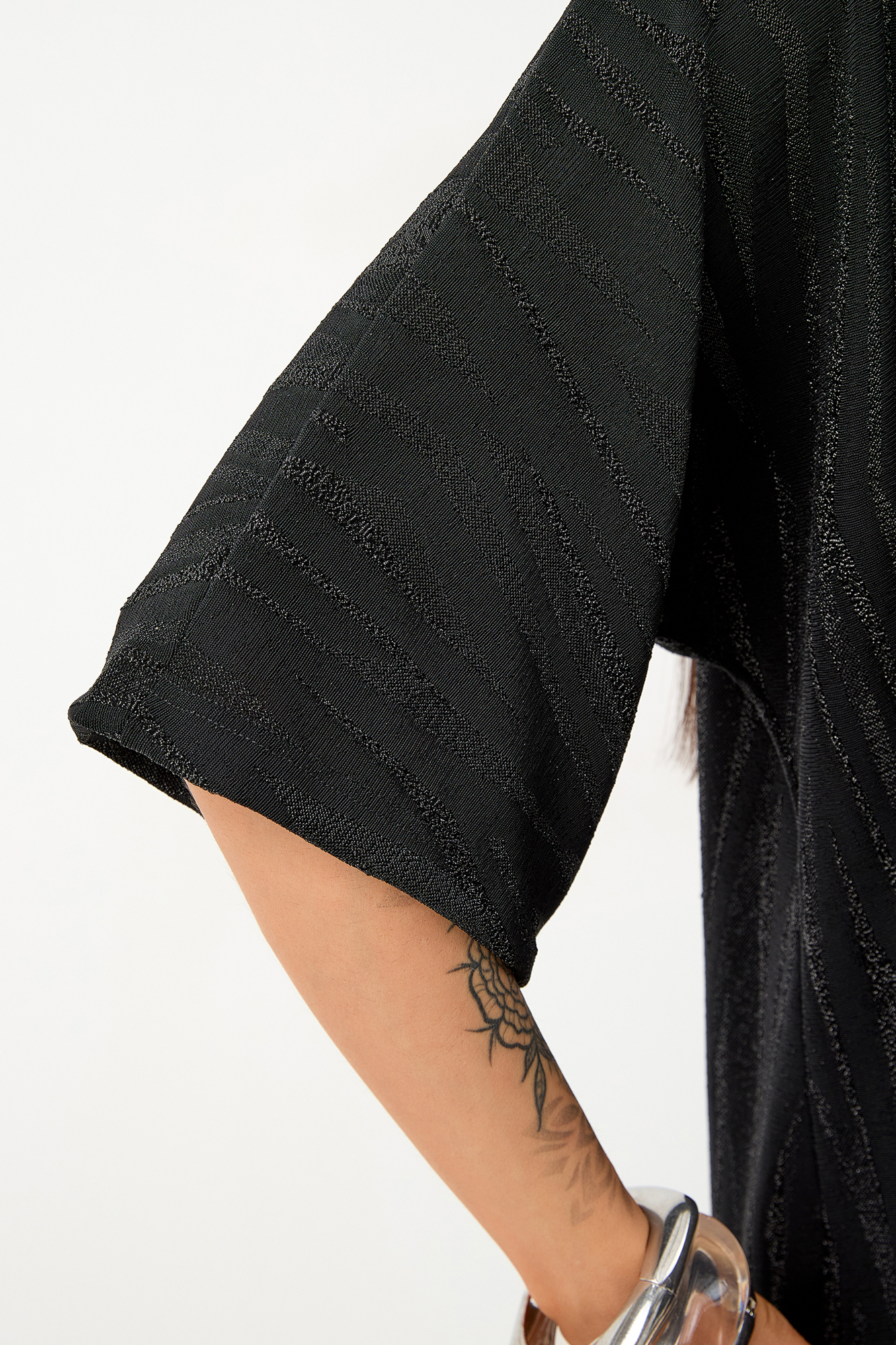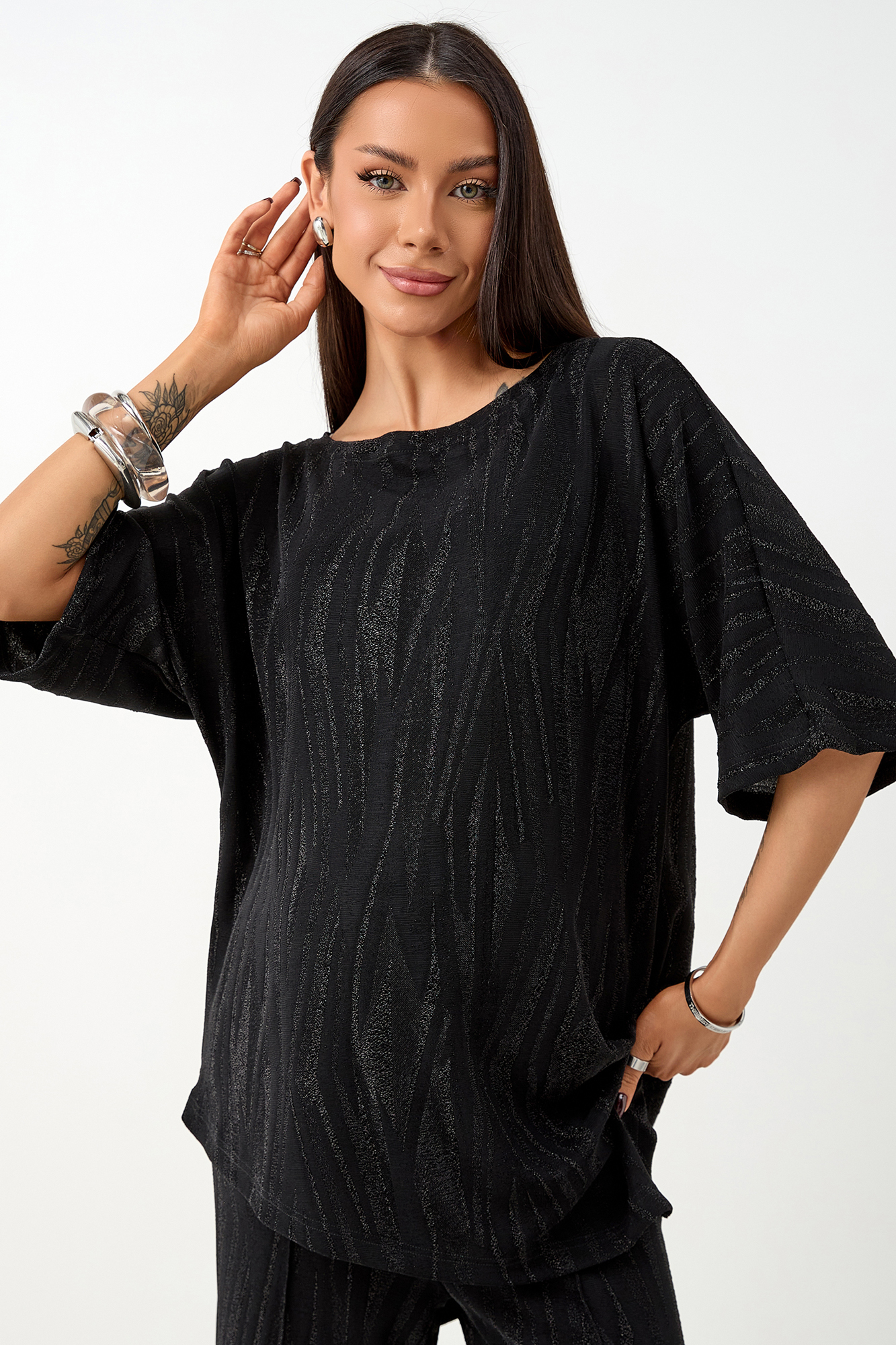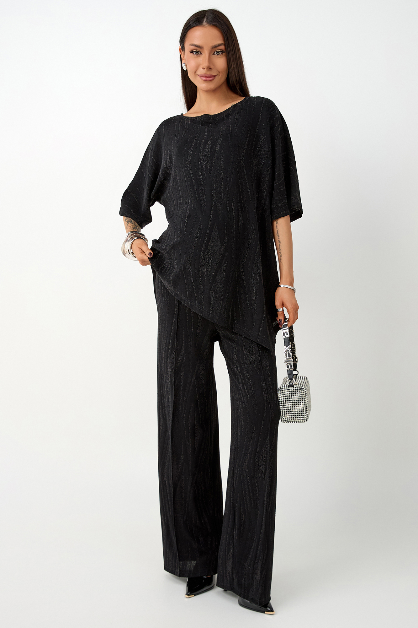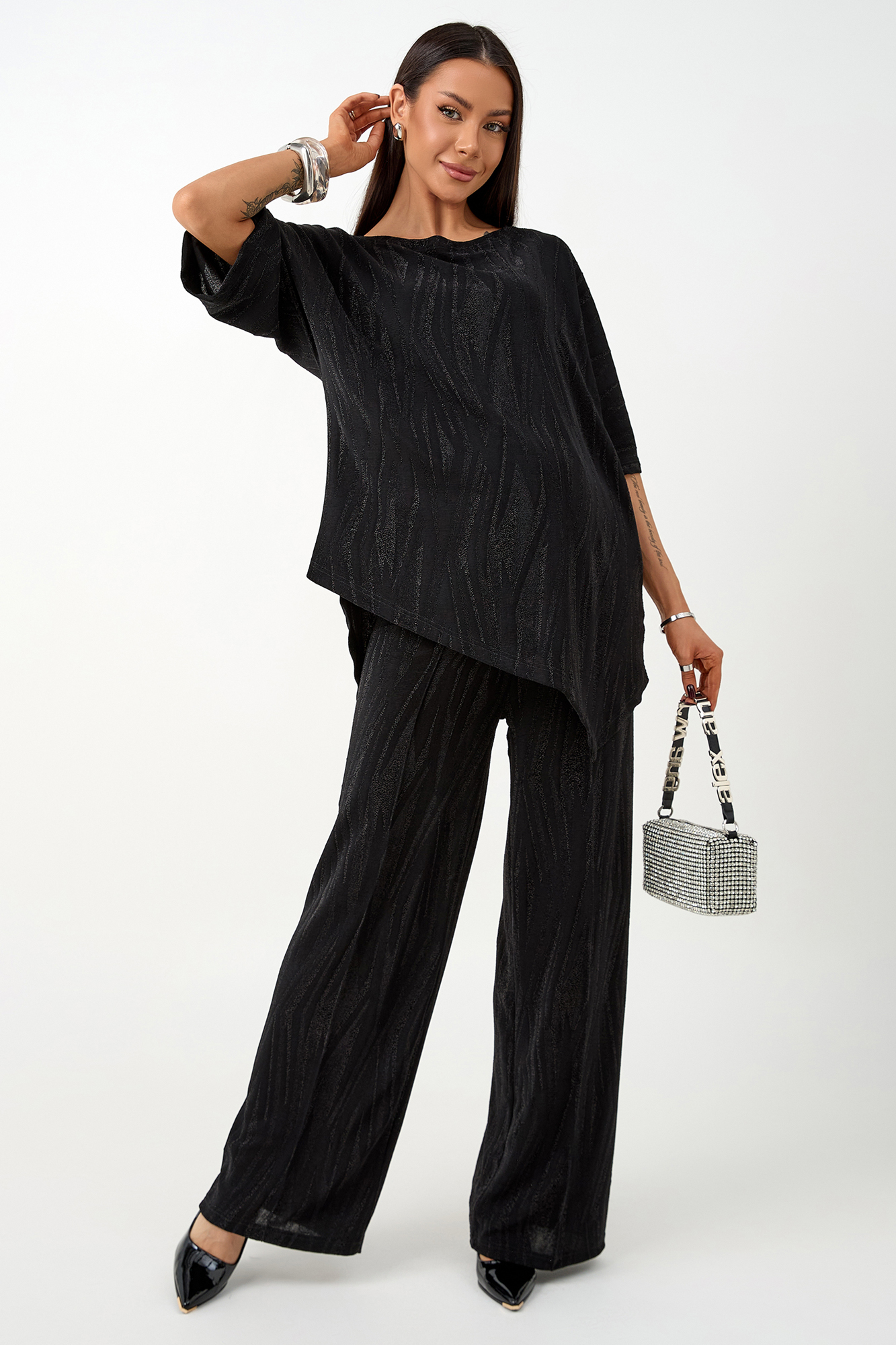 Нарядный костюм для беременных изготовлен из фактурного трикотажа с люрексом. Ткань приятна на ощупь, комфортна в носке и отлично держит форму. Костюм станет идеальным выбором для будущих мам, ценящих стиль и комфорт.