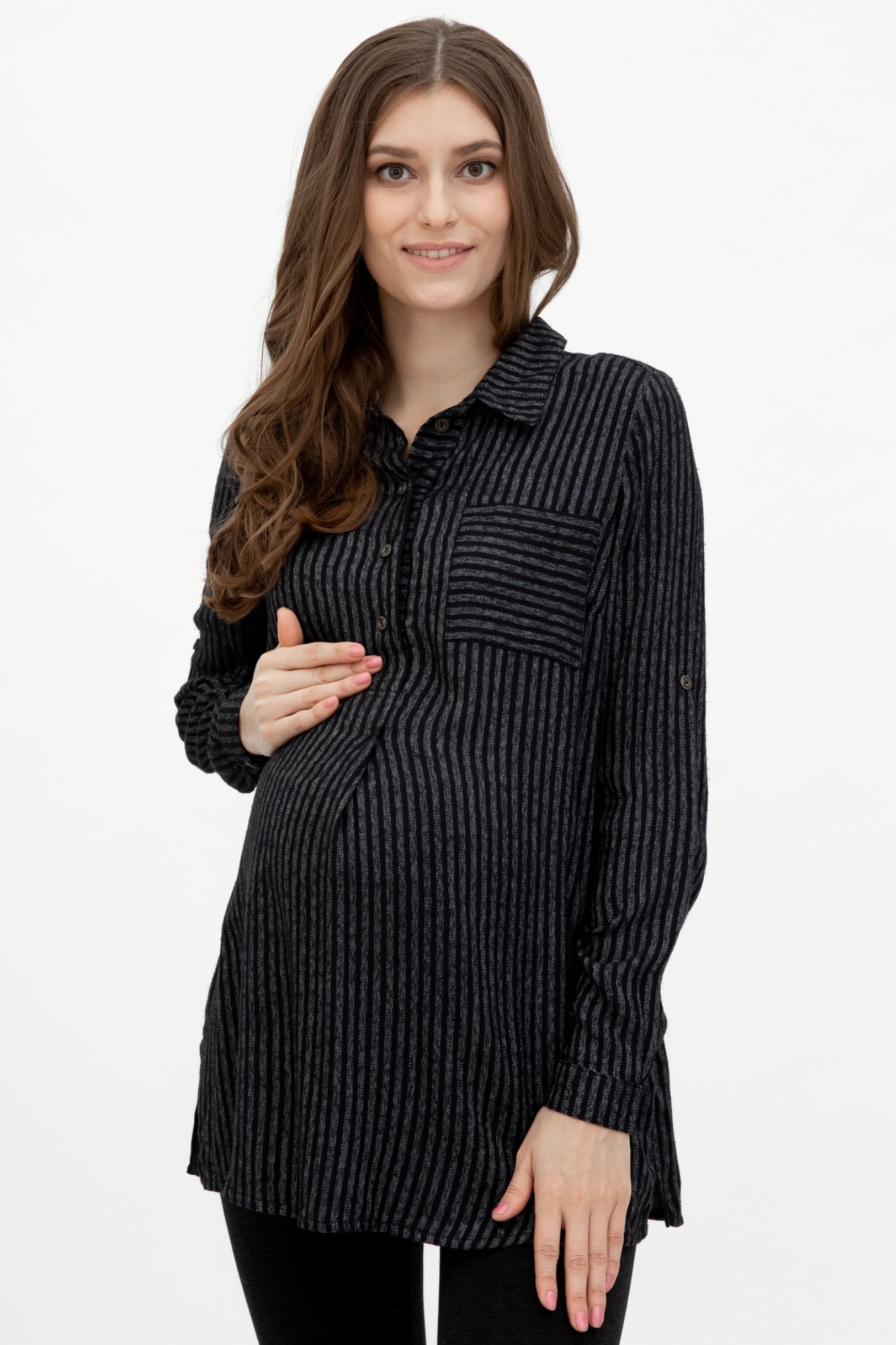 Удлиненная блузка свободного кроя для беременных. Впереди планка на пуговицах, накладной карман на груди, отложной воротник, разрезы по бокам изделия. Длинный рукав с манжетой, подворачивается и фиксируется хлястиком. Модель сочетается как с классическими брюками, юбками, так и с повседневными джинсами.