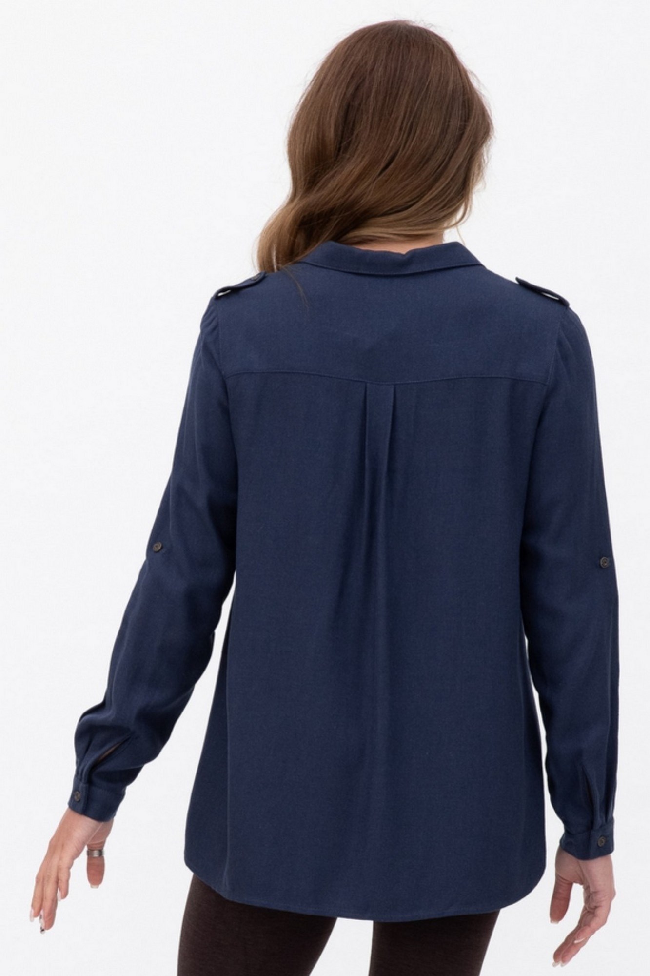 Универсальная рубашка свободного кроя. Длинные рукава подворачиваются и фиксируются застежкой на пуговицу. На модели накладной карман на груди. Может быть использована в период кормления благодаря застежке на пуговицы. В ней вы будете чувствовать себя комфортно на всем протяжении беременности и после нее.
